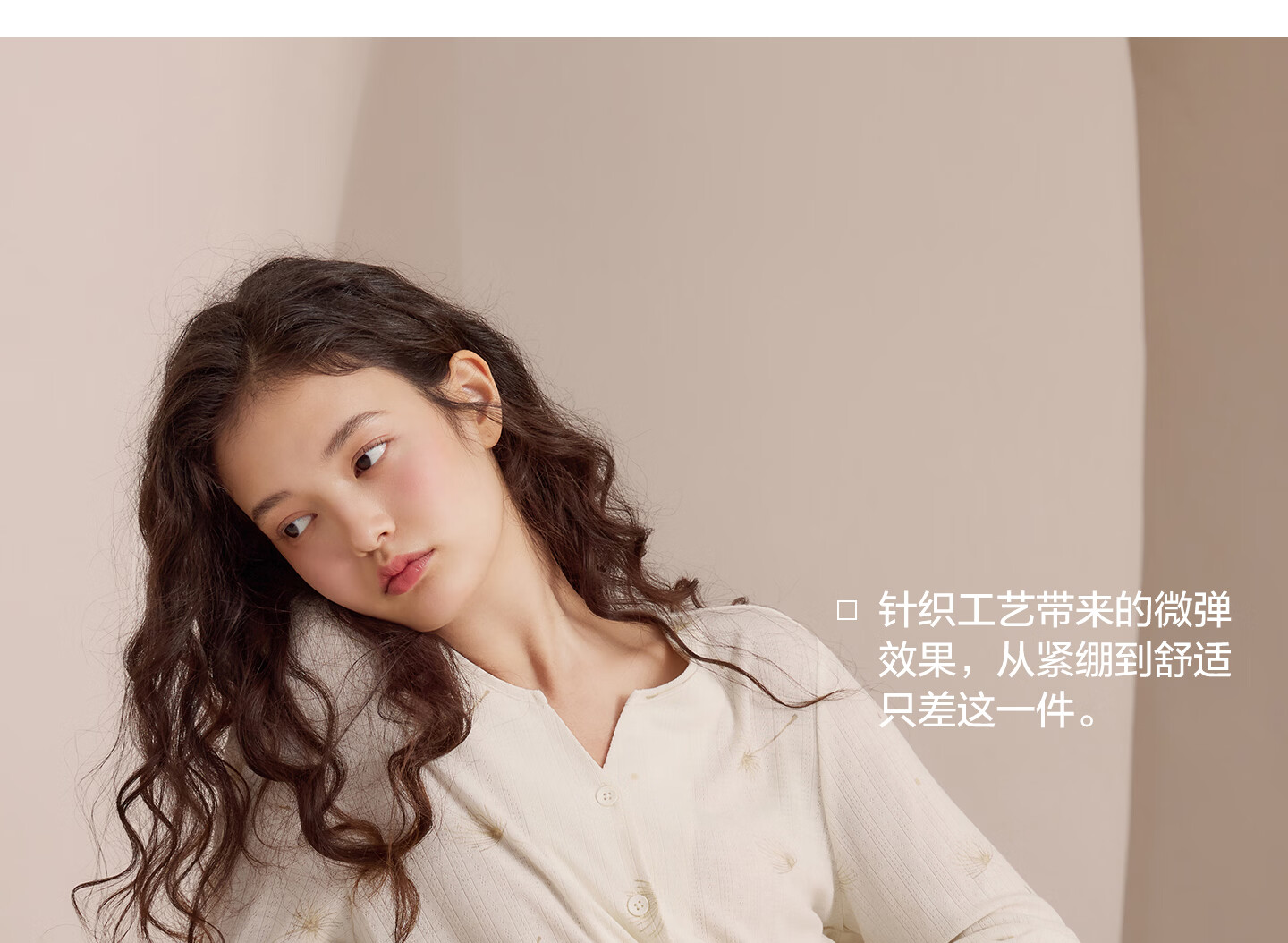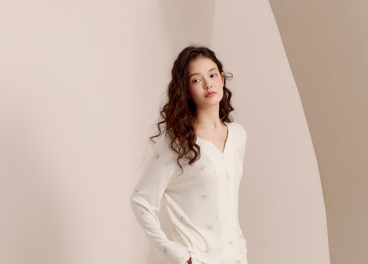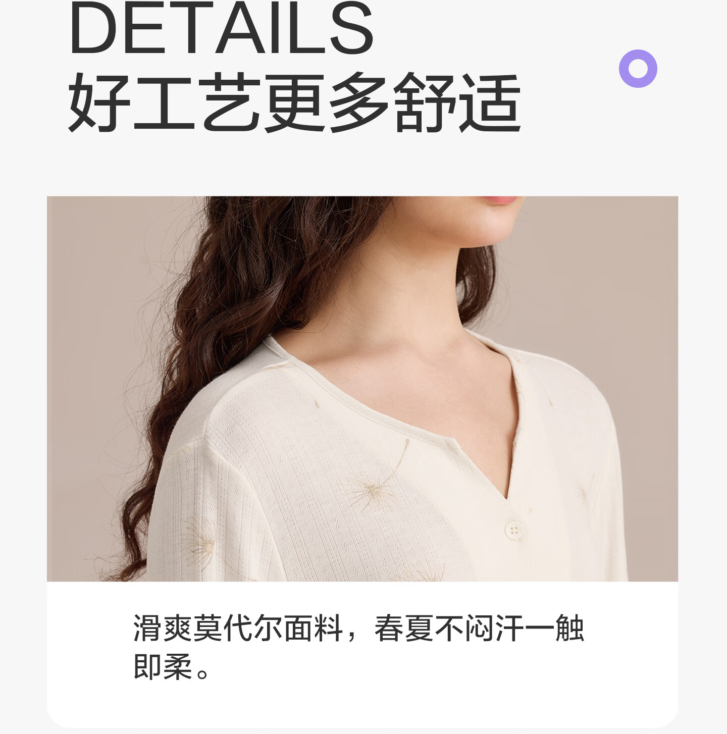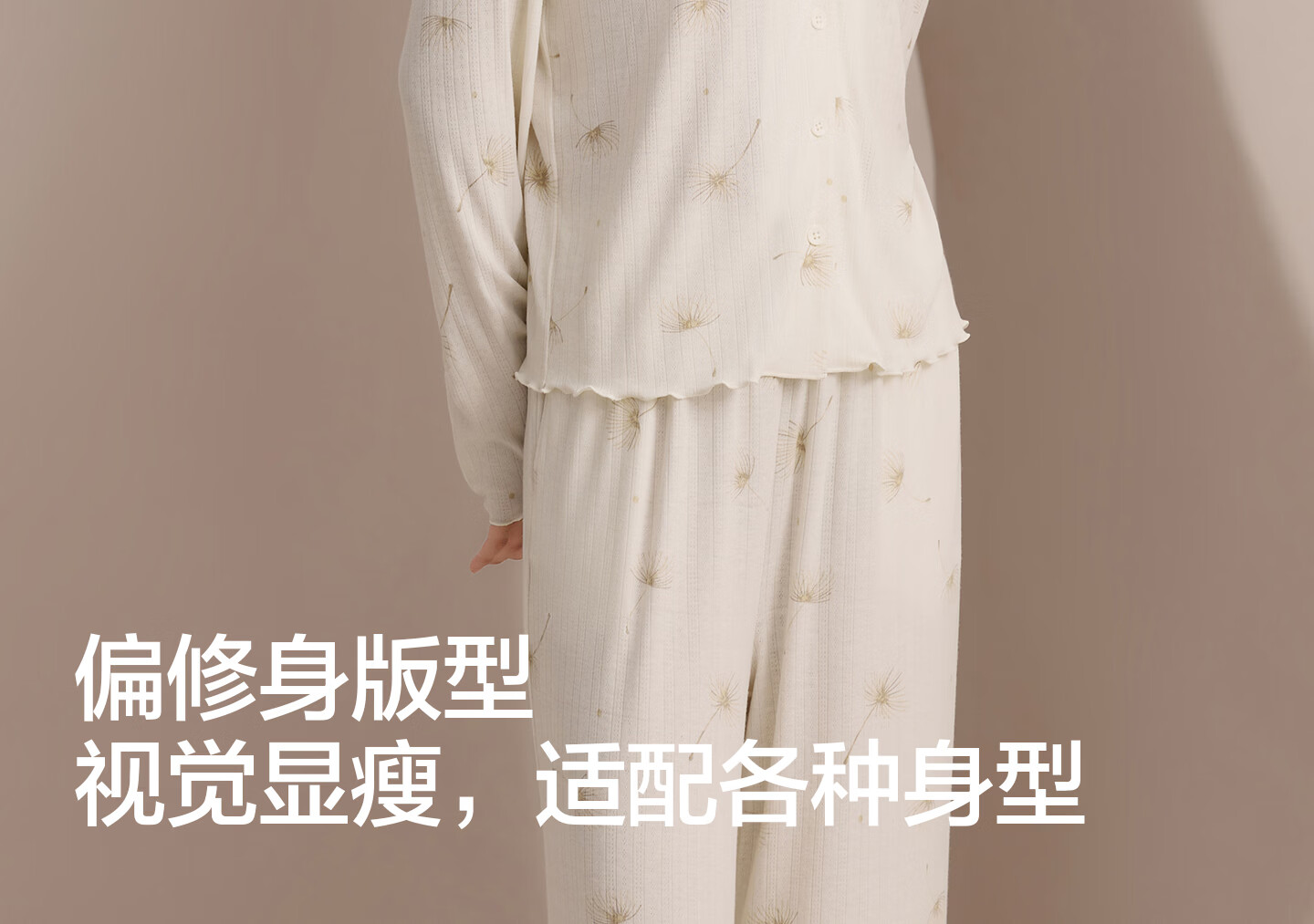 红豆(Hodo)女士长袖睡衣春夏香氛疗愈V领莫代尔印花新款A类可外穿休闲家居服 米糖色 L (165)