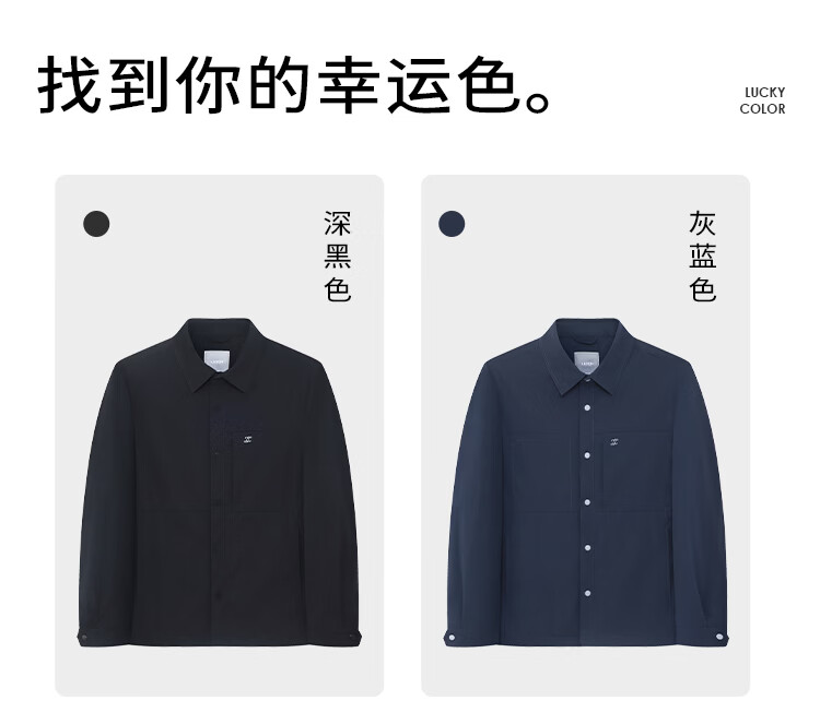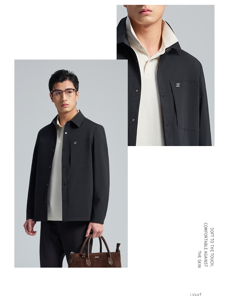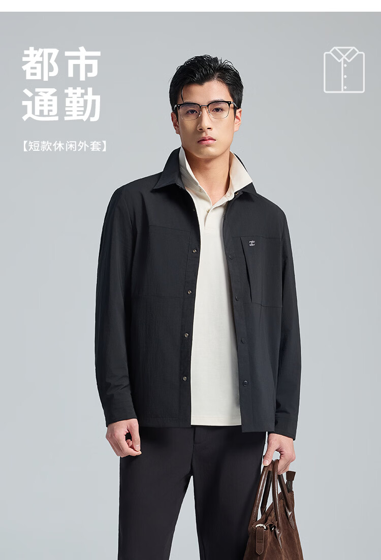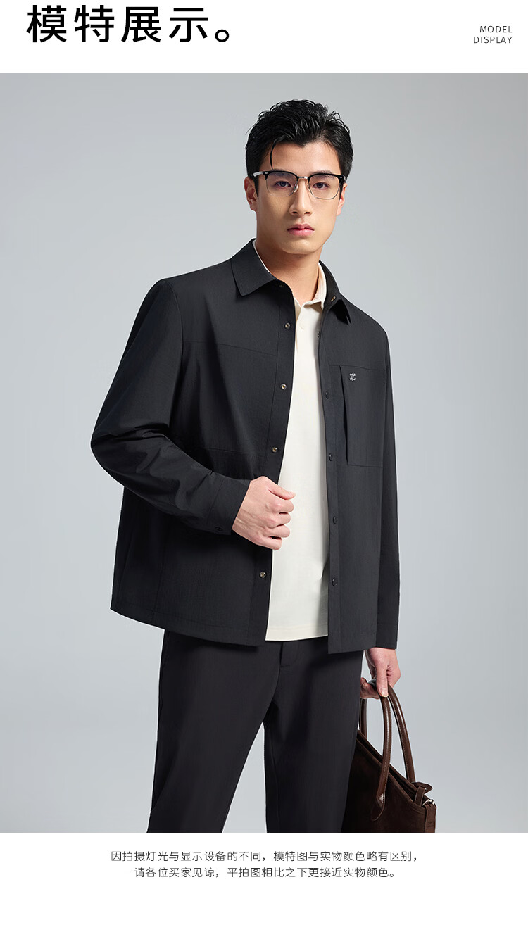 莱克斯顿外套男春夏新款衬衫式夹克外套商务休闲宽松翻领上衣男装 深黑 S