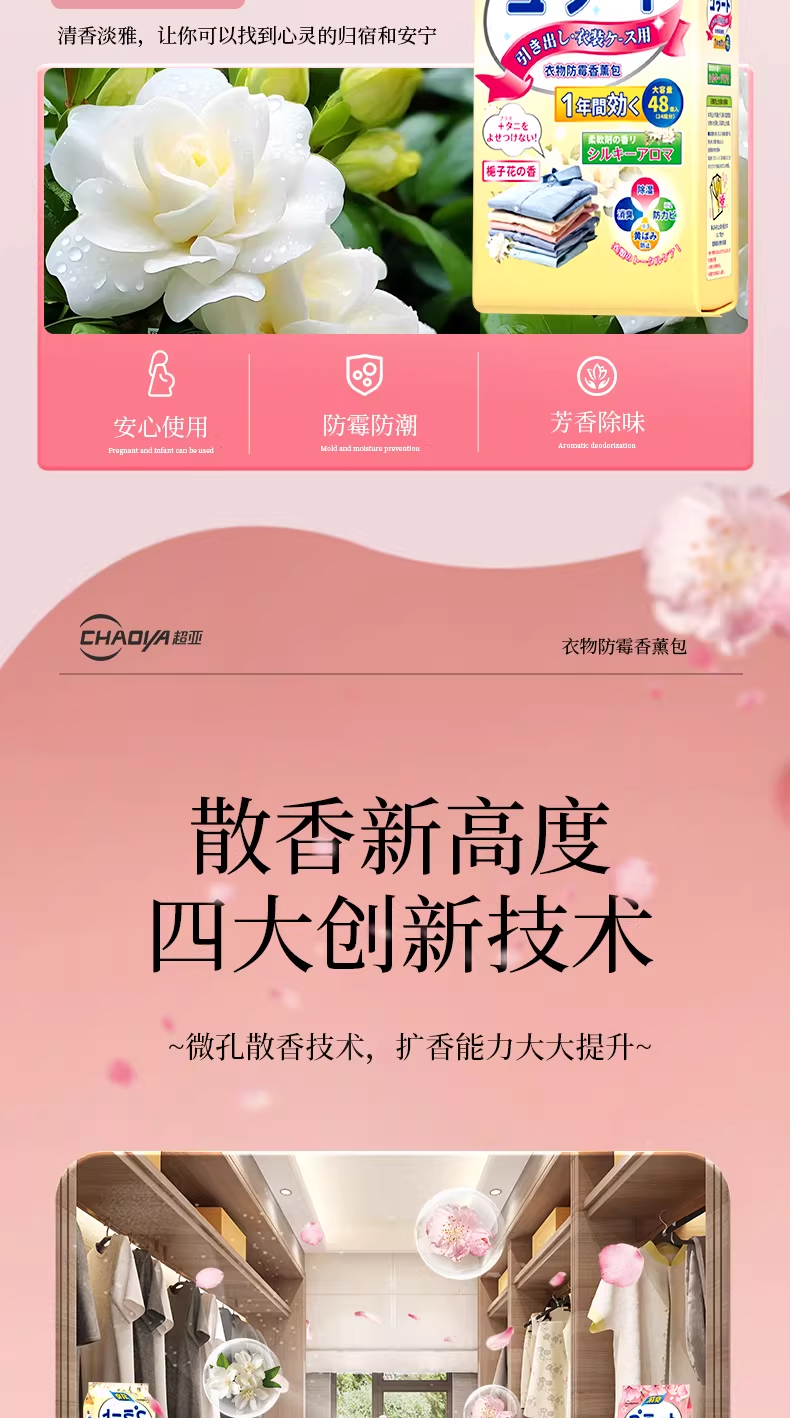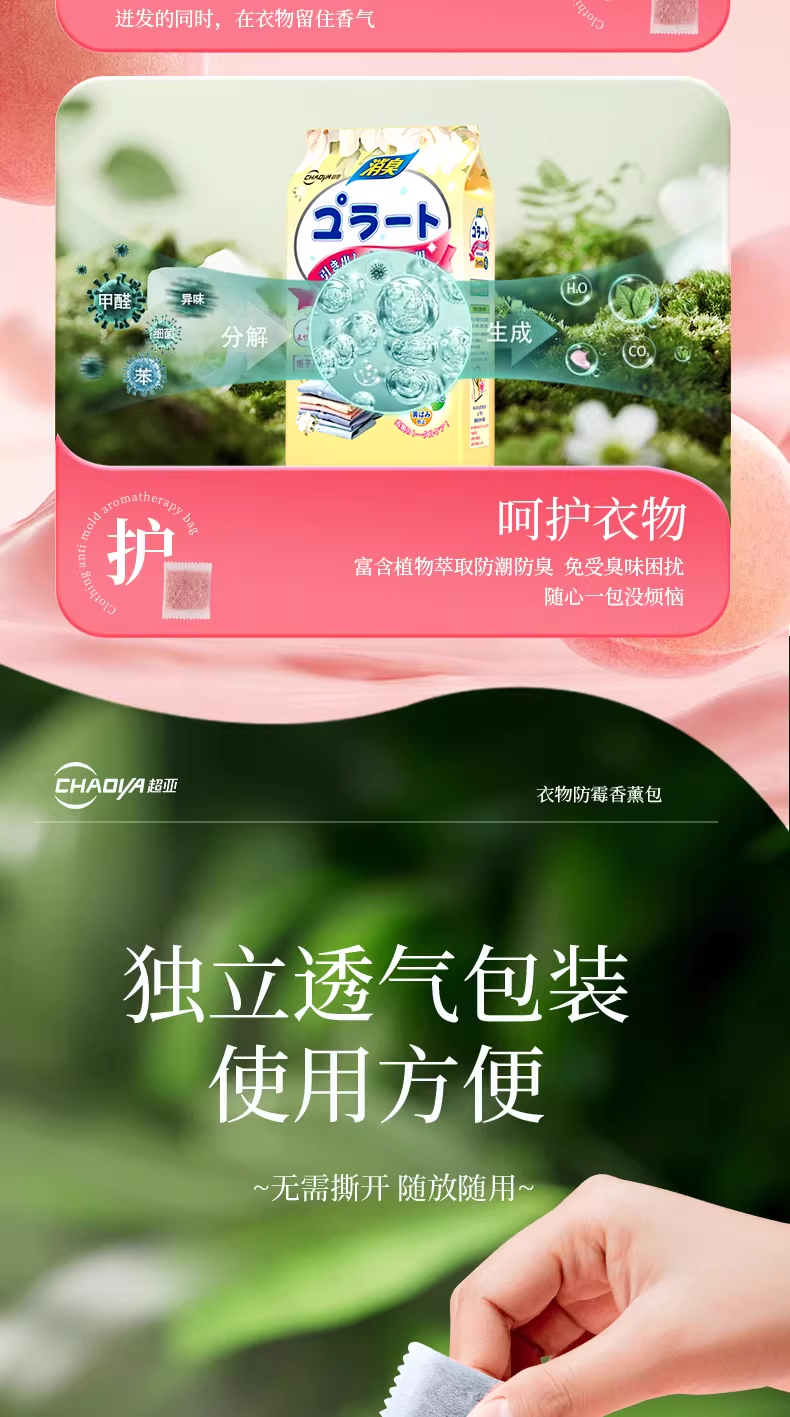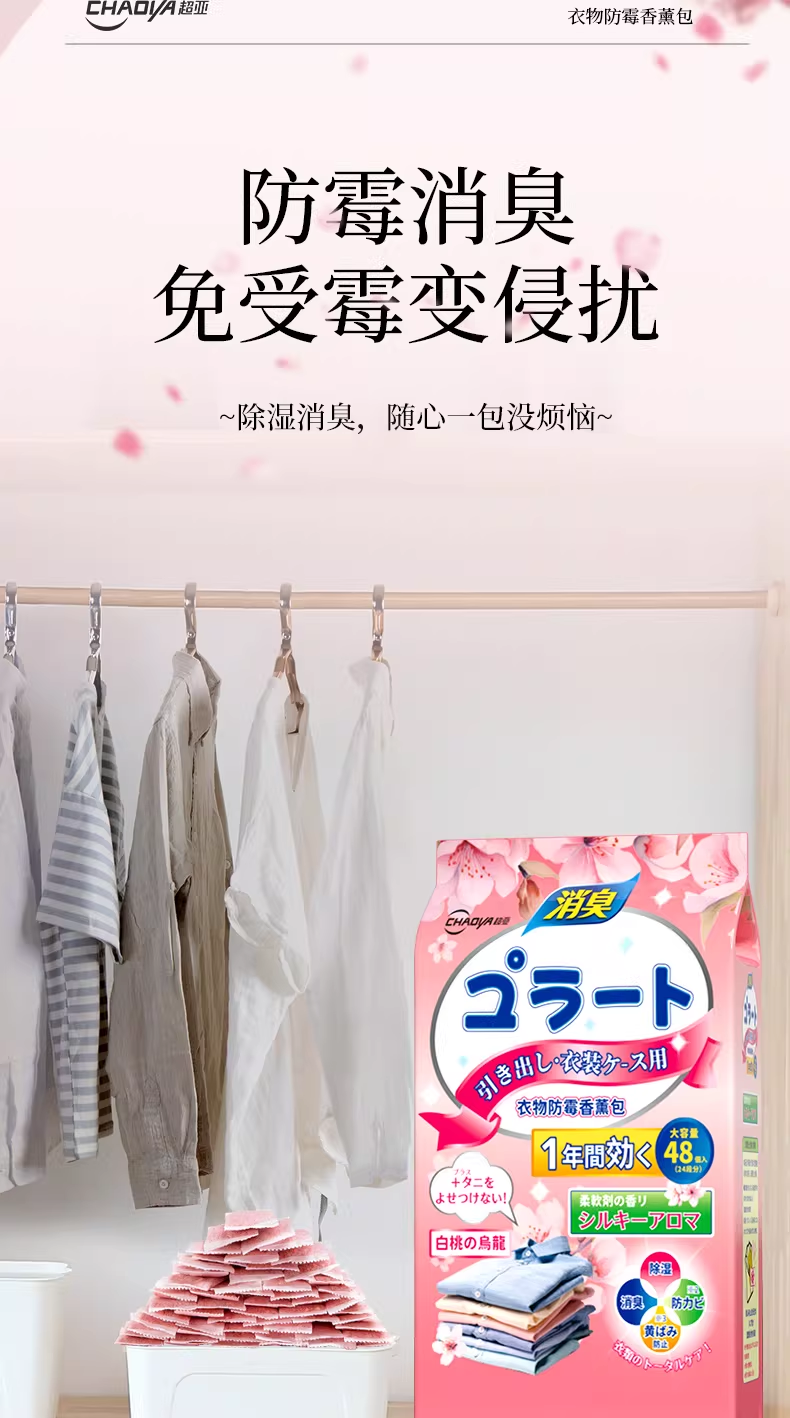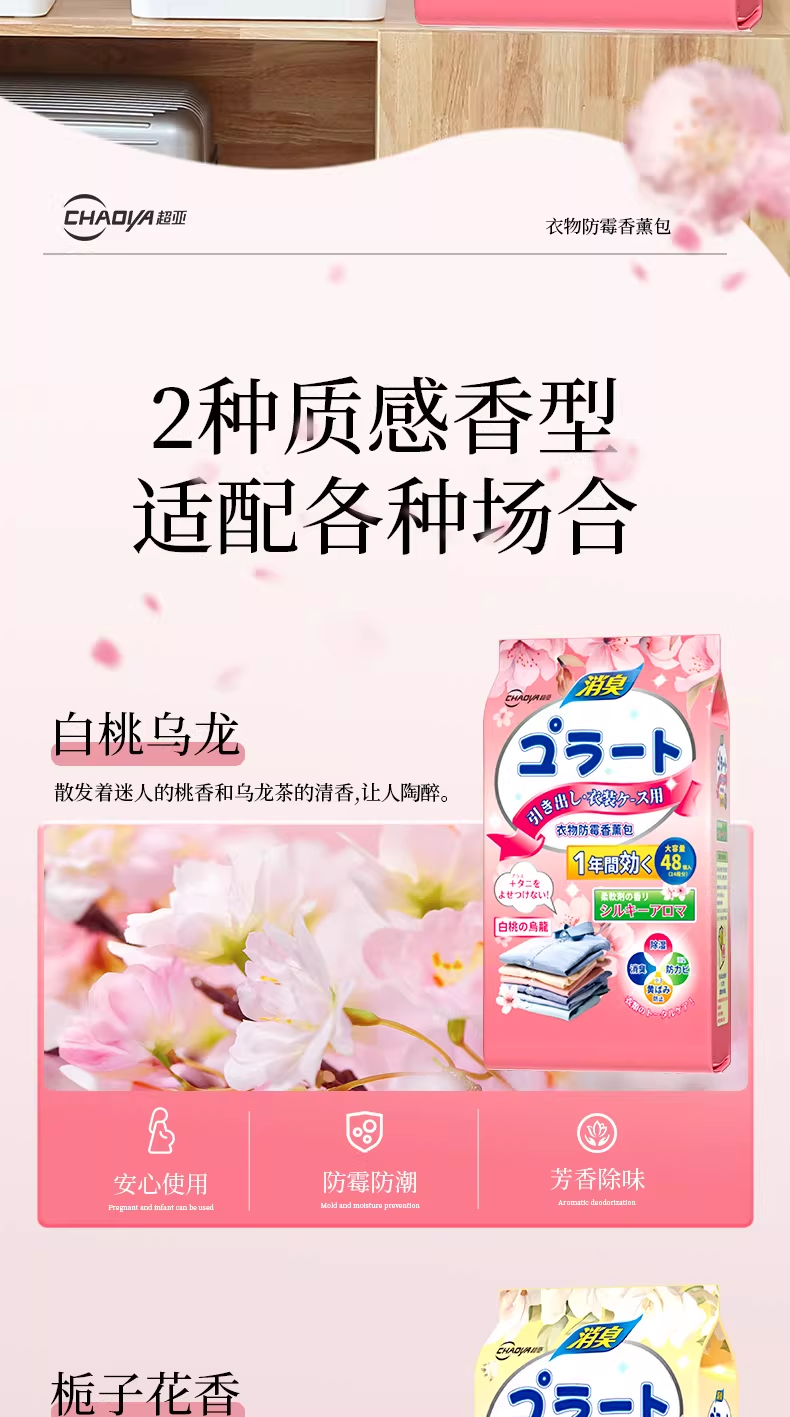 超亚花香香薰包衣柜去潮湿香氛衣物防霉卧室除臭异味鞋柜室内非樟脑丸 防潮防霉【白桃乌龙香+栀子花香共96小包】