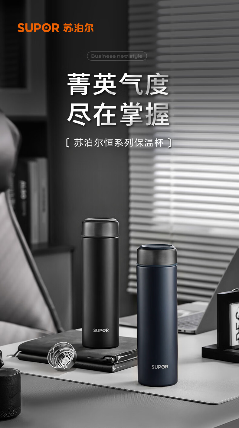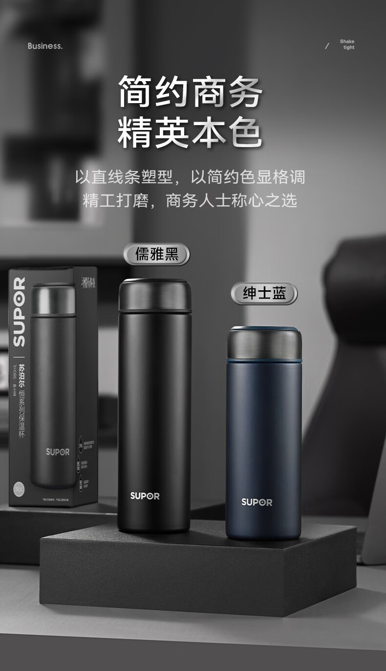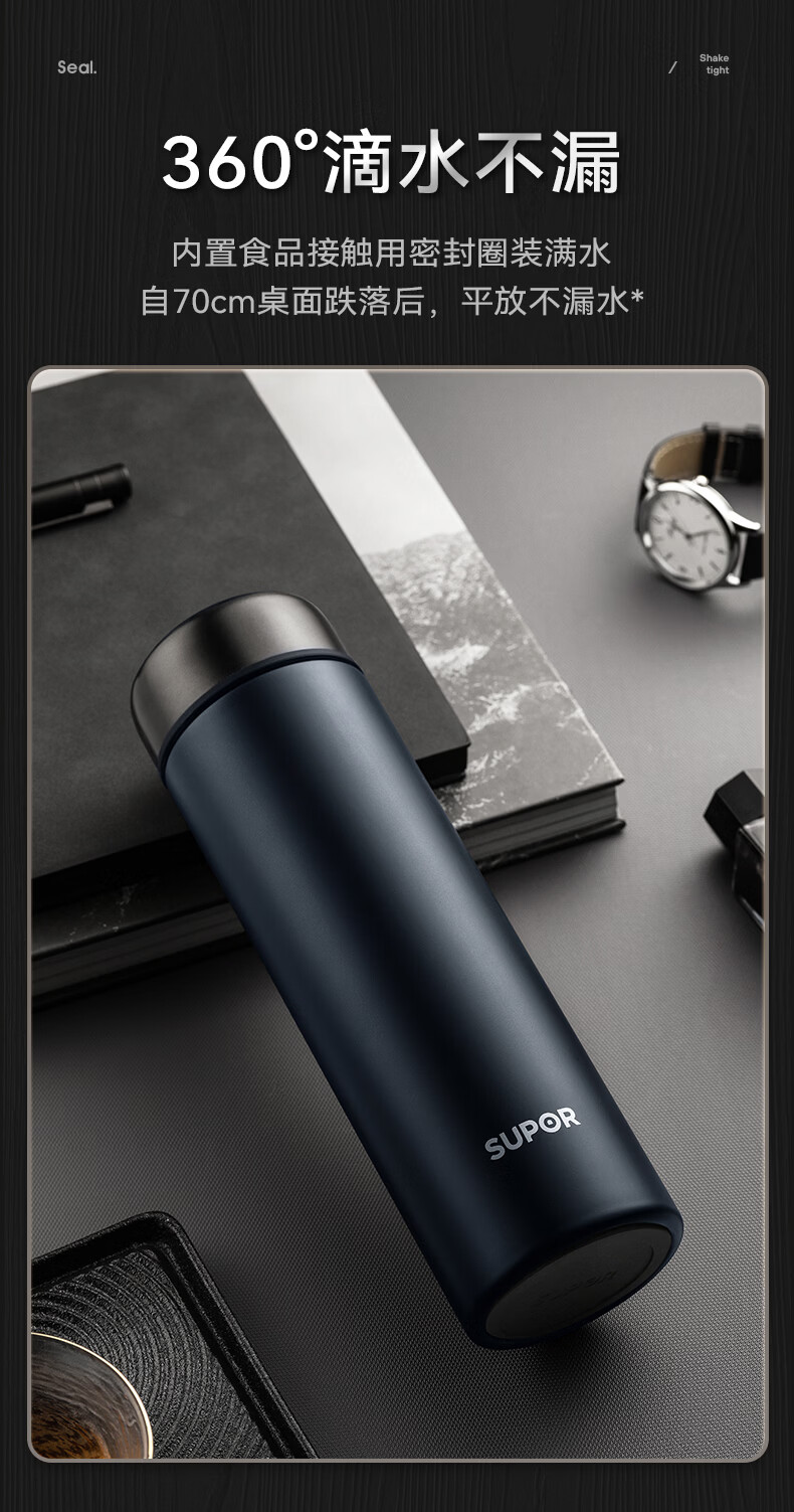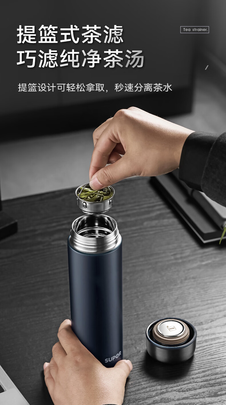苏泊尔(SUPOR)保温杯男士大容量茶杯泡茶商务高档车载不锈钢保温杯子教师节礼物 绅士蓝500ml【316L+杯刷+礼袋】