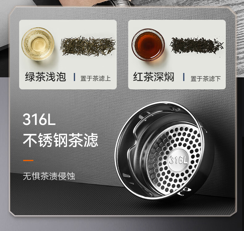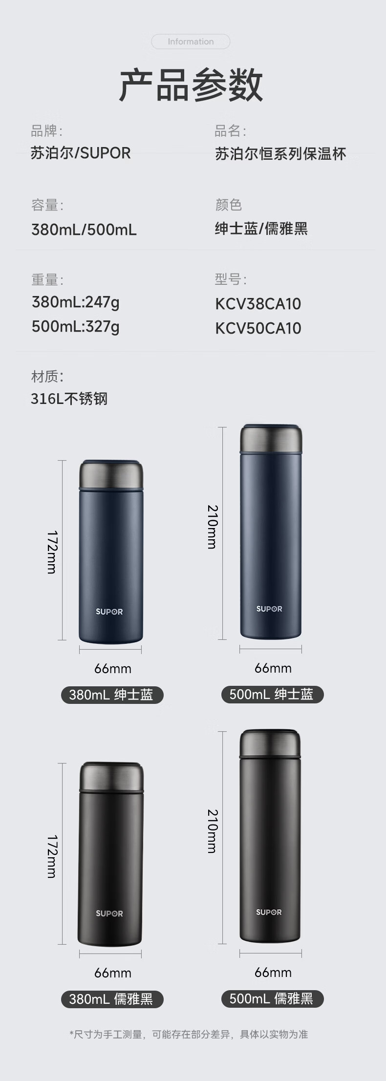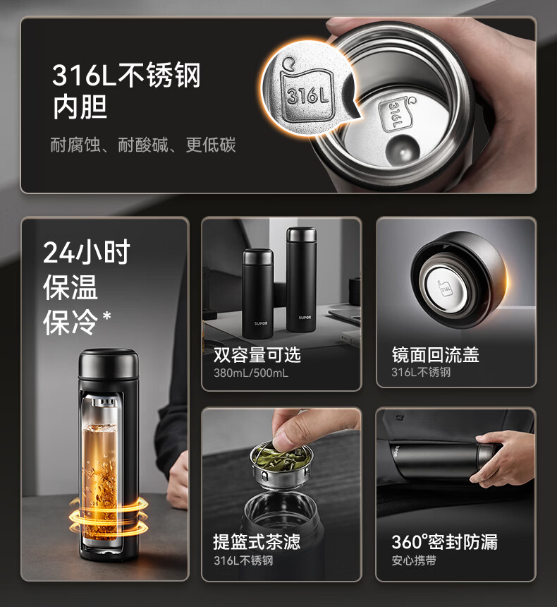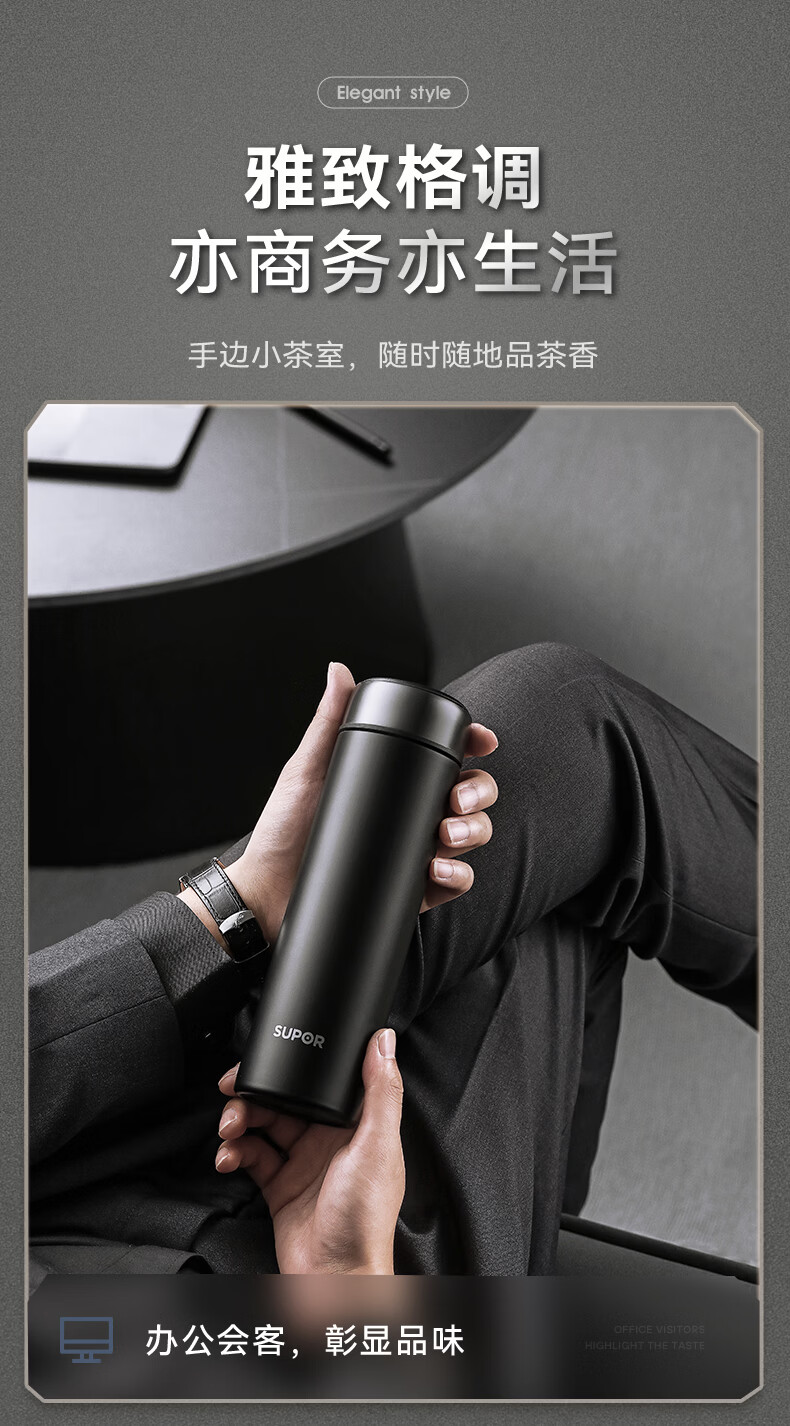 苏泊尔(SUPOR)保温杯男士大容量茶杯泡茶商务高档车载不锈钢保温杯子教师节礼物 绅士蓝500ml【316L+杯刷+礼袋】
