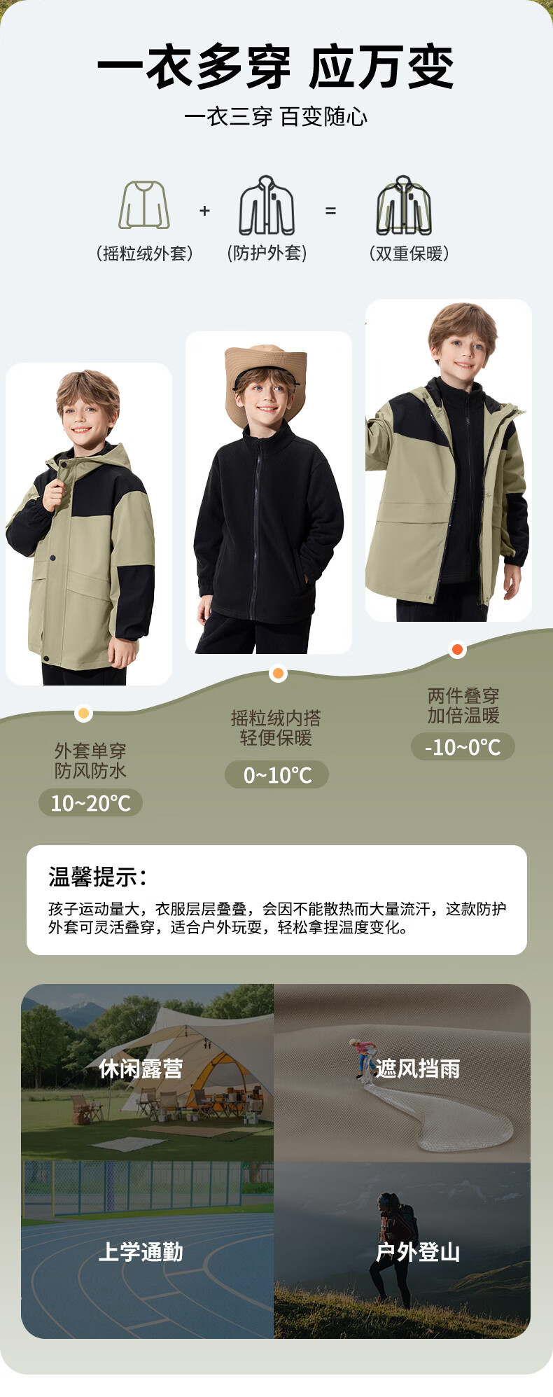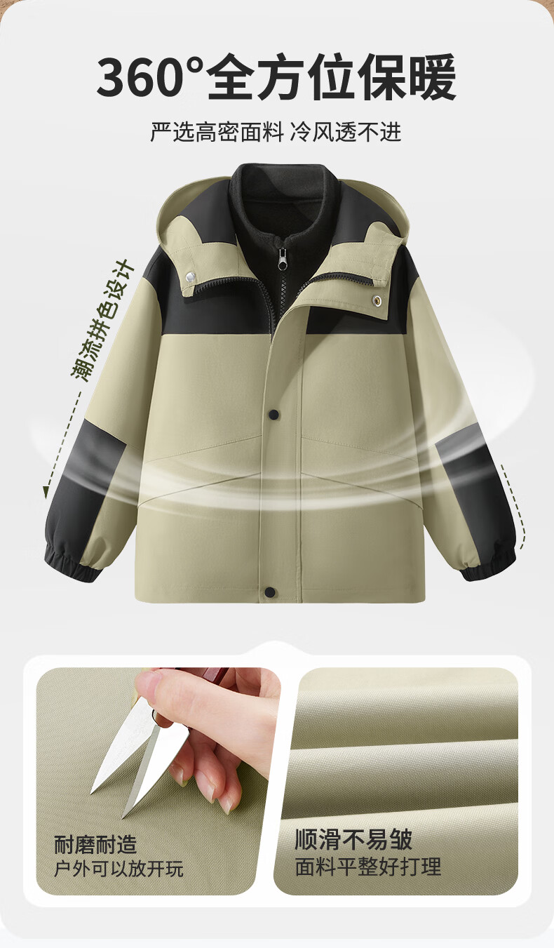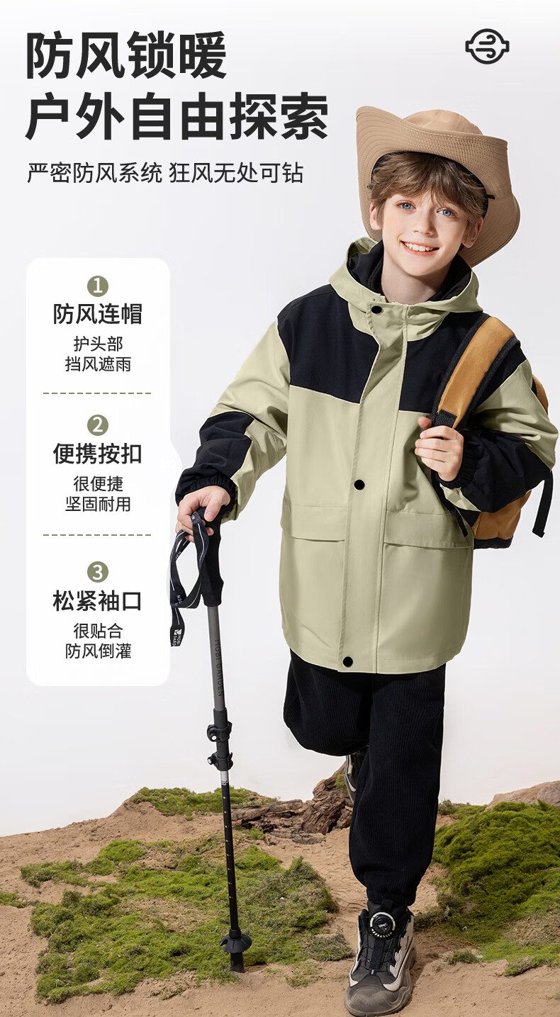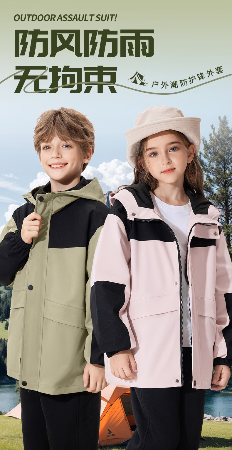 真维斯儿童冲锋外套三防衣服男童帅气春装女童春季露营中大童轻户外童装 【拼色三防冲锋外套】军绿 110