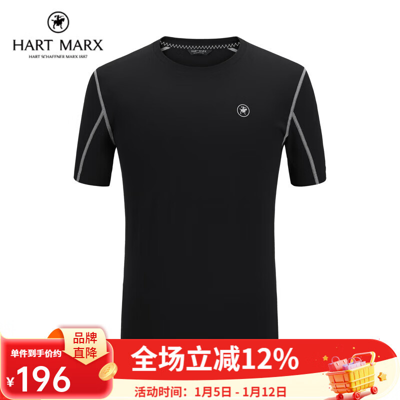 哈特马克斯圆领男士休闲短袖T恤时尚运动休闲百搭打底T恤上衣 曜岩黑 M 170/92A