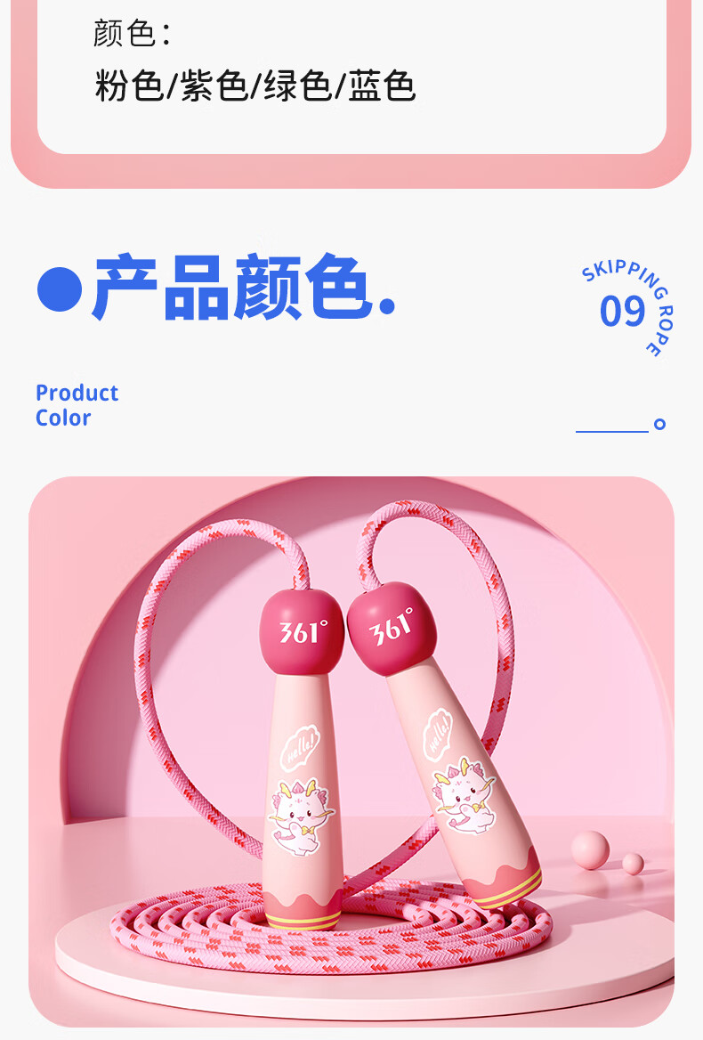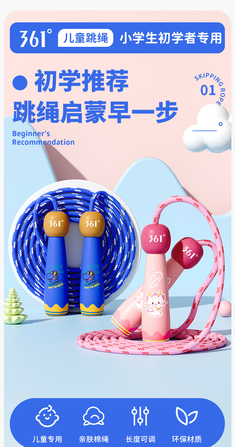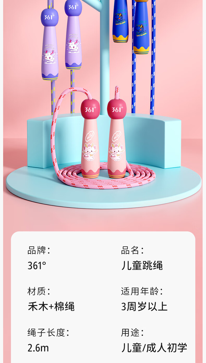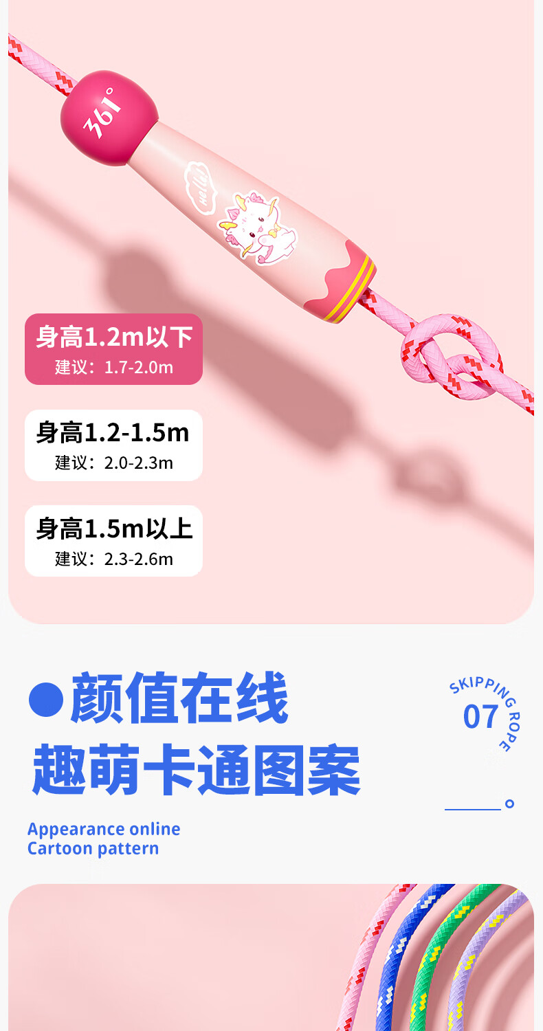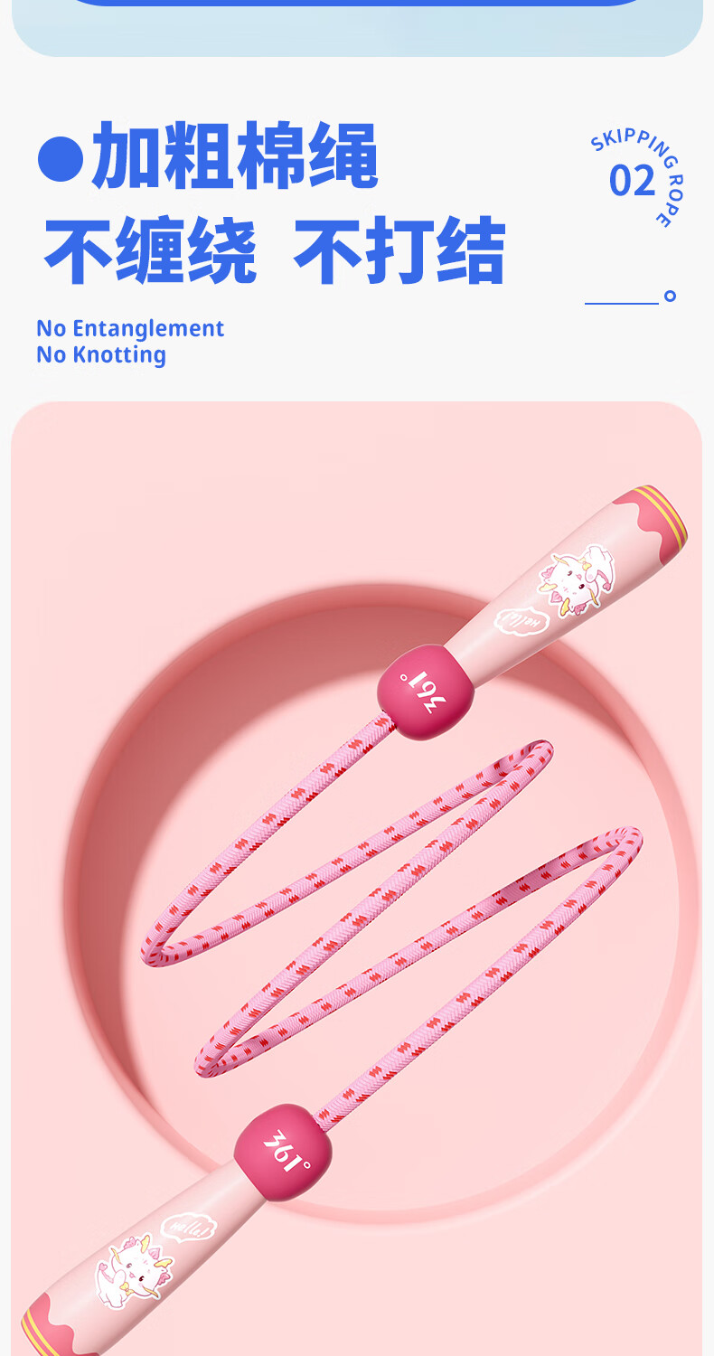 361°儿童跳绳幼儿园小学生运动绳耐磨不打结一年级初学者健身专用 粉色小萌龙【2.6m绳长可调节】