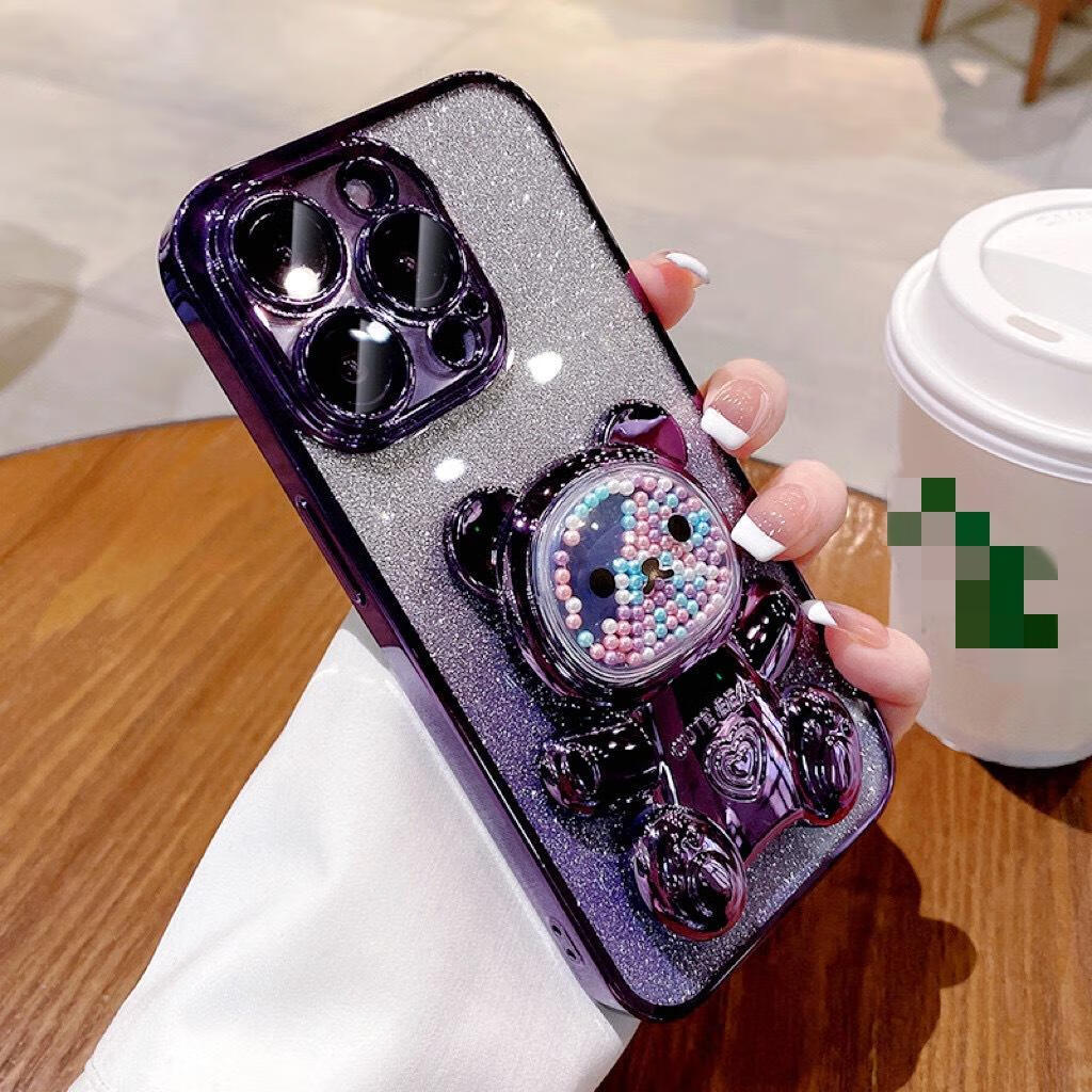 卡通电镀小熊适用16手机壳iPhone15promax支架13pro闪粉12/11 远峰蓝闪粉+小熊支架 iPhone16