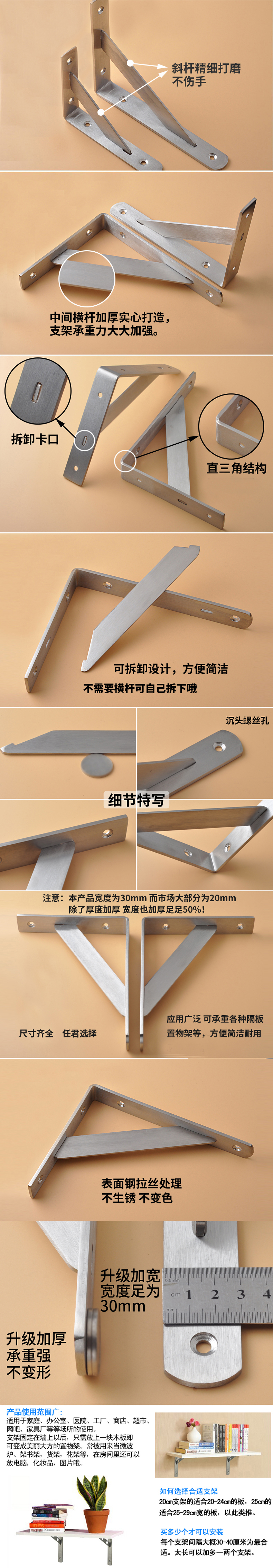 Segmoo加厚不锈钢托架层板隔板书架三角支架托架墙壁置物架五金配件书架 4MM厚长20CM(一只价)