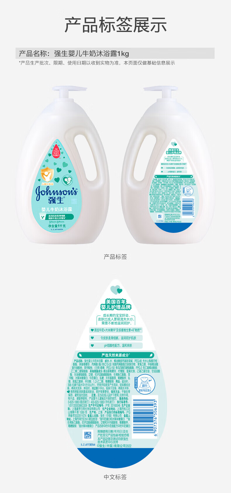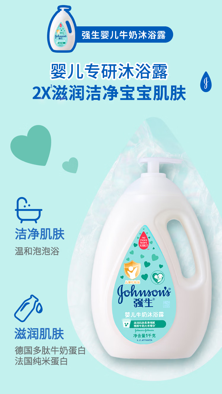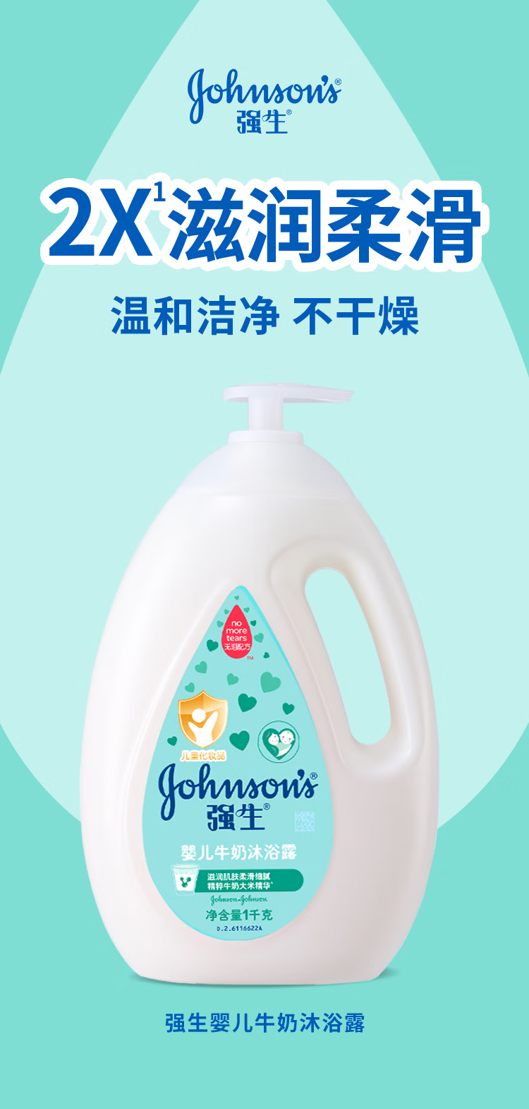 强生(Johnson)婴儿牛奶沐浴露无泪配方 温和清洁新生儿宝宝沐浴乳 【家庭4斤装】牛奶沐浴露1kg*2瓶