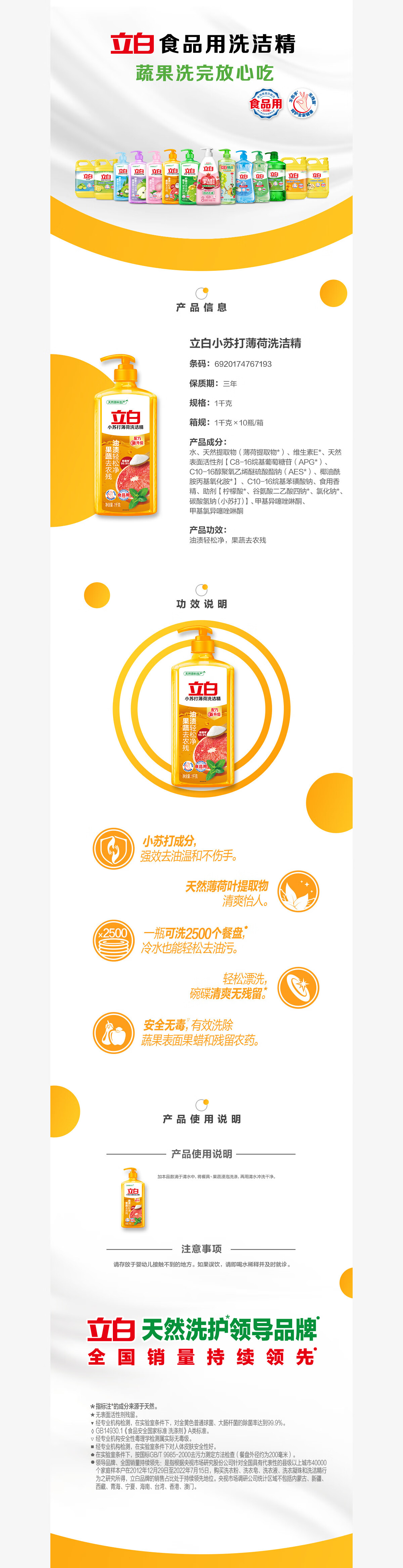 立白小苏打薄荷洗洁精1千克*2桶油渍轻松净果蔬去农残