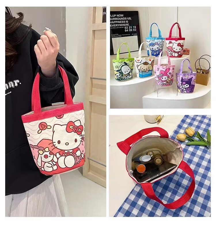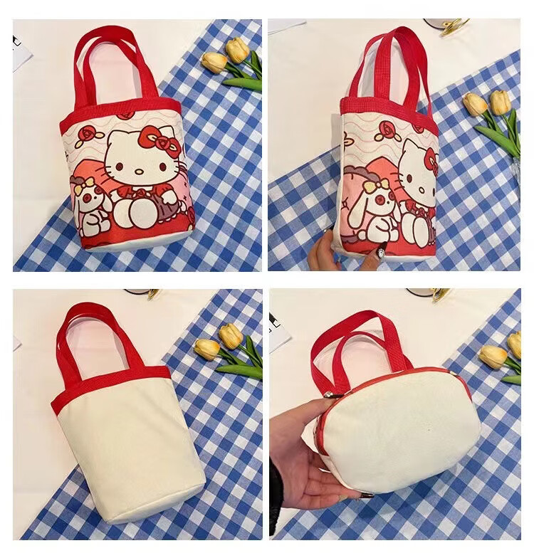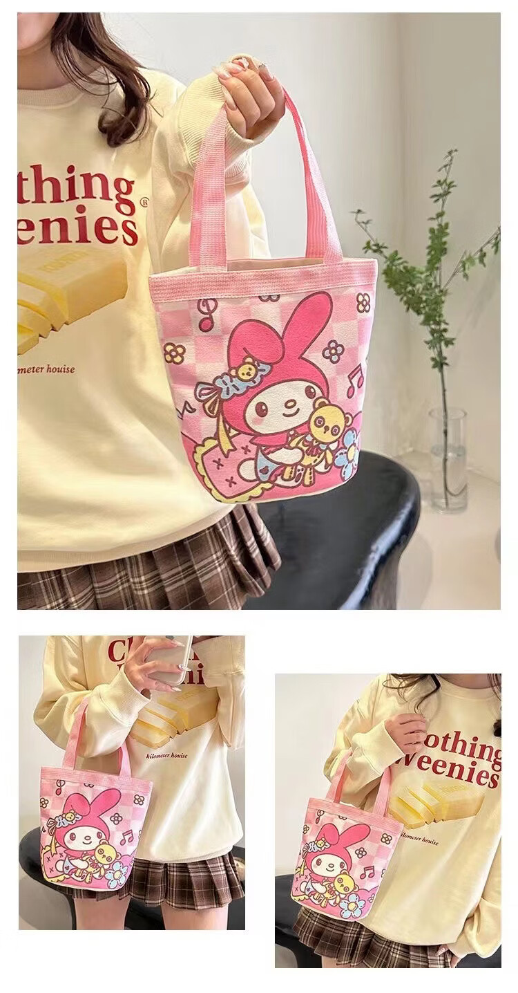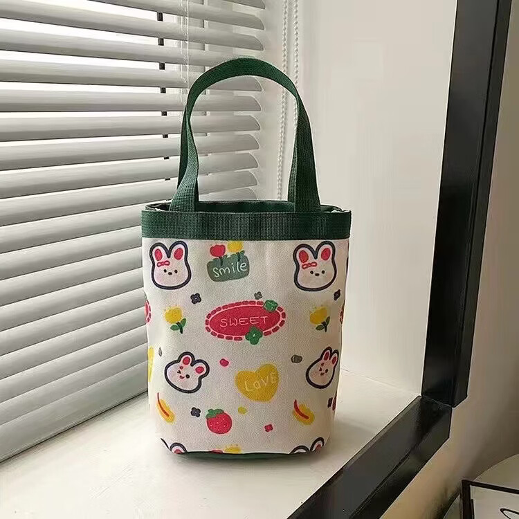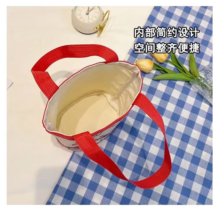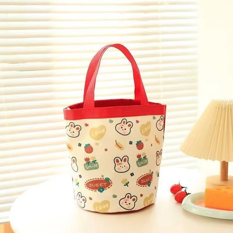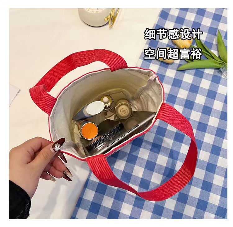 2024新款上班族女外出迷你手提圆筒拎袋子便当饭盒零食帆布水桶包 红色兔子