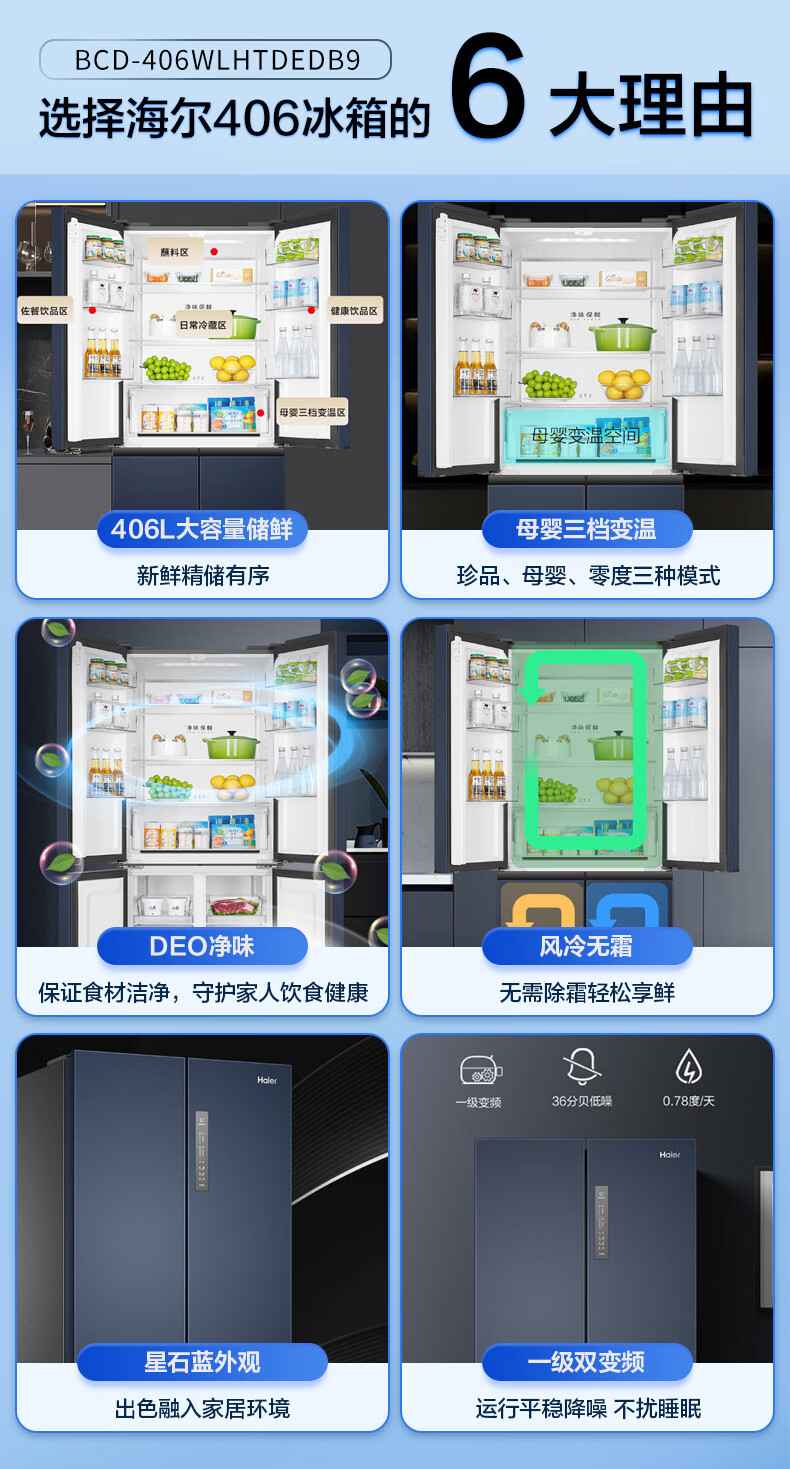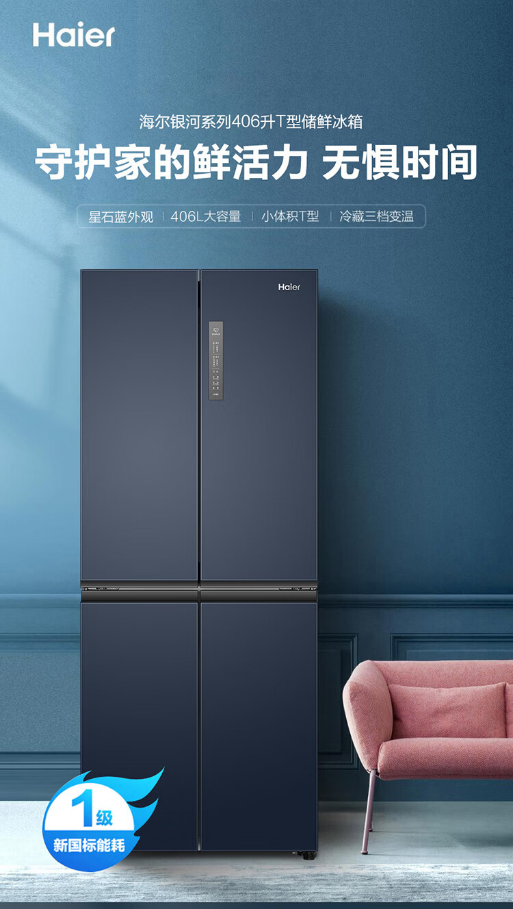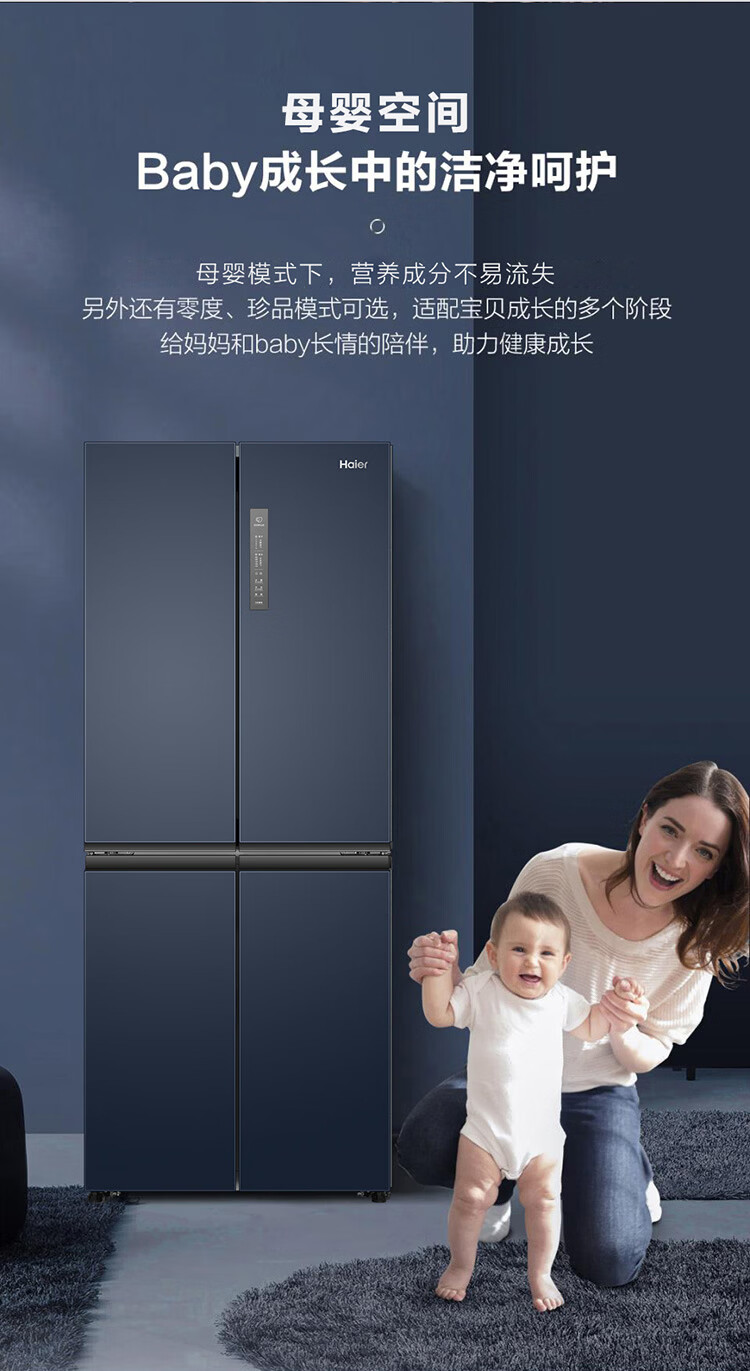 海尔(Haier)冰箱406升四开门十字对开门母婴三档变温一级能效双变频节能风冷无霜超薄大容量家用电冰箱补贴15% 宽70cm+406升+母婴空间+净味保鲜
