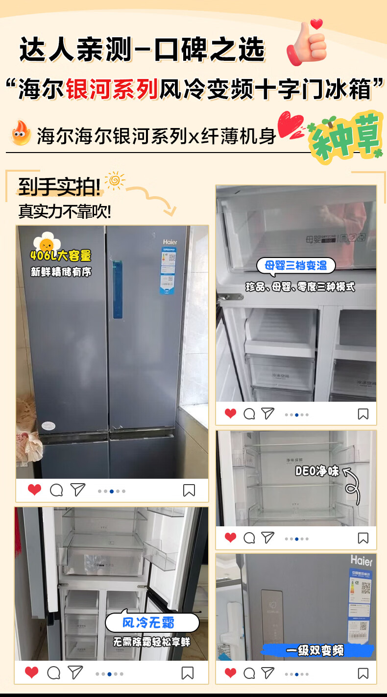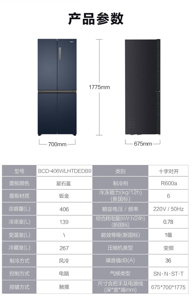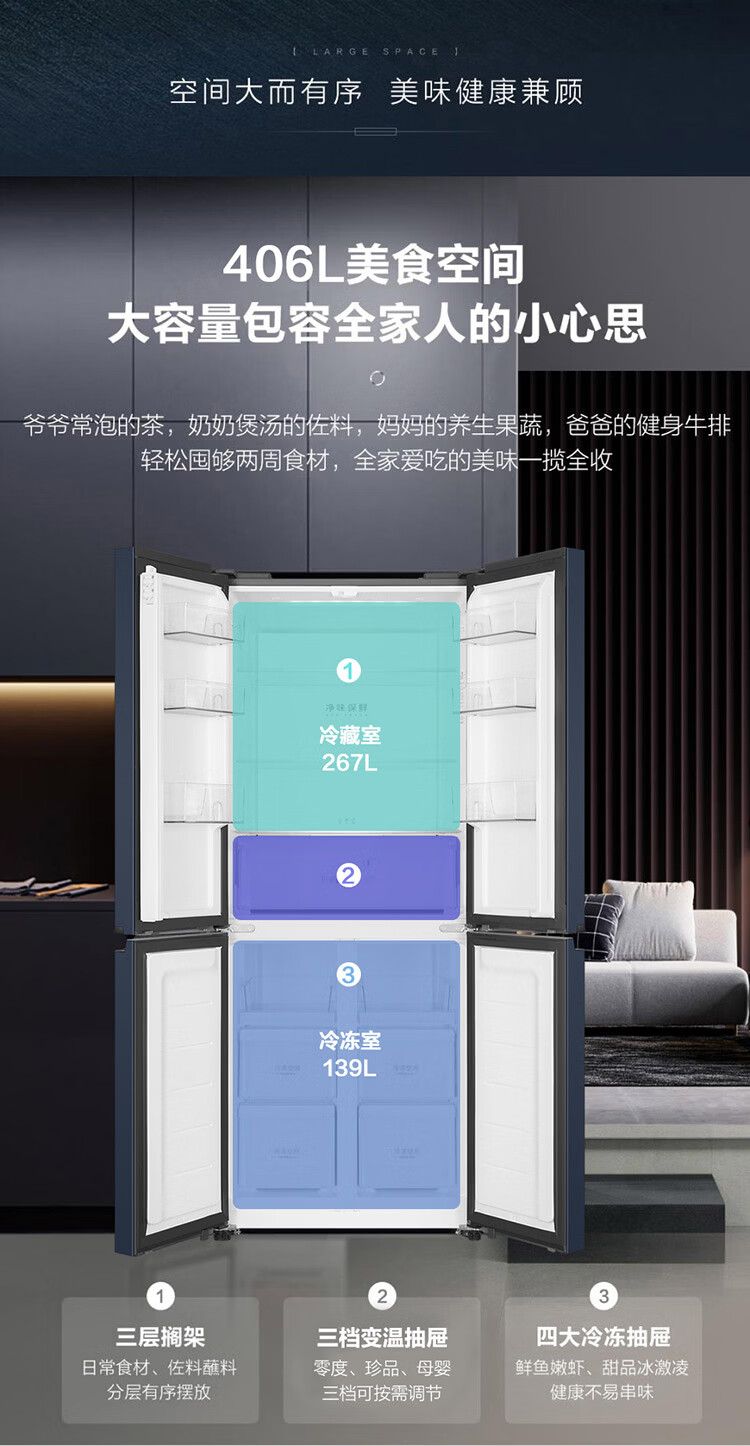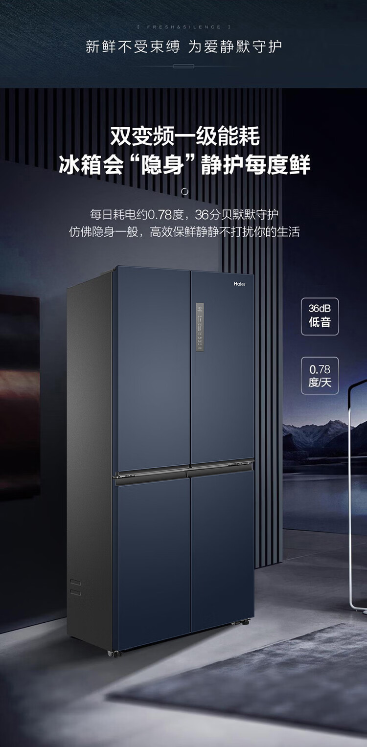 海尔(Haier)冰箱406升四开门十字对开门母婴三档变温一级能效双变频节能风冷无霜超薄大容量家用电冰箱补贴15% 宽70cm+406升+母婴空间+净味保鲜