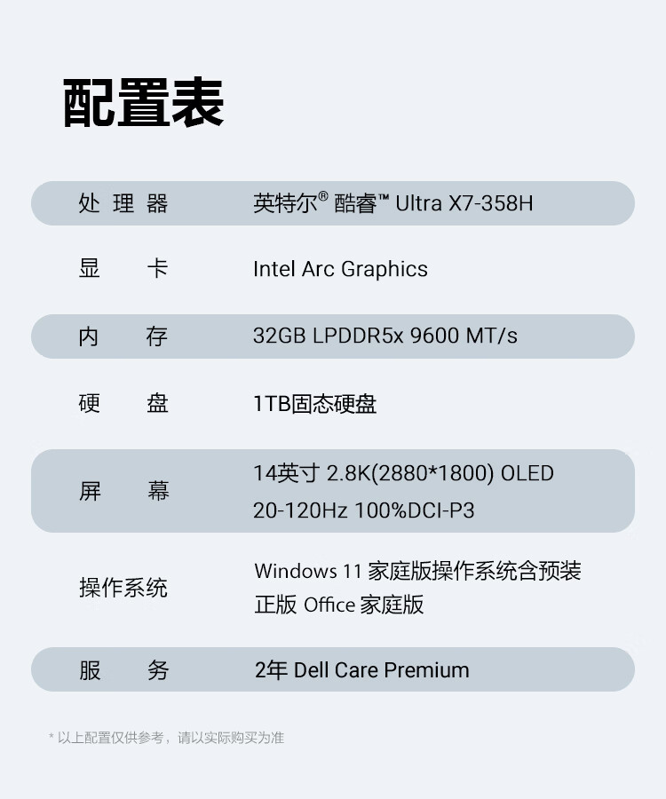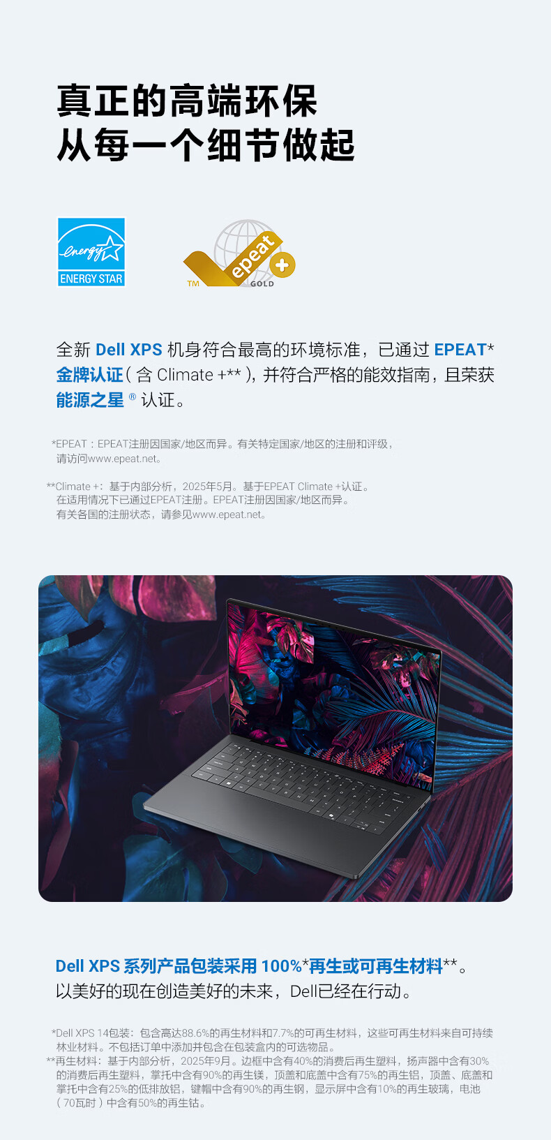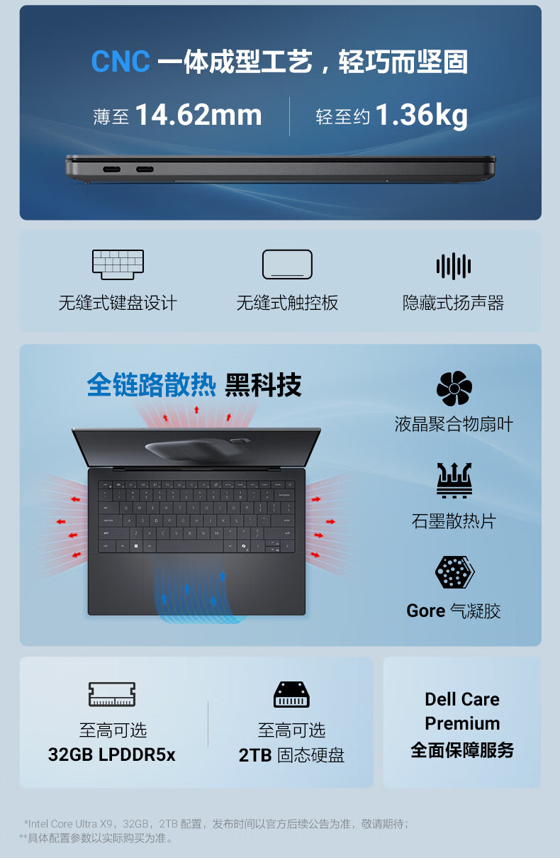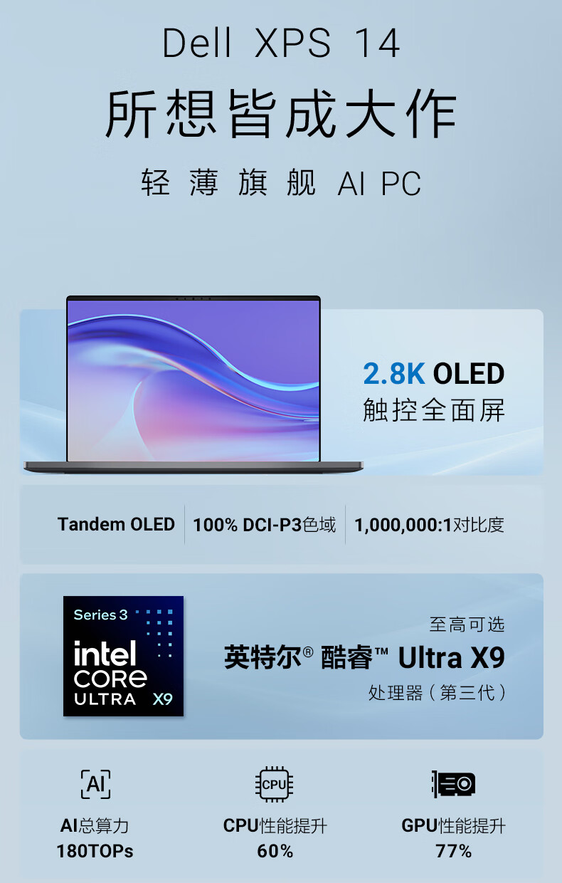 戴尔(DELL)笔记本电脑 XPS14 2026新款 AI商务轻薄本全能本 第三代酷睿Ultra X7 32G 1T 2.8K OLED触控 120Hz