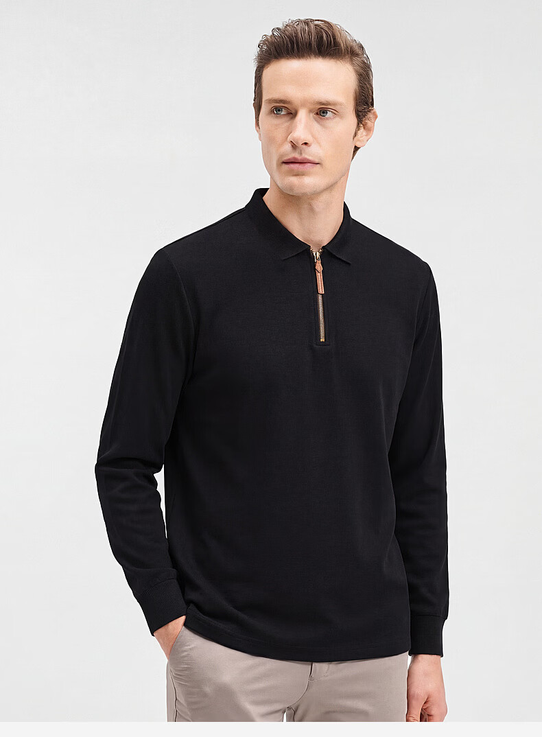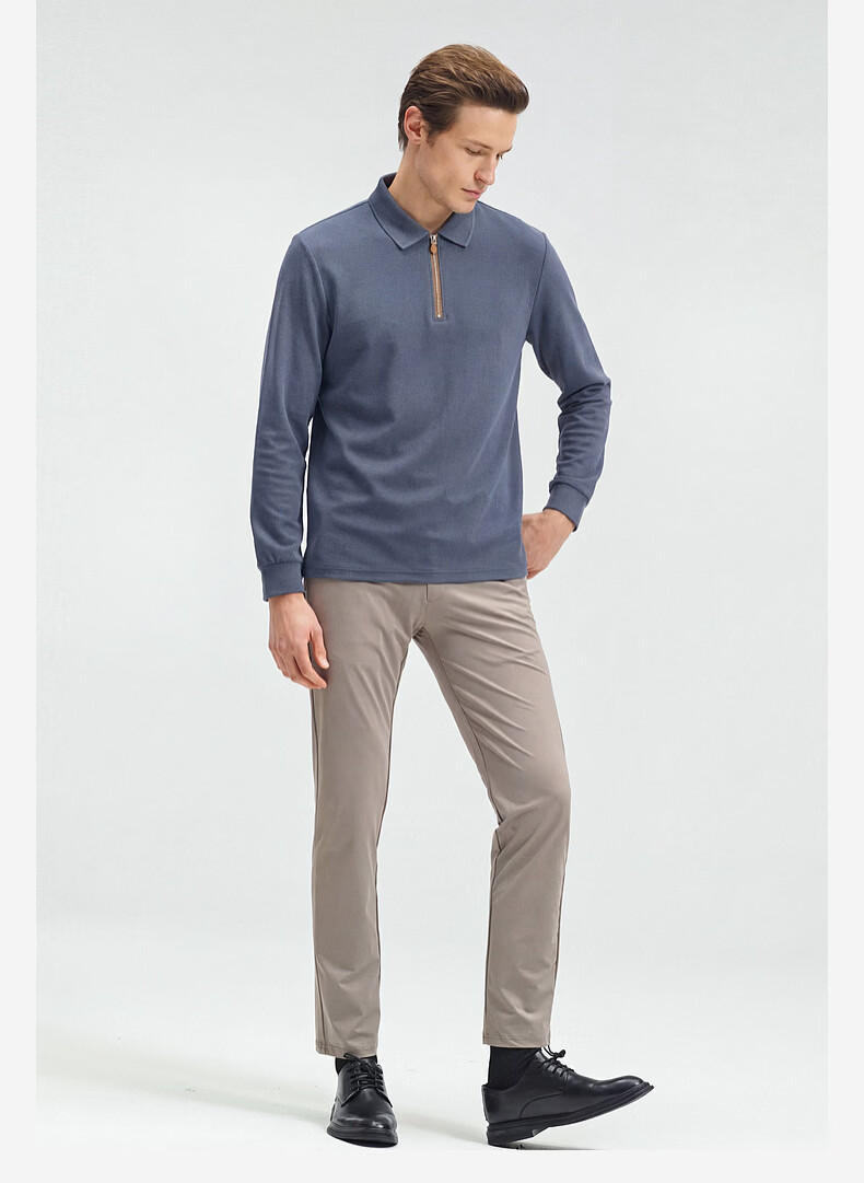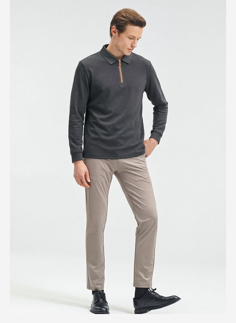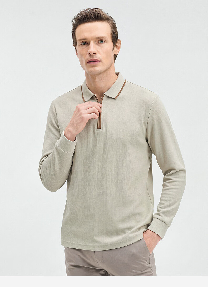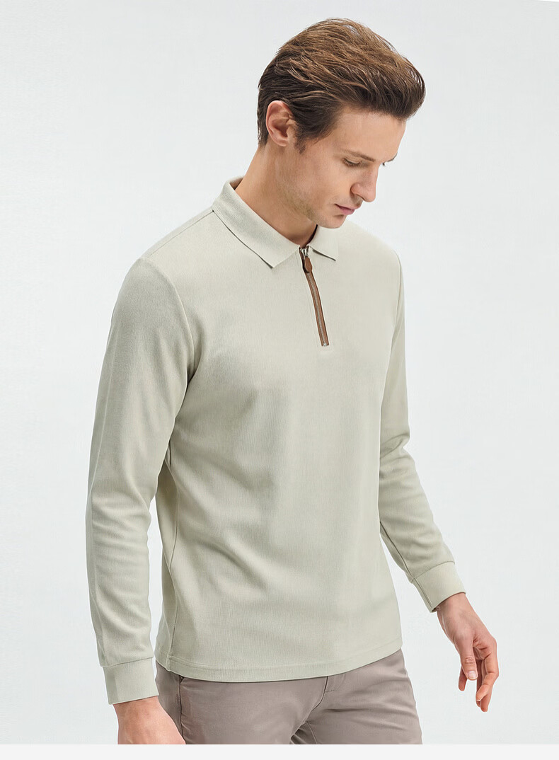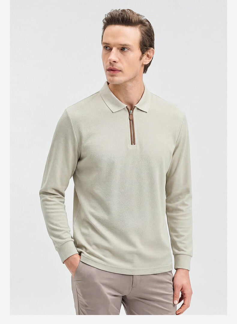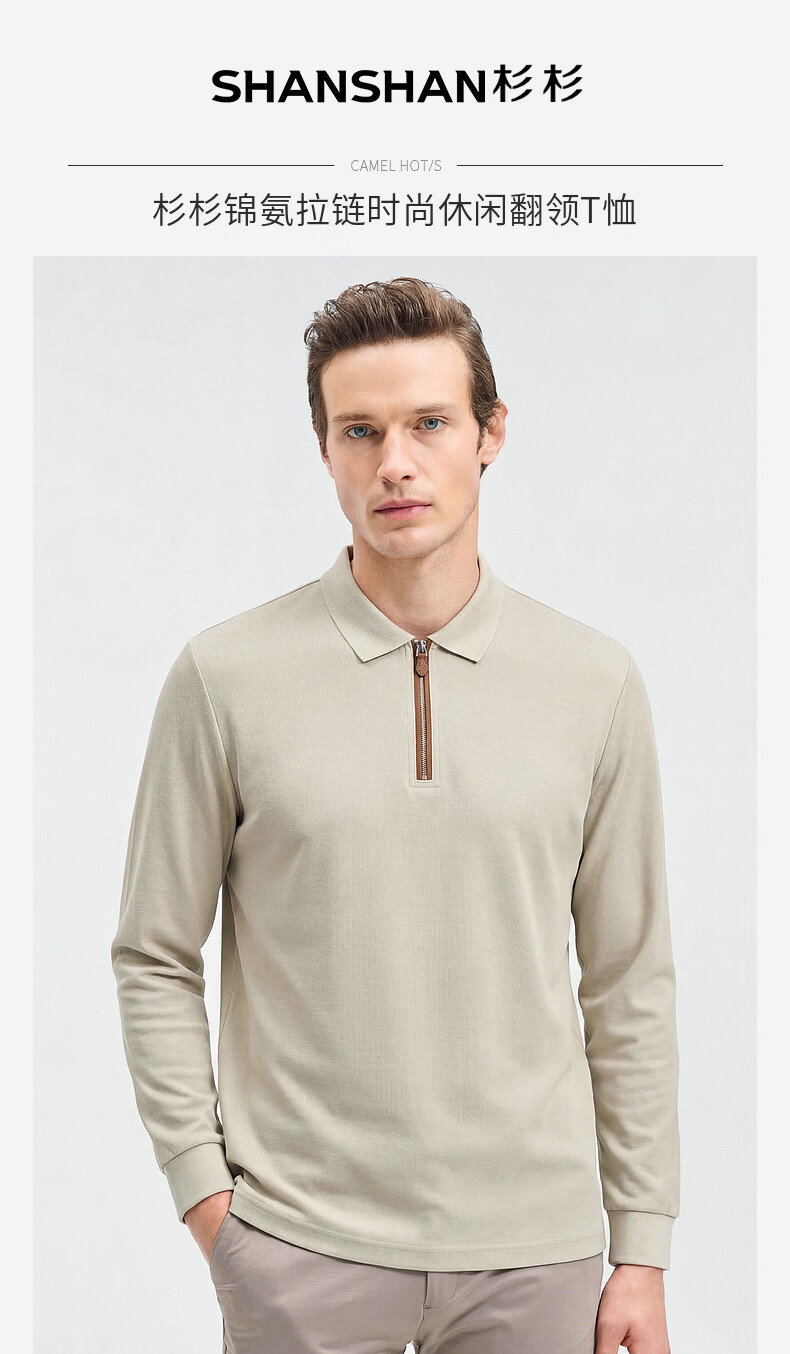 SHANSHAN杉杉【锦氨弹力】长袖t恤男翻领POLO衫纯色半拉链领打底春秋新款 米杏色 L /175