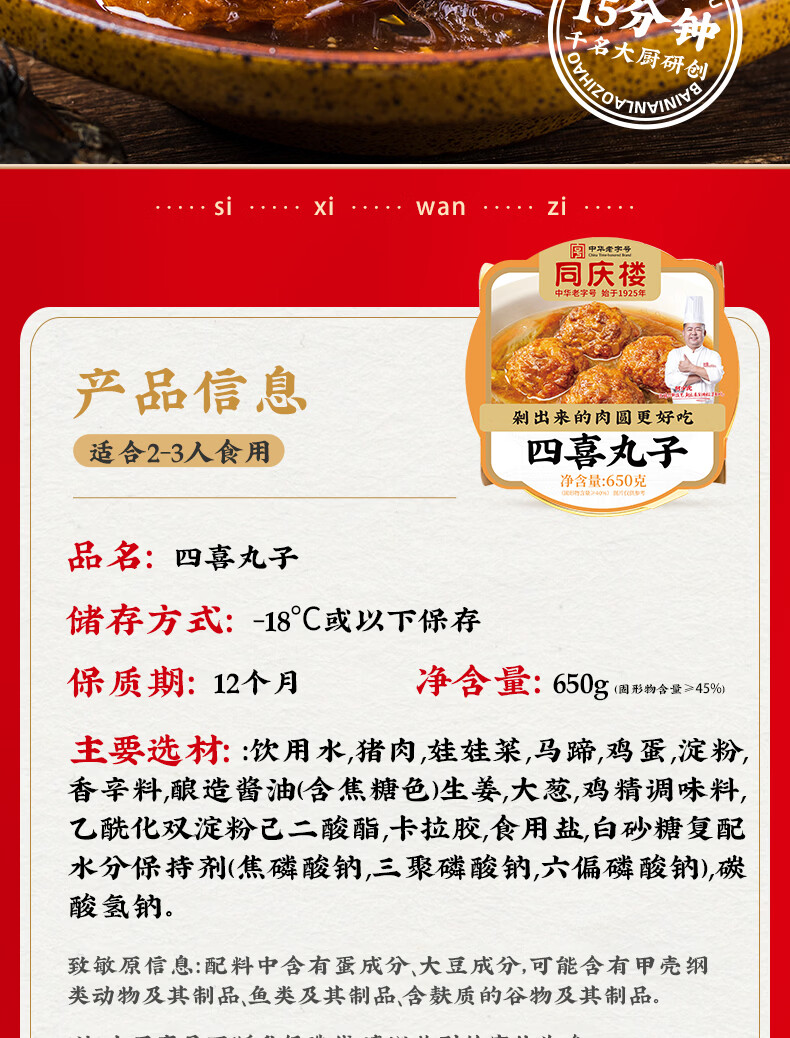同庆楼四喜丸子650g狮子头大厨快手菜预制菜食材加热即食中华老字号 四喜丸子650g*3