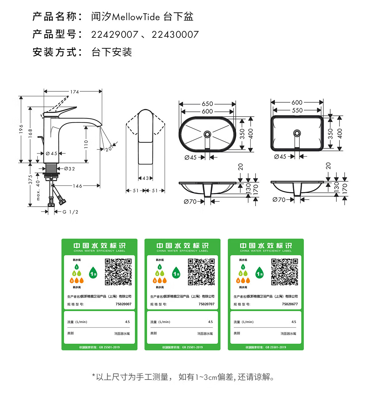 汉斯格雅(Hansgrohe)陶瓷台盆洗手洗脸卫生间面盆台盆龙头 椭圆陶瓷台下盆+75020007镀铬