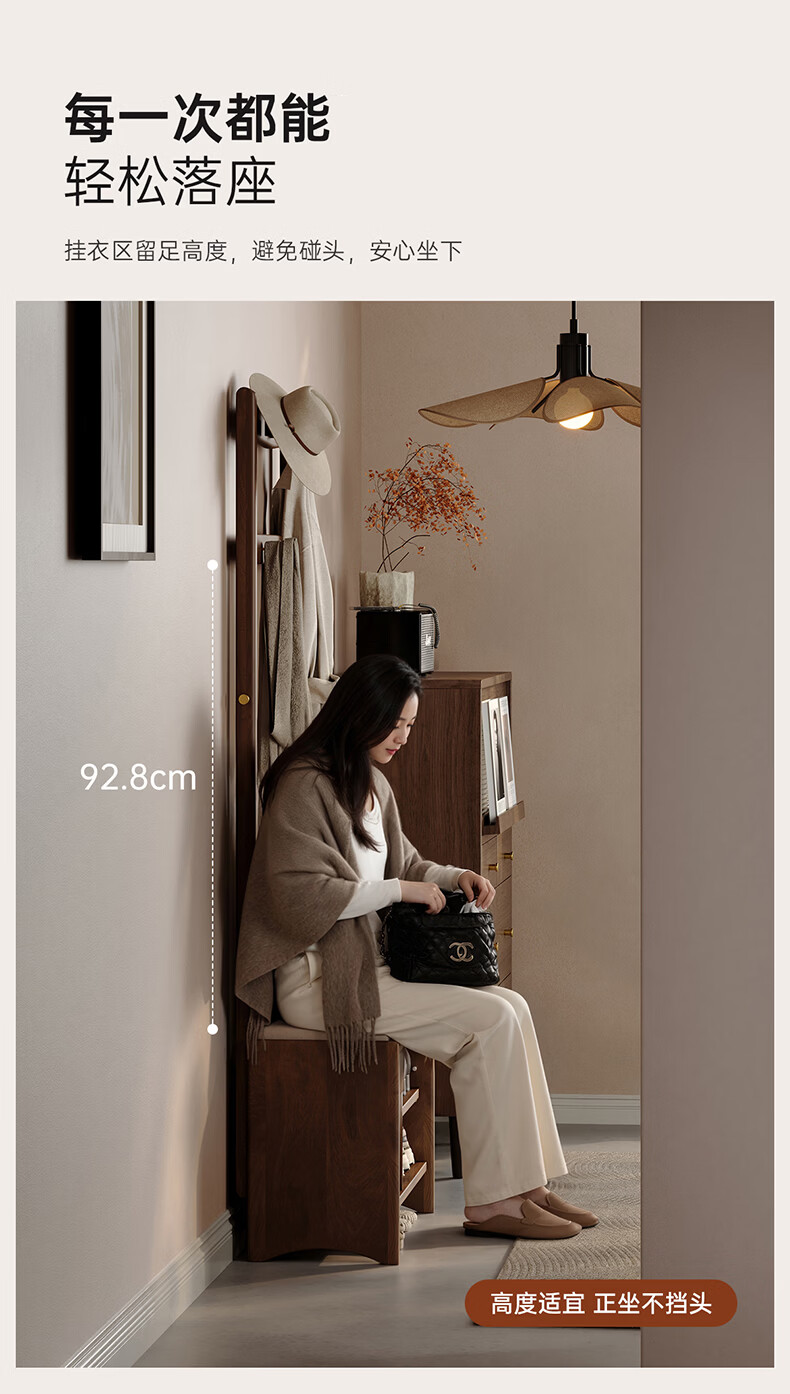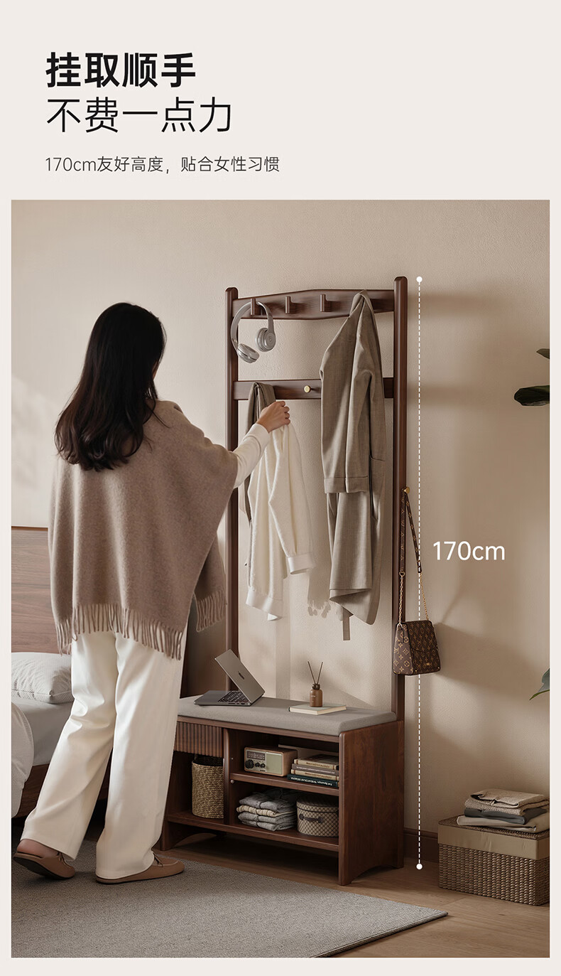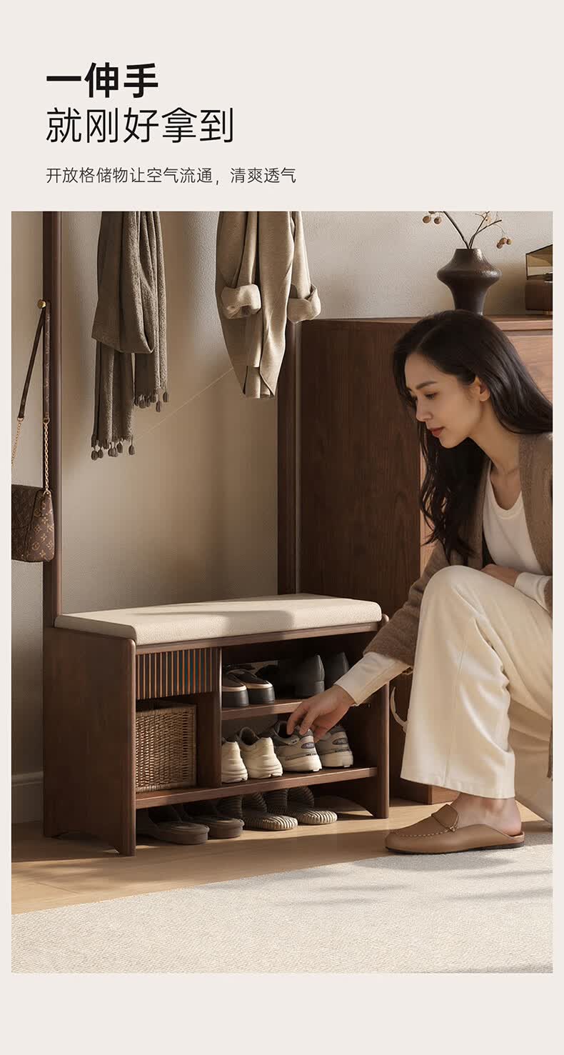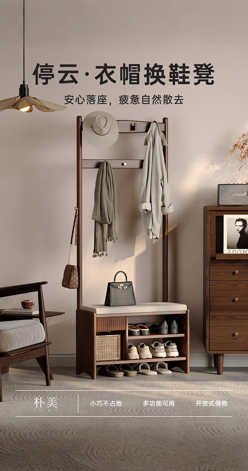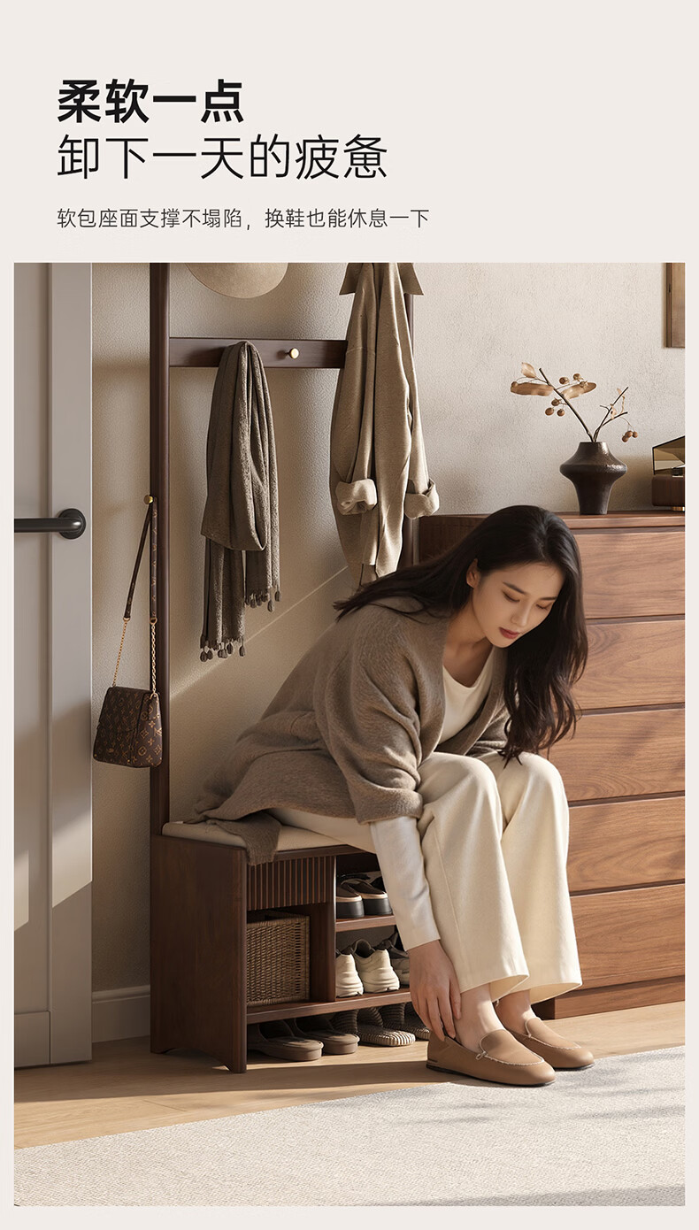 朴美实木入户门换鞋凳高级落地室内玄关软包换鞋凳挂衣架一体不占空间