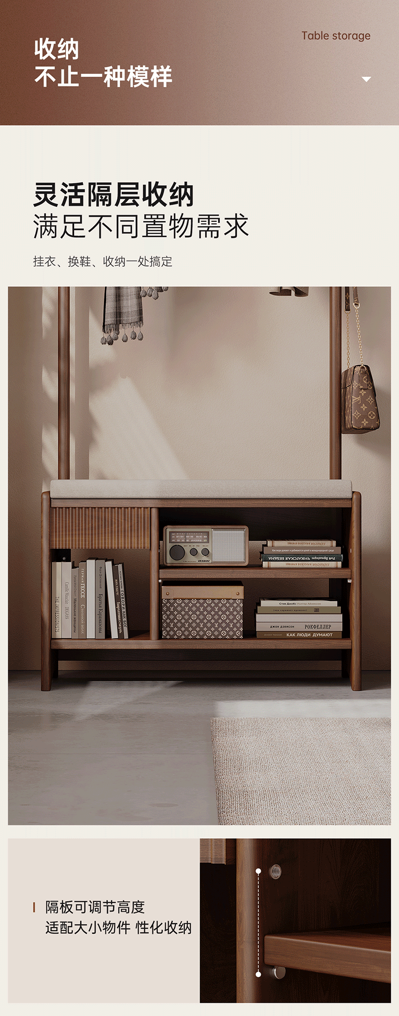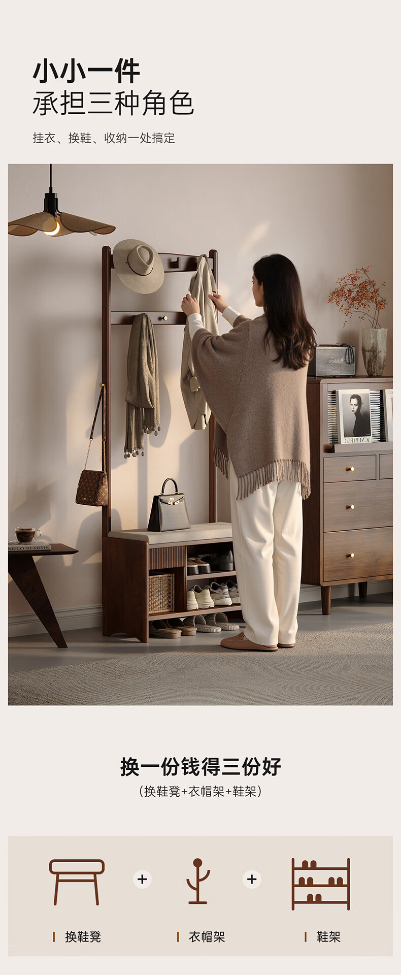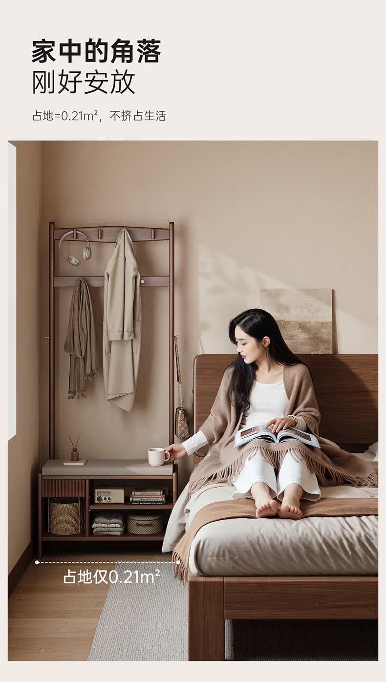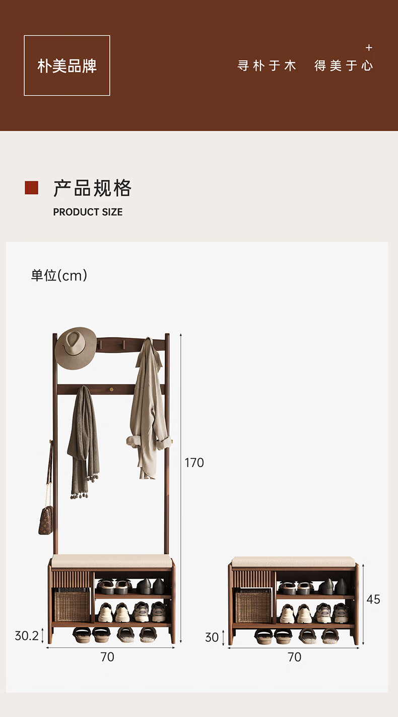 朴美实木入户门换鞋凳高级落地室内玄关软包换鞋凳挂衣架一体不占空间