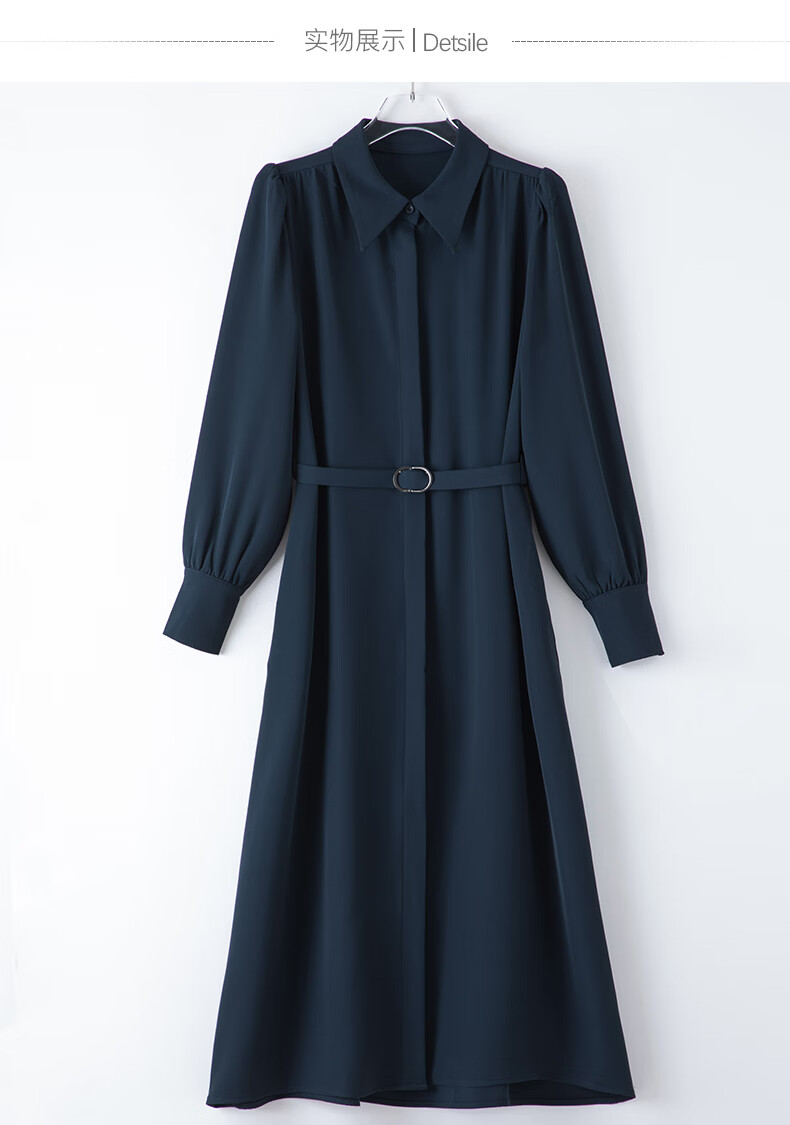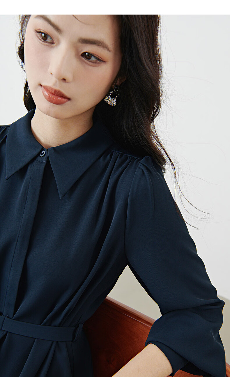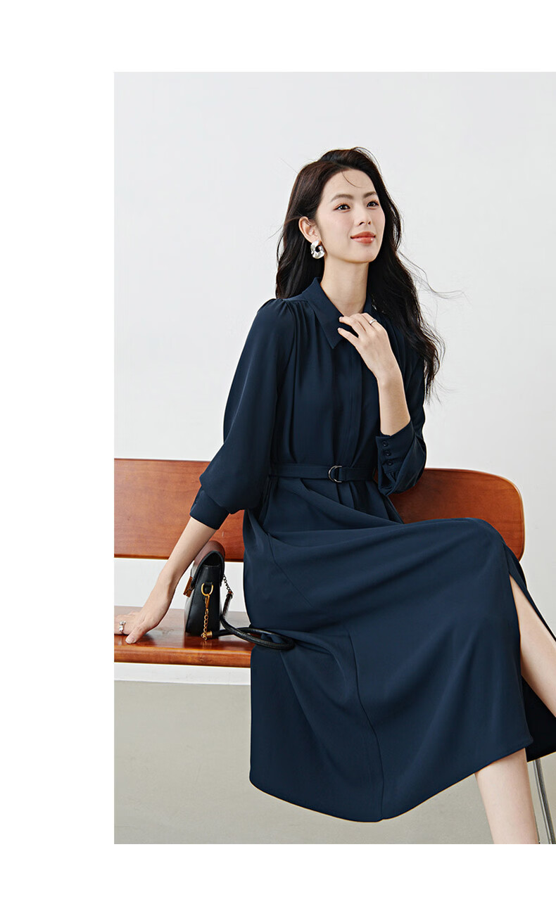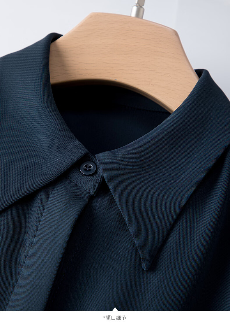 晚白2026春款经典翻领行政蓝正式场合裙子系带收腰垂坠抗皱衬衫连衣裙 深蓝色 L