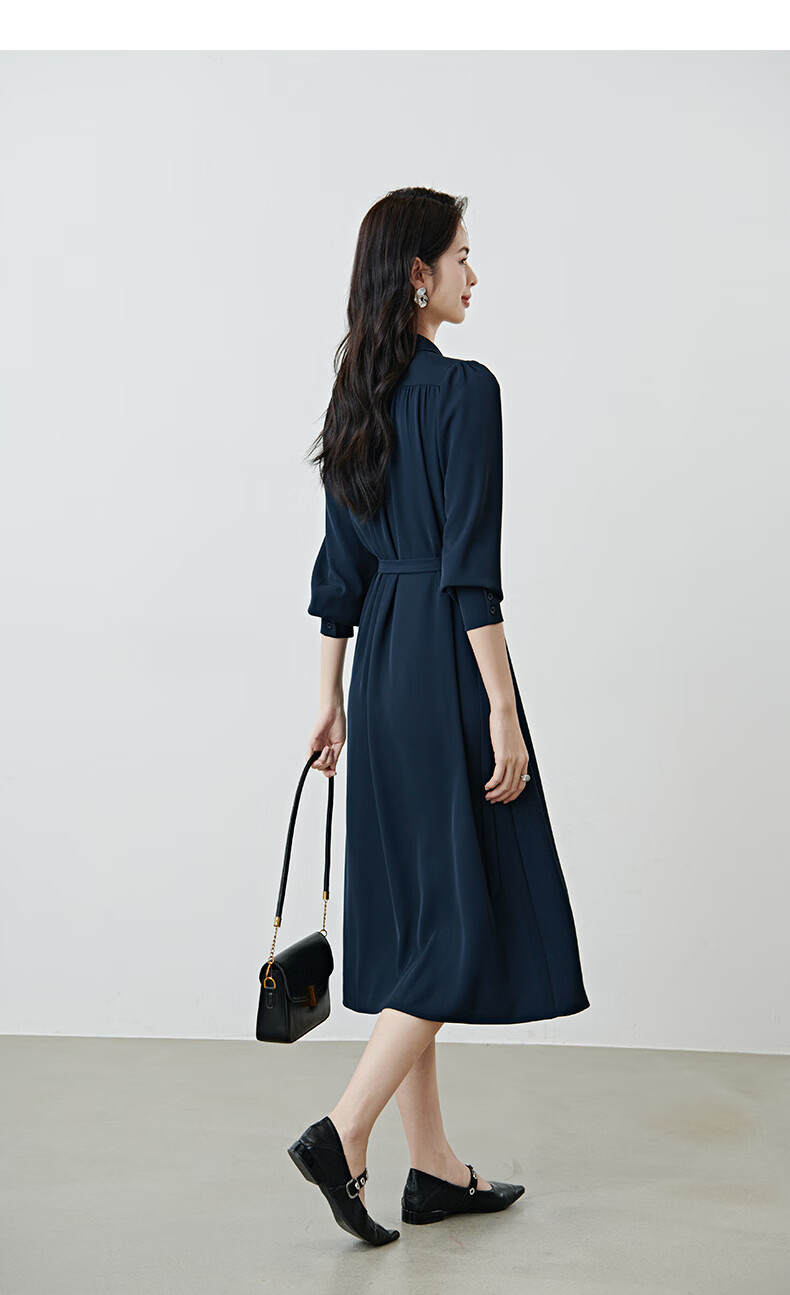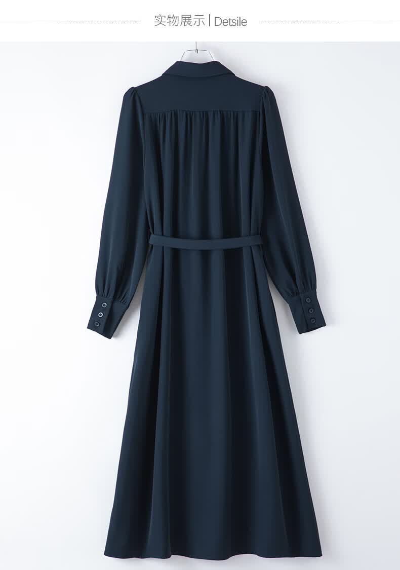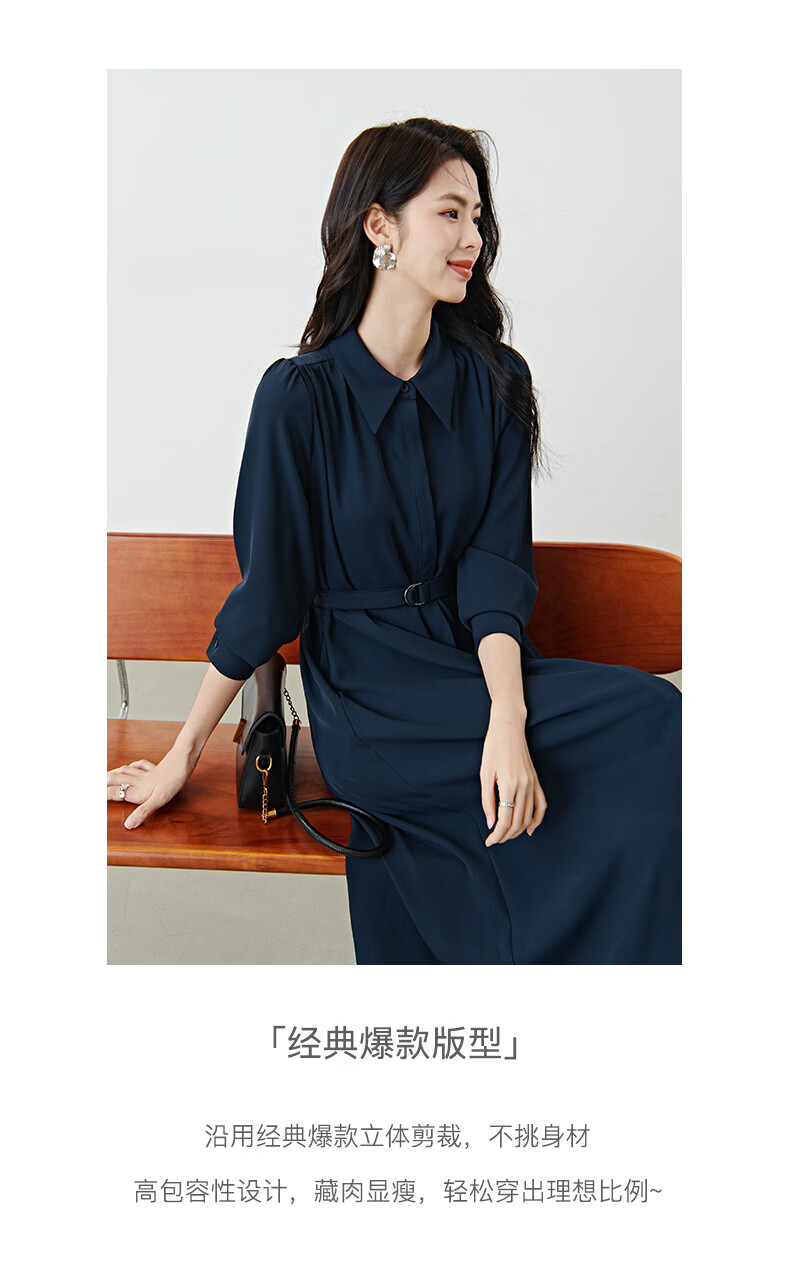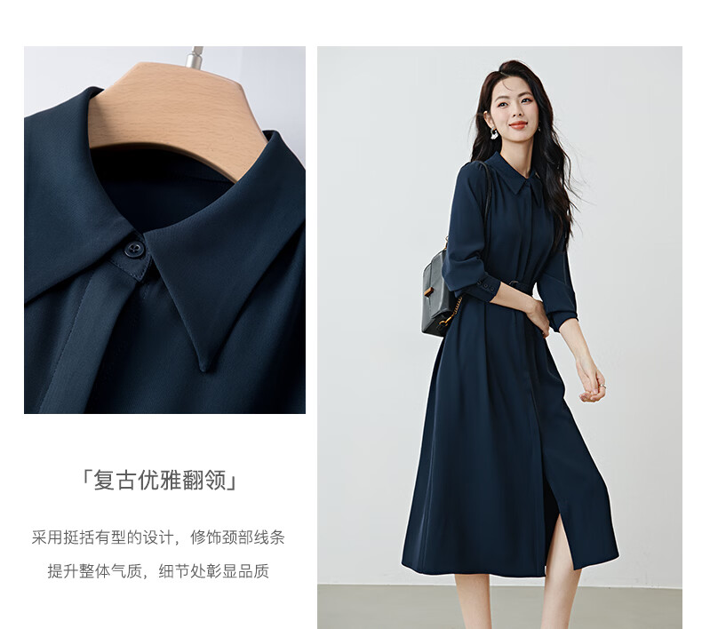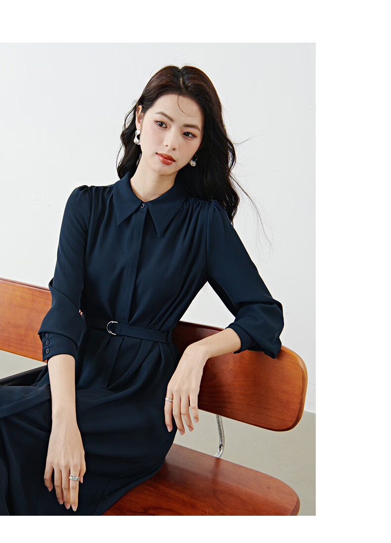 晚白2026春款经典翻领行政蓝正式场合裙子系带收腰垂坠抗皱衬衫连衣裙 深蓝色 L