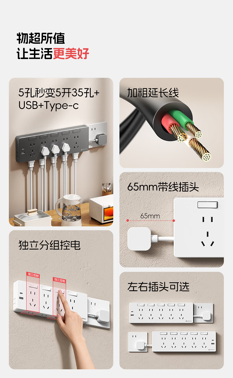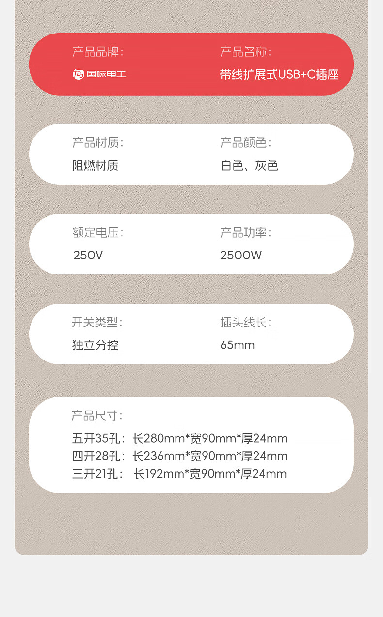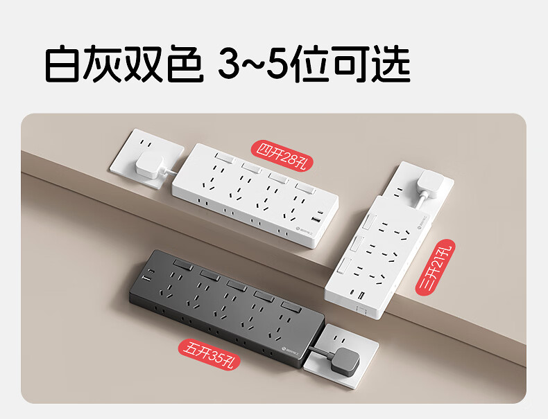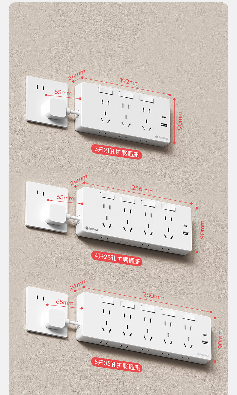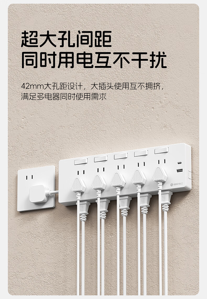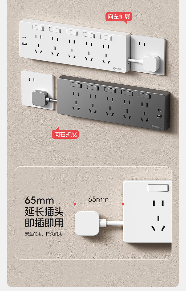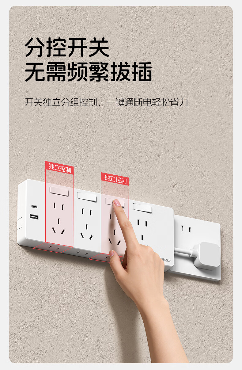 国际电工免接线扩展插座独立开关厨房家用排插多功能带线扩展插板一转多用 白色带线-3开21孔【U+C】2.1A-向左扩展