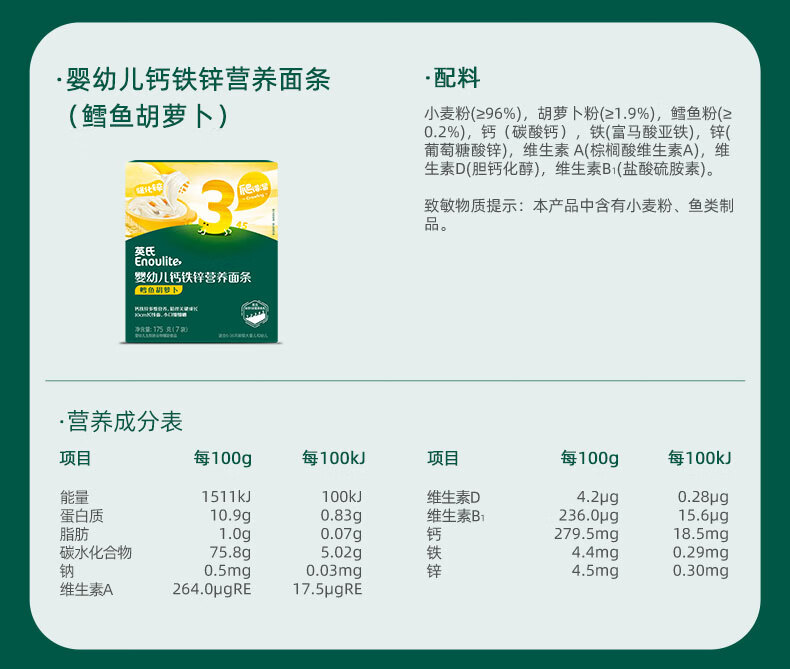英氏婴幼儿面条鳕鱼胡萝卜味175g 辅食线面儿童早餐营养长直面 真验厂