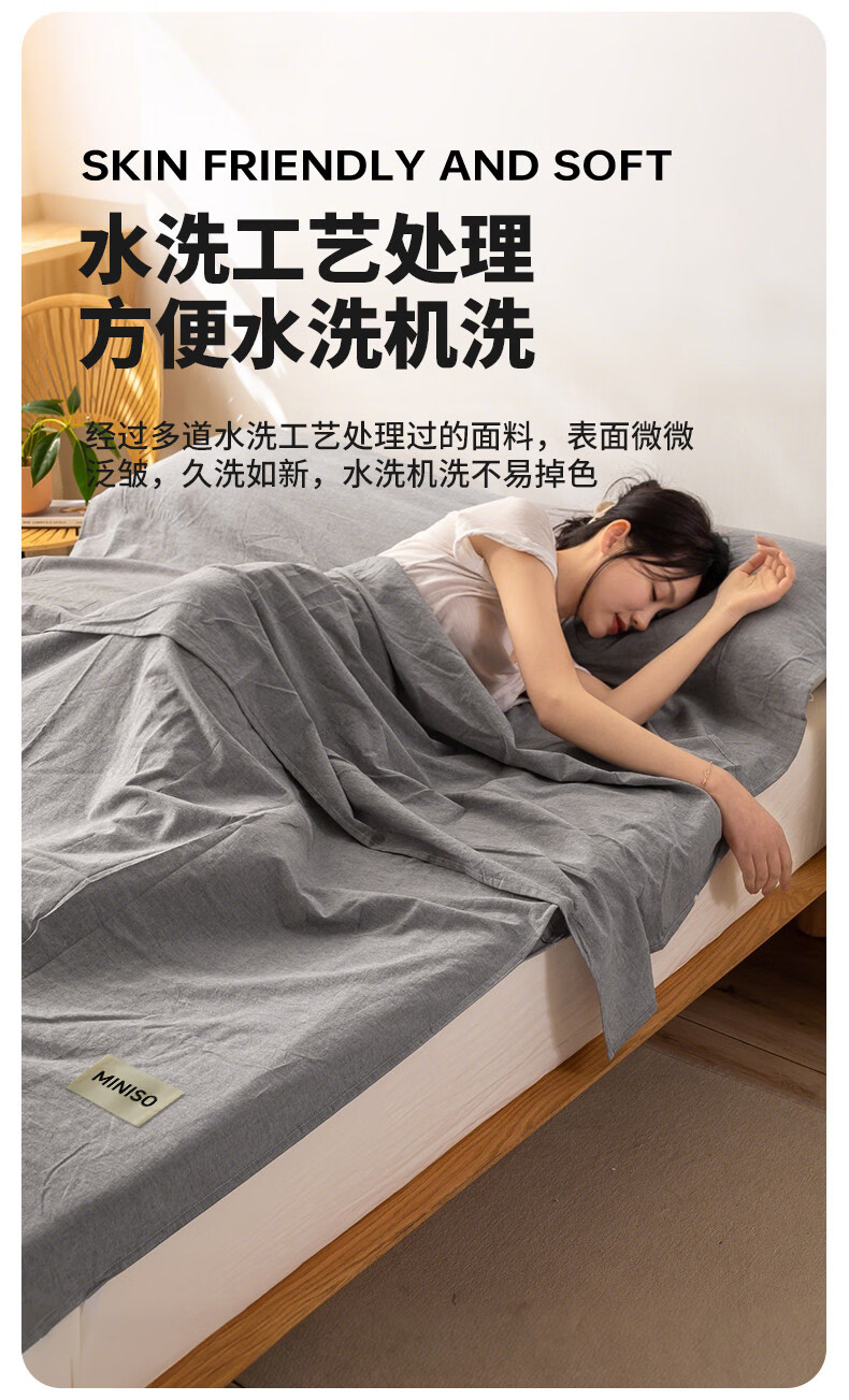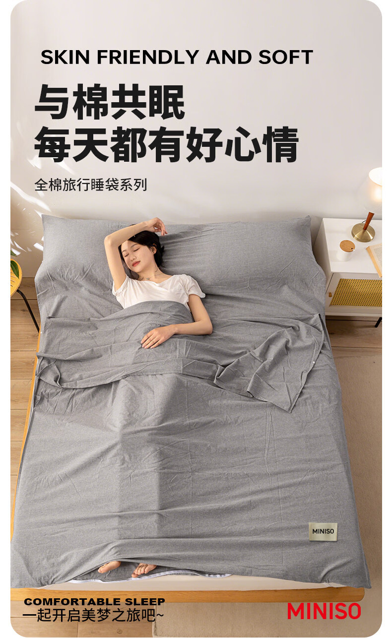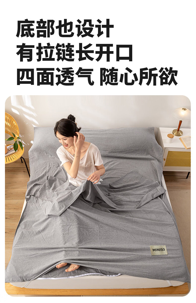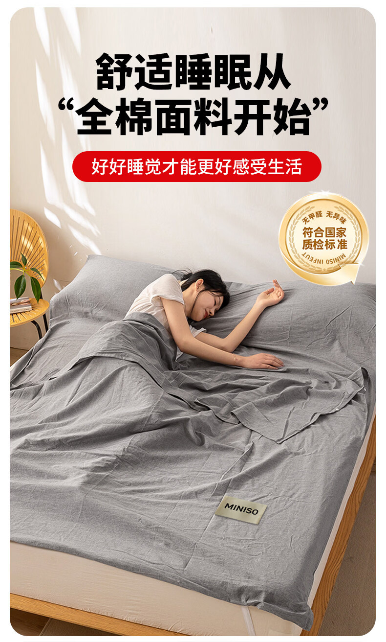 名创优品(MINISO)全棉旅行睡袋 出差旅行便捷式酒店隔脏被单床单被套一体式 miniso-浅灰 80cm*210cm