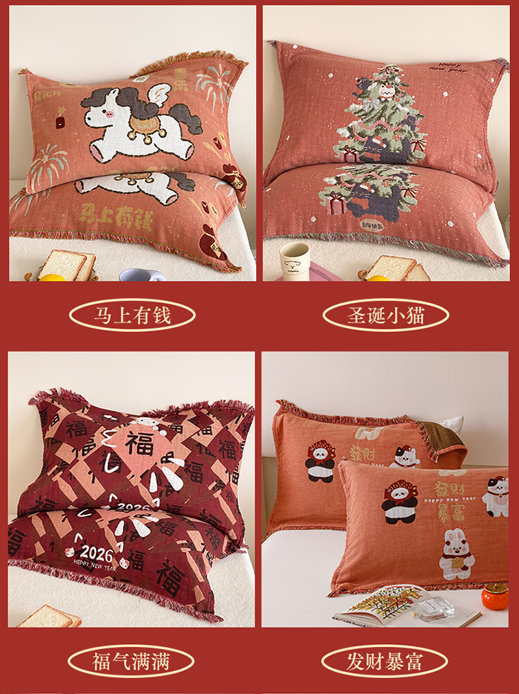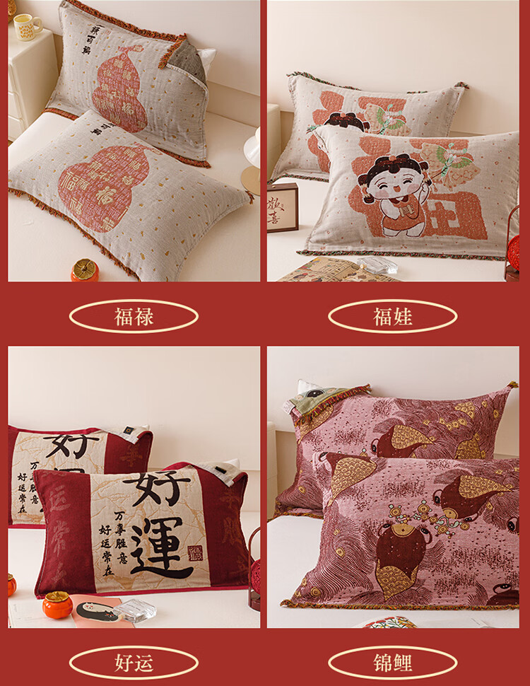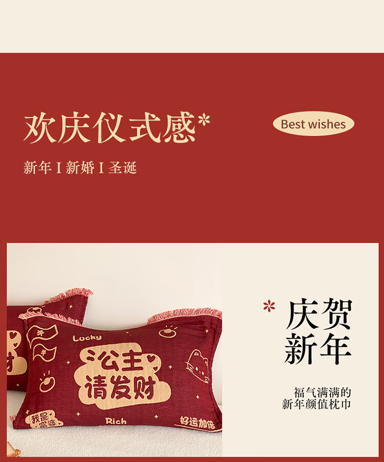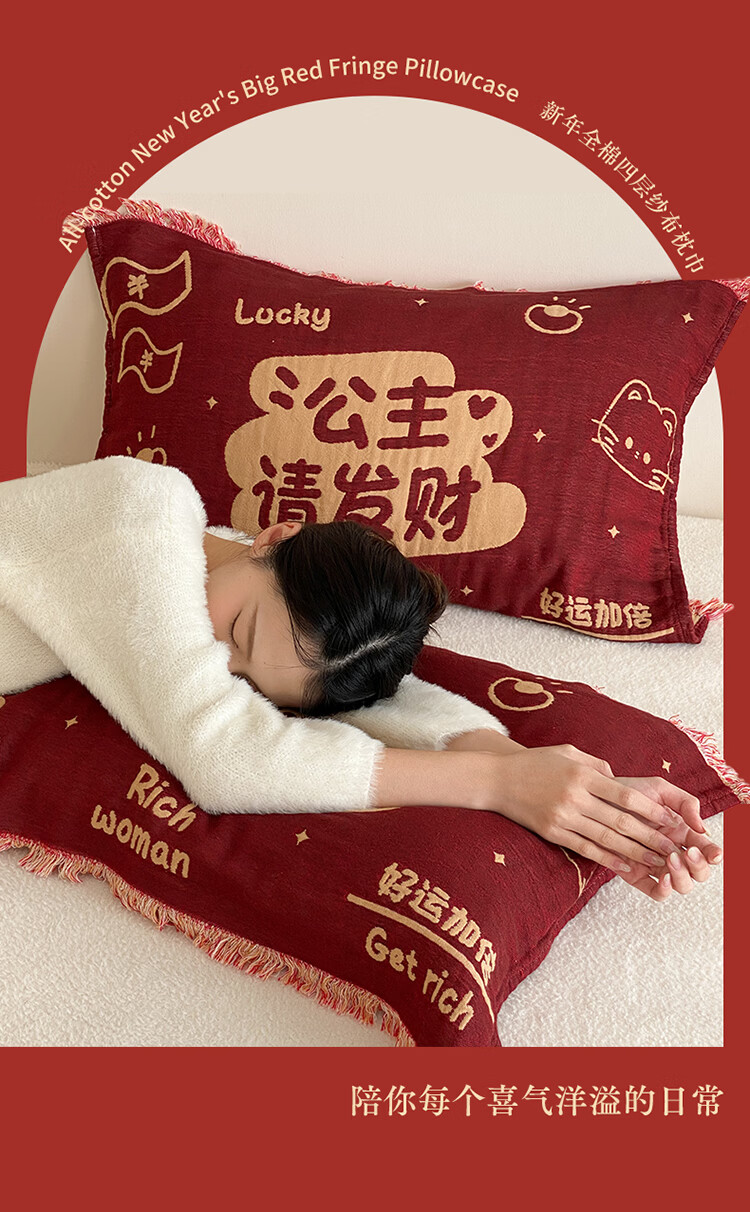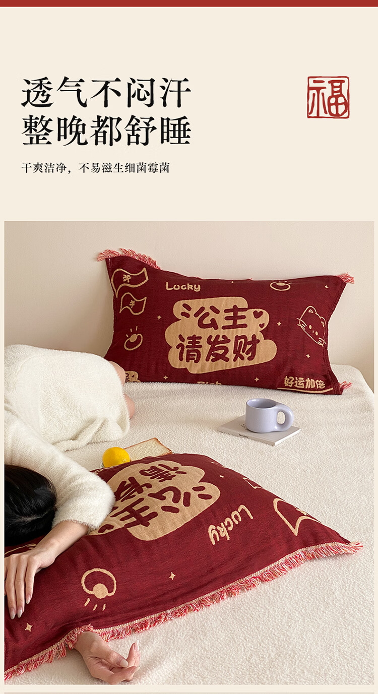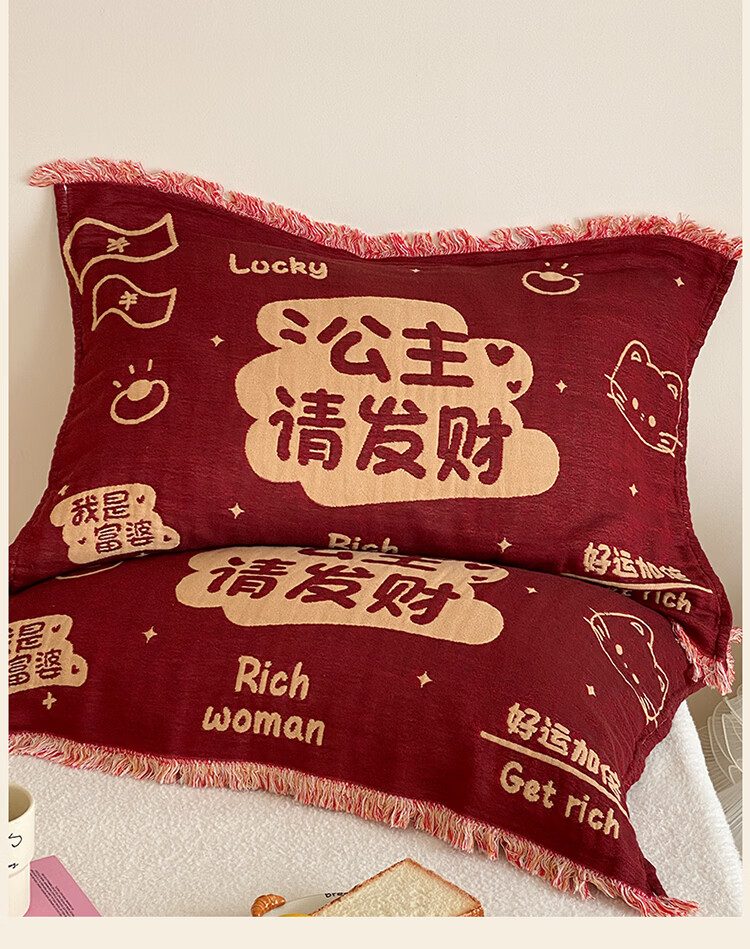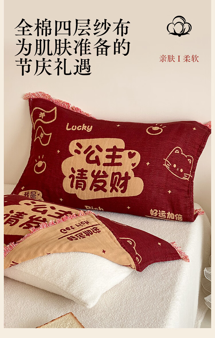 无印良品加厚枕巾全棉一对装100%纯棉纱布百福枕头巾2026新年款喜庆枕头套 公主发财【加厚全棉 四层纱布】 52cm*75cm 枕巾一对