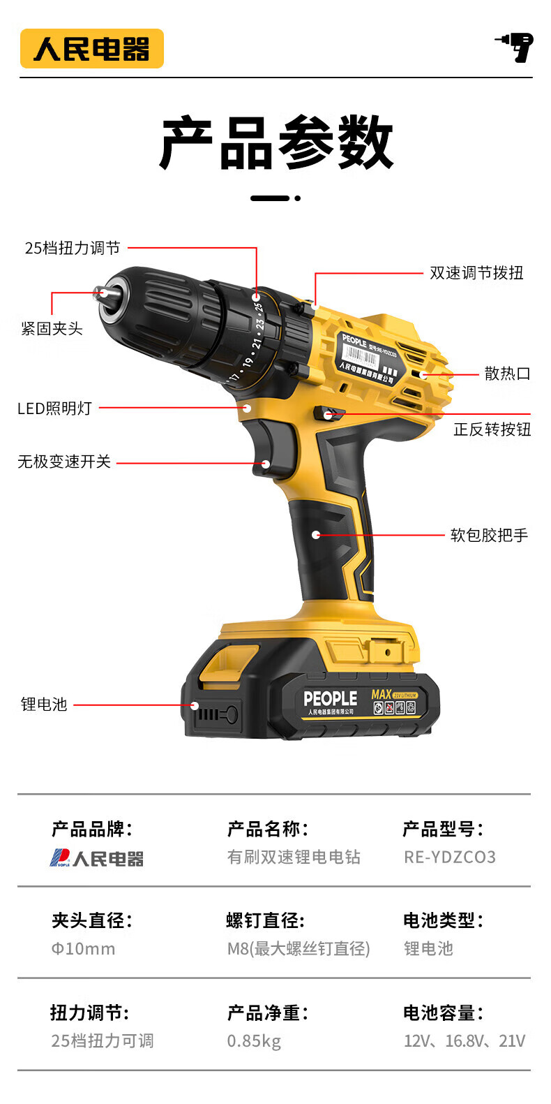 人民电钻钻墙打孔冲击钻三合一家用锂电池12V/16.8V/21V充电双速有刷 【12V】2电1充