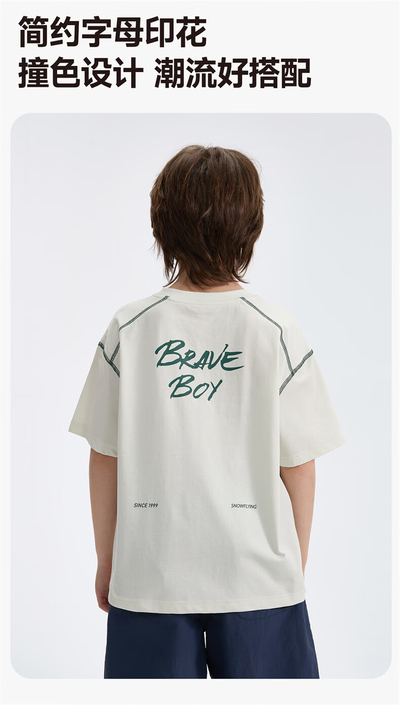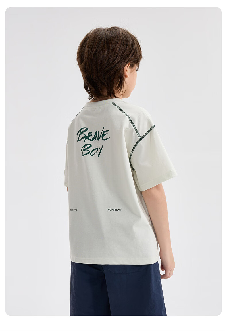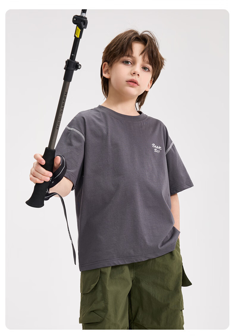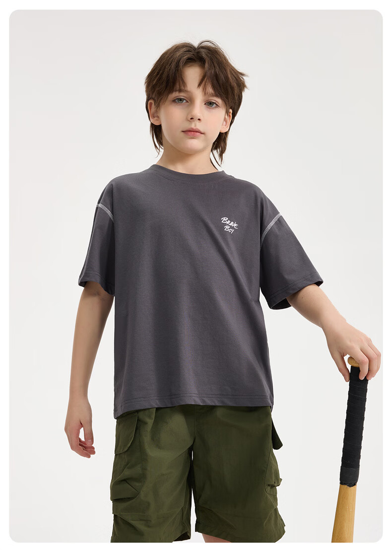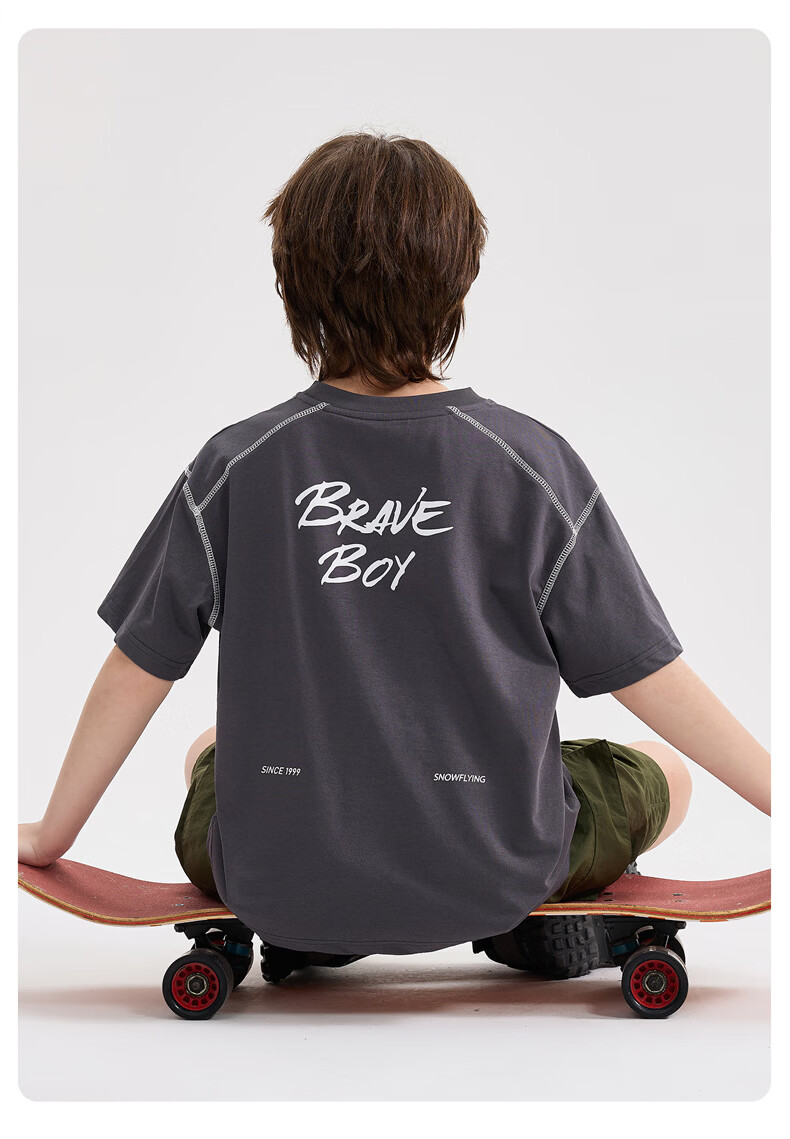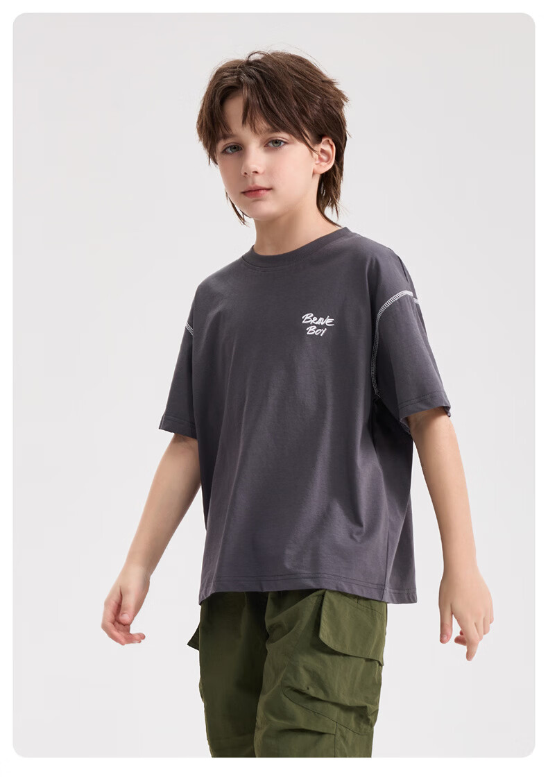 雪中飞童装男童短袖t恤撞色明线印花儿童t恤衫半袖2026新款夏季男孩上衣 深灰色 140