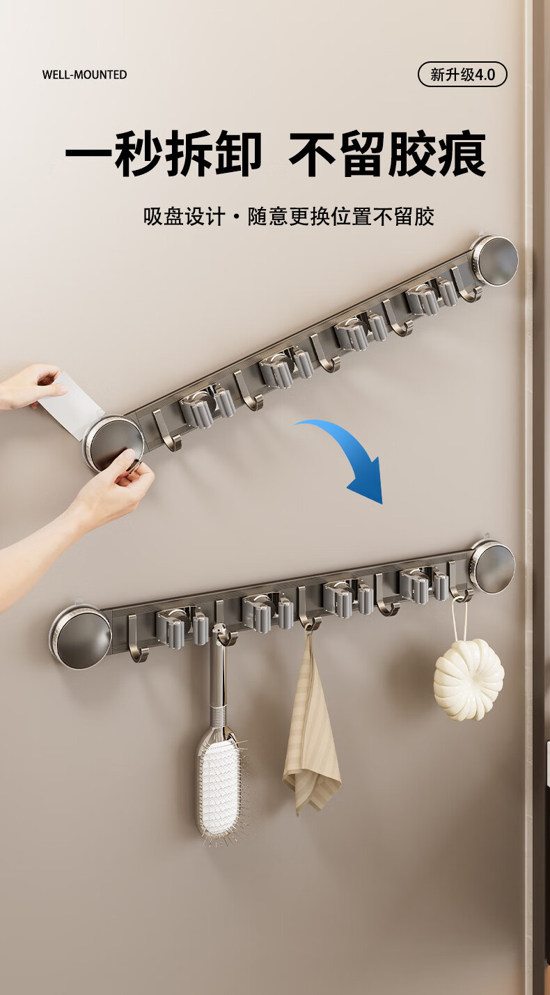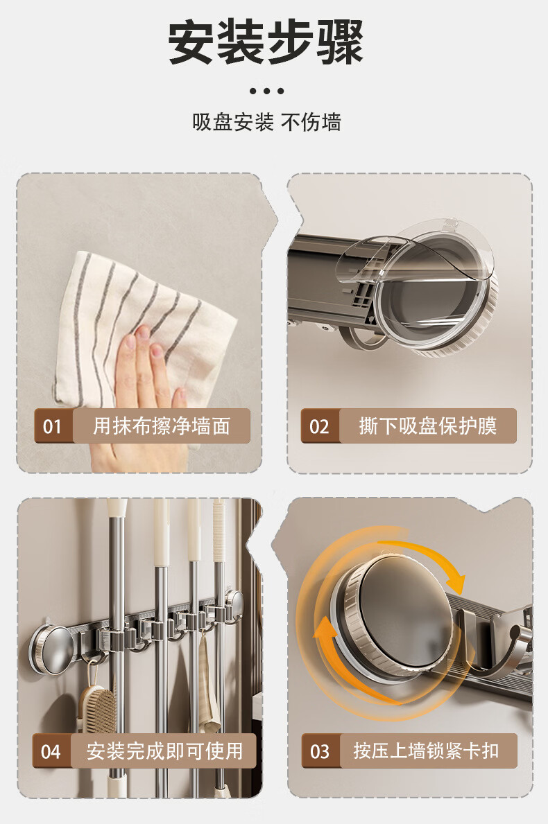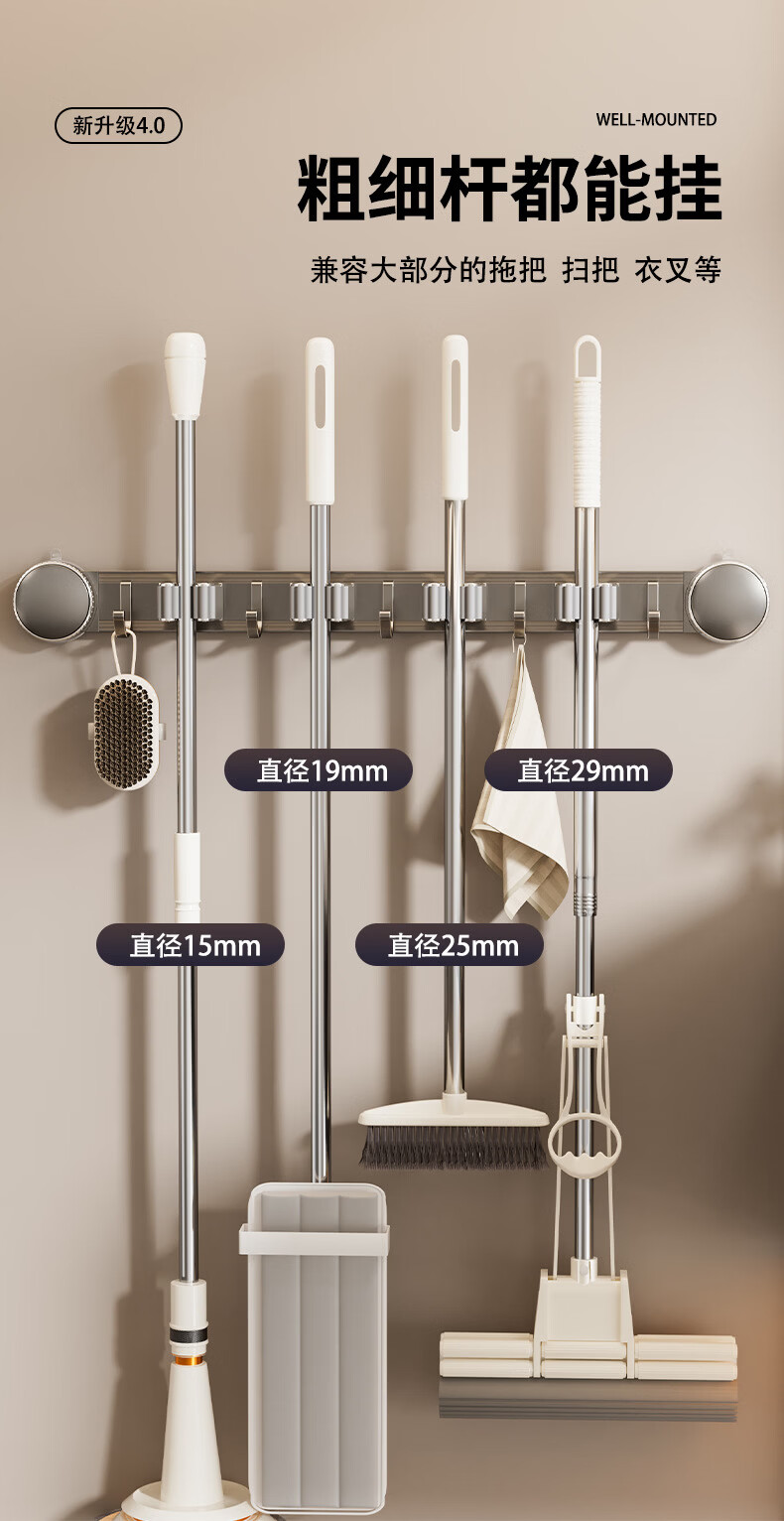 丹乐(DANLE)吸盘拖把壁挂夹卫生间免打孔墙上门后扫把拖布挂钩固定架收纳神器 奶油白-5夹6钩【吸盘式】