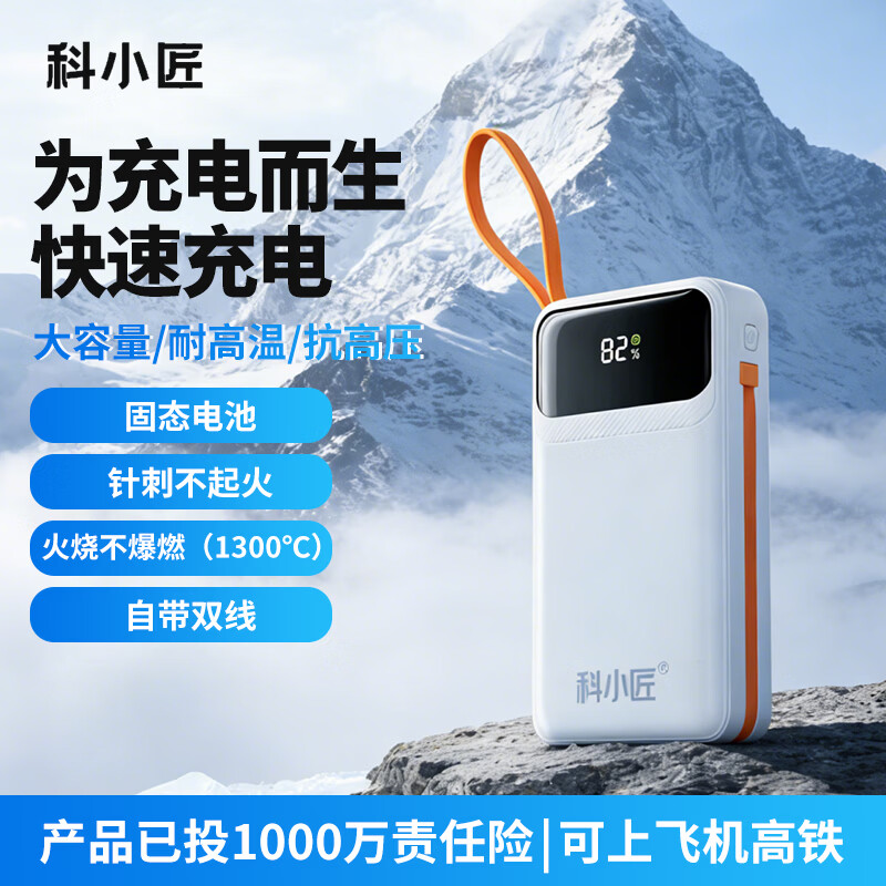 科小匠固态充电宝自带线16000mAh大容量【3C认证|可上飞机】固态充电宝22.5W快充苹果安卓通用 云白3c认证 16000毫安 可上飞机
