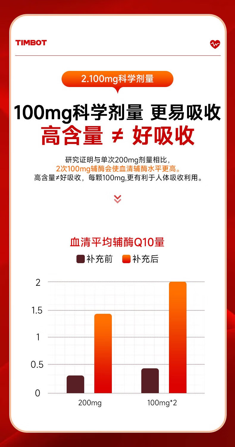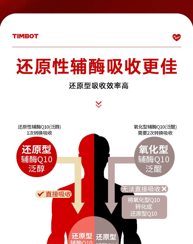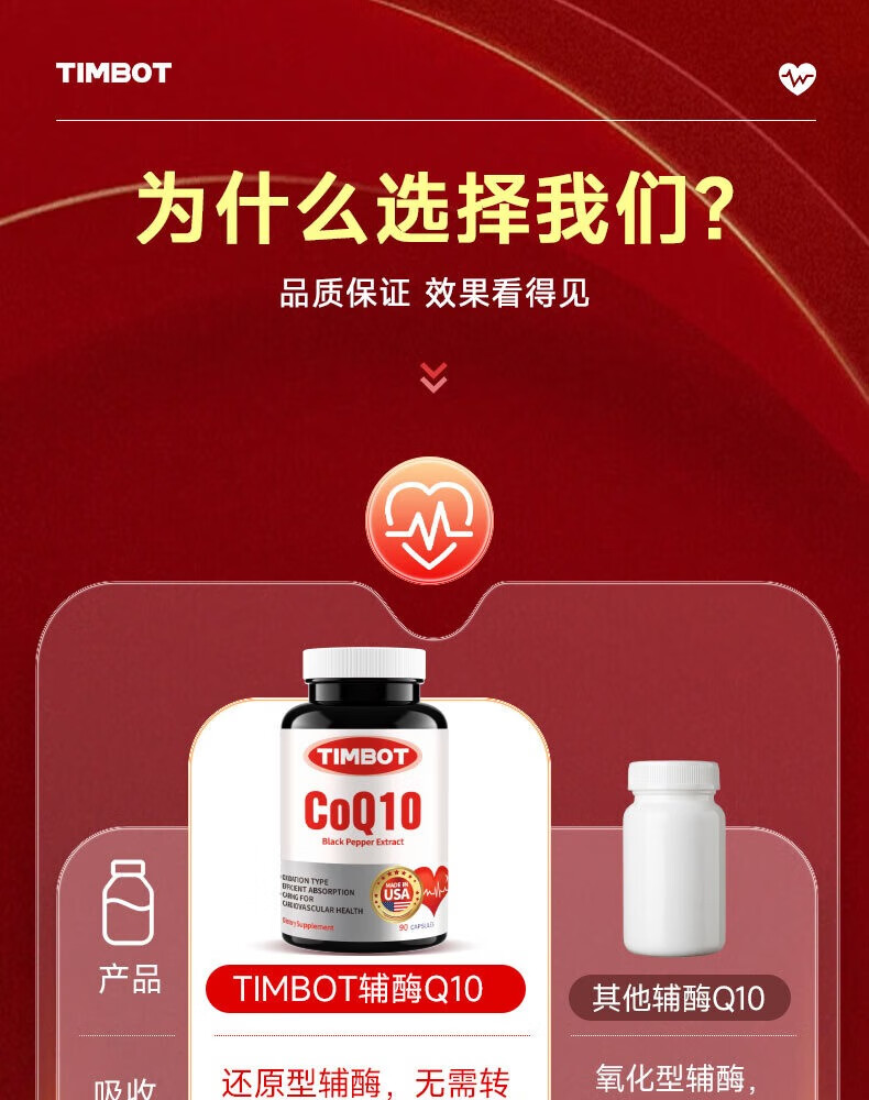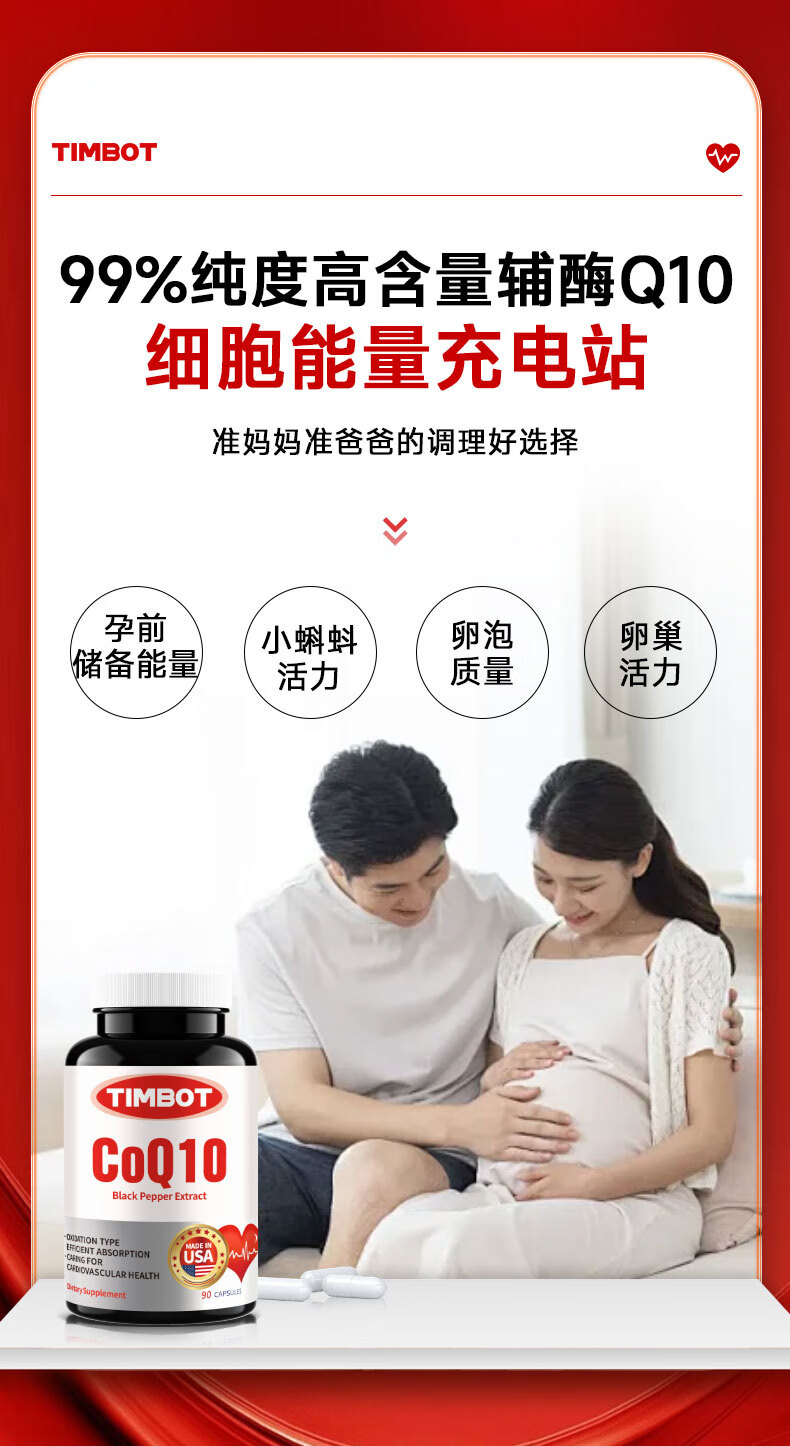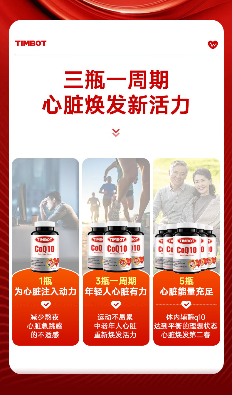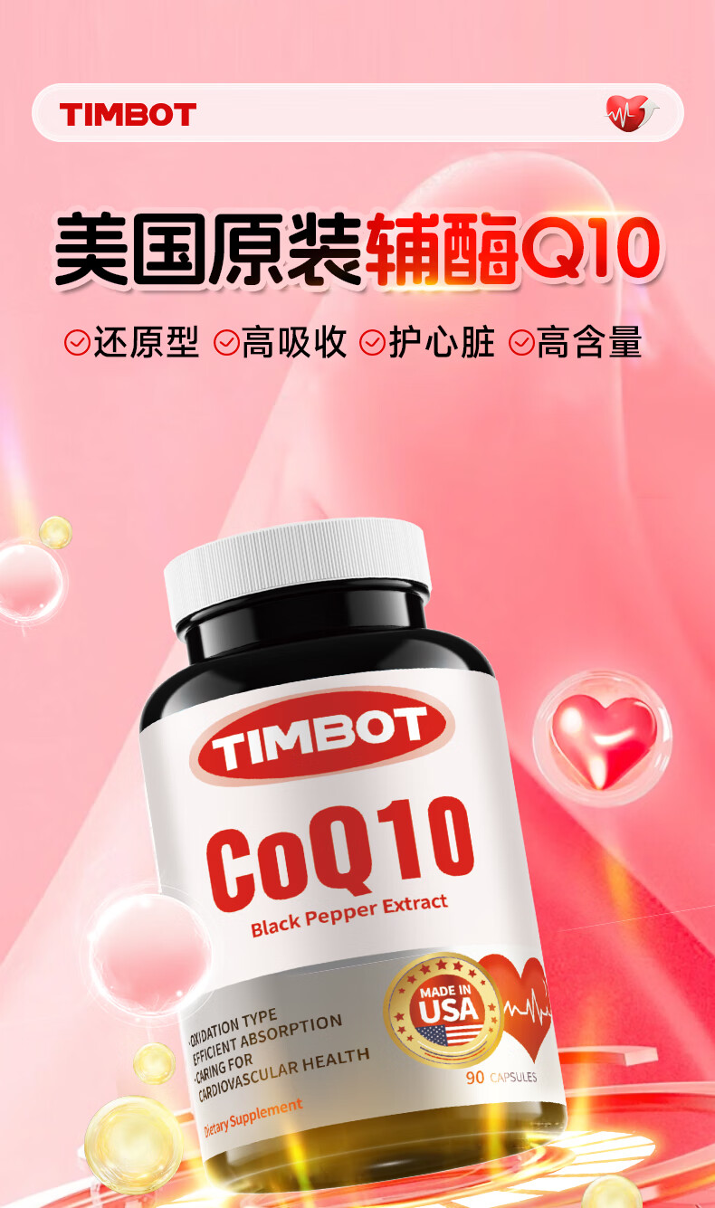 TIMBOT美国进口还原型辅酶q10每粒100mg保护心脏软胶囊 买3送2 90粒*5瓶 精力充沛【周期装】