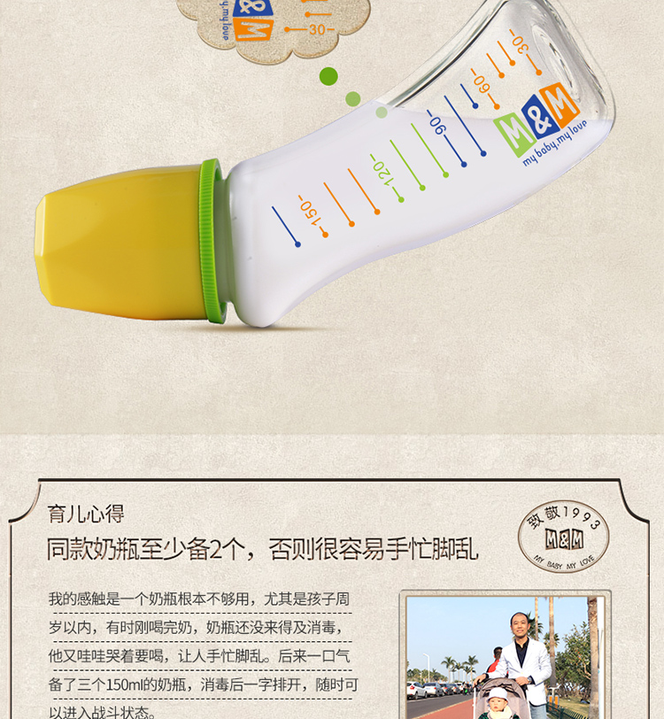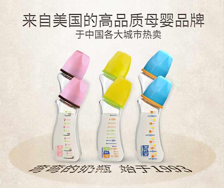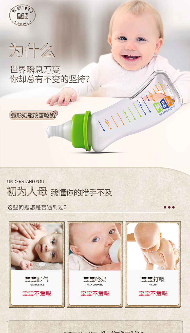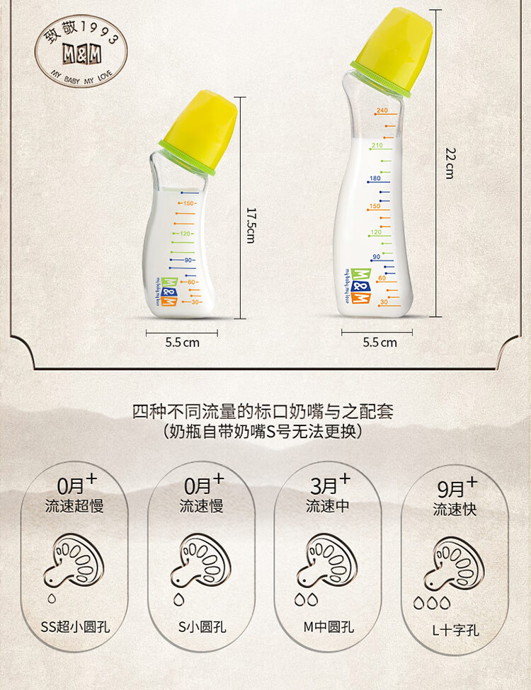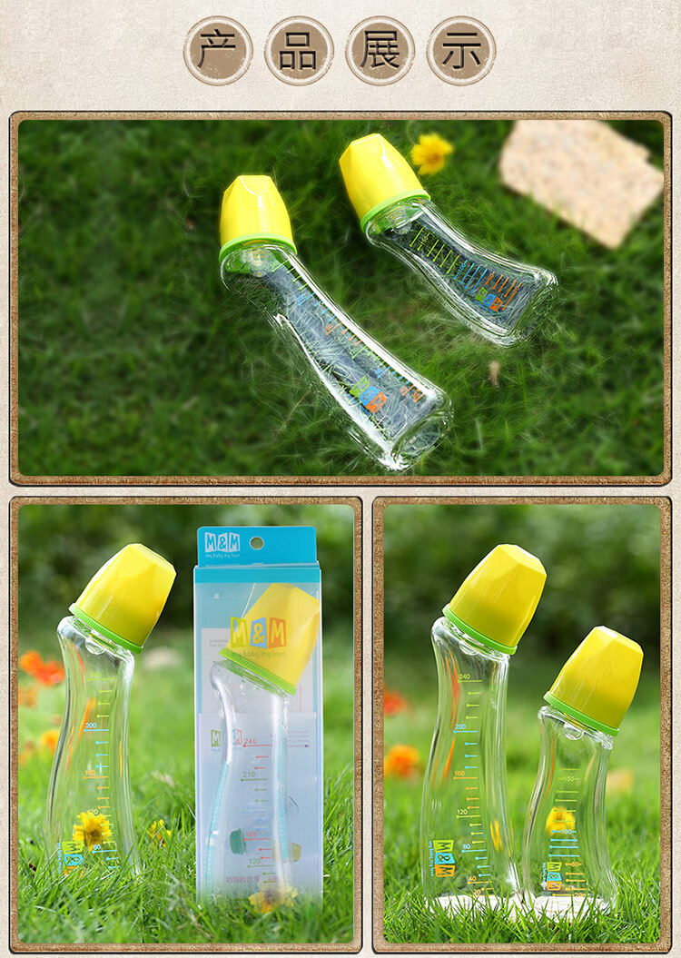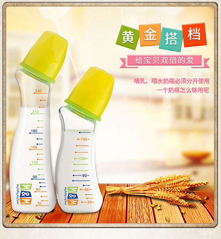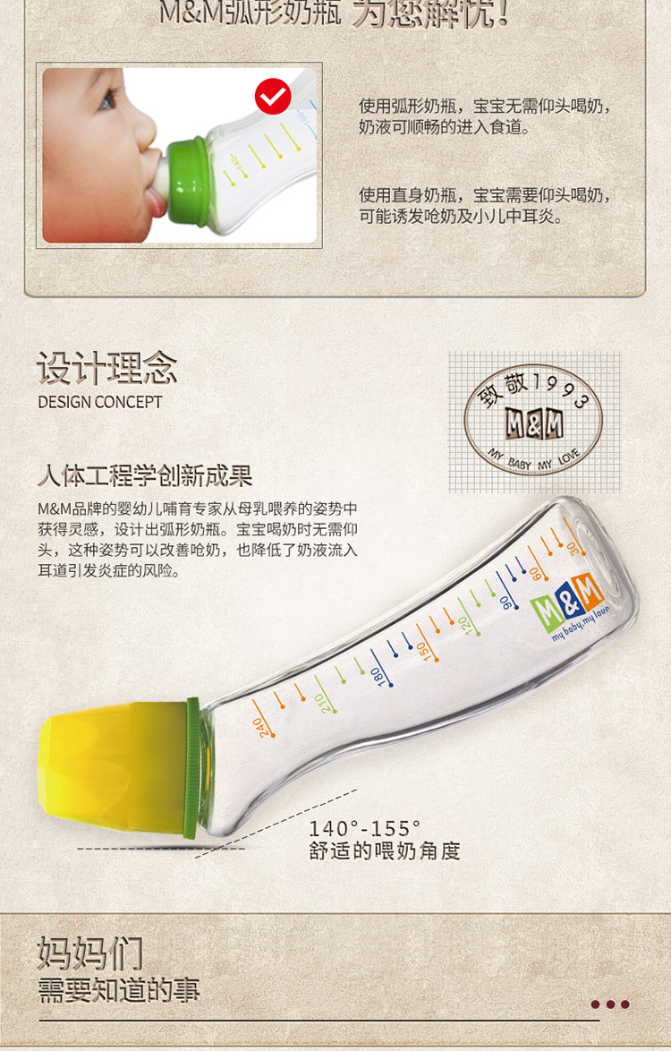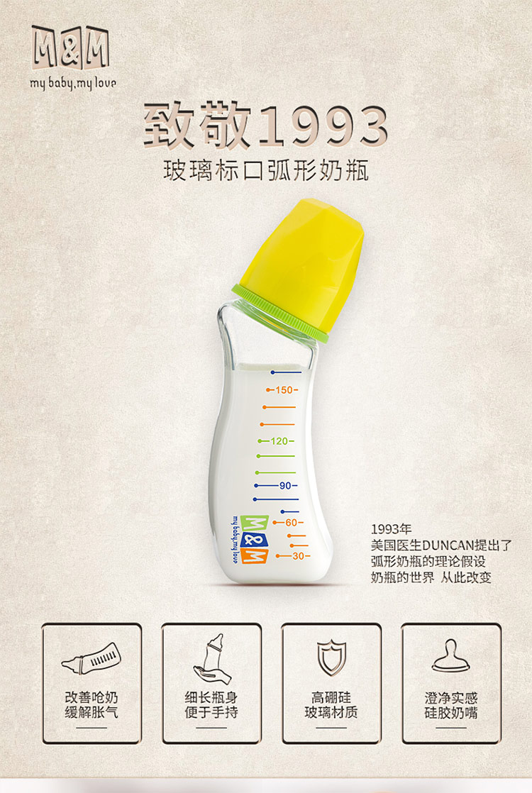 M&M弧形玻璃奶瓶 新生儿防胀气防误咽婴儿奶瓶喝水喂奶标准口径MM 经典款 150ml 【S号+M号奶嘴】