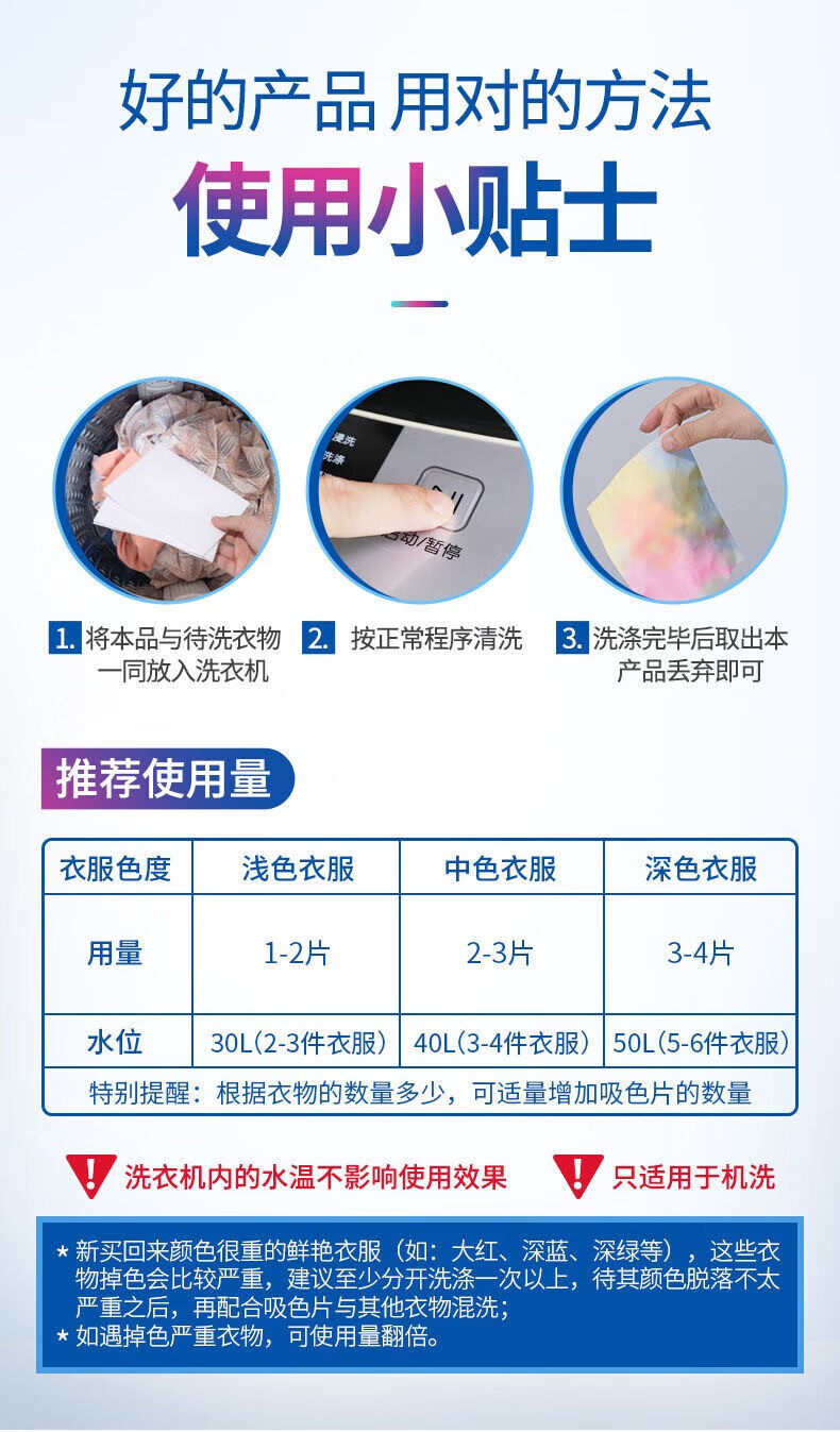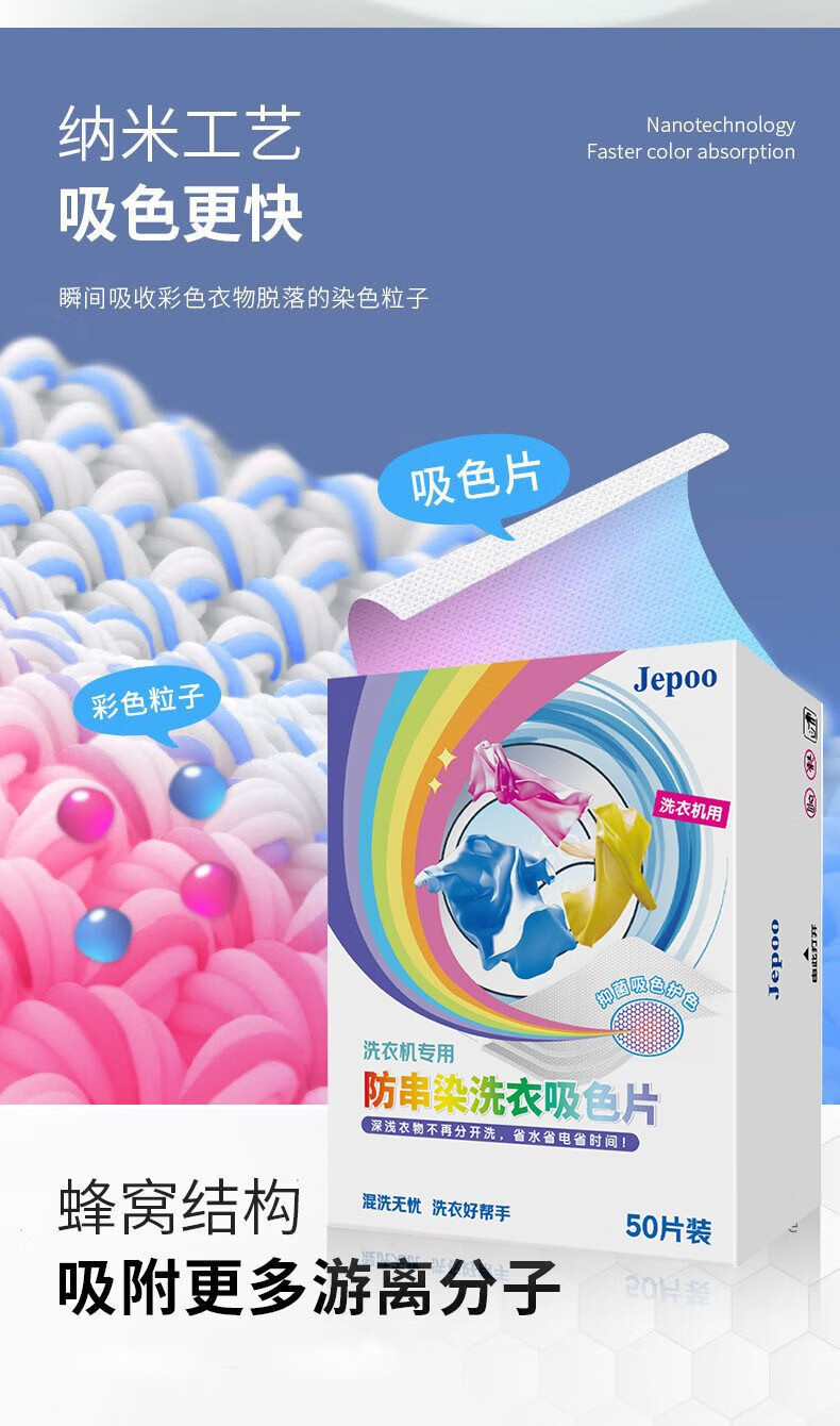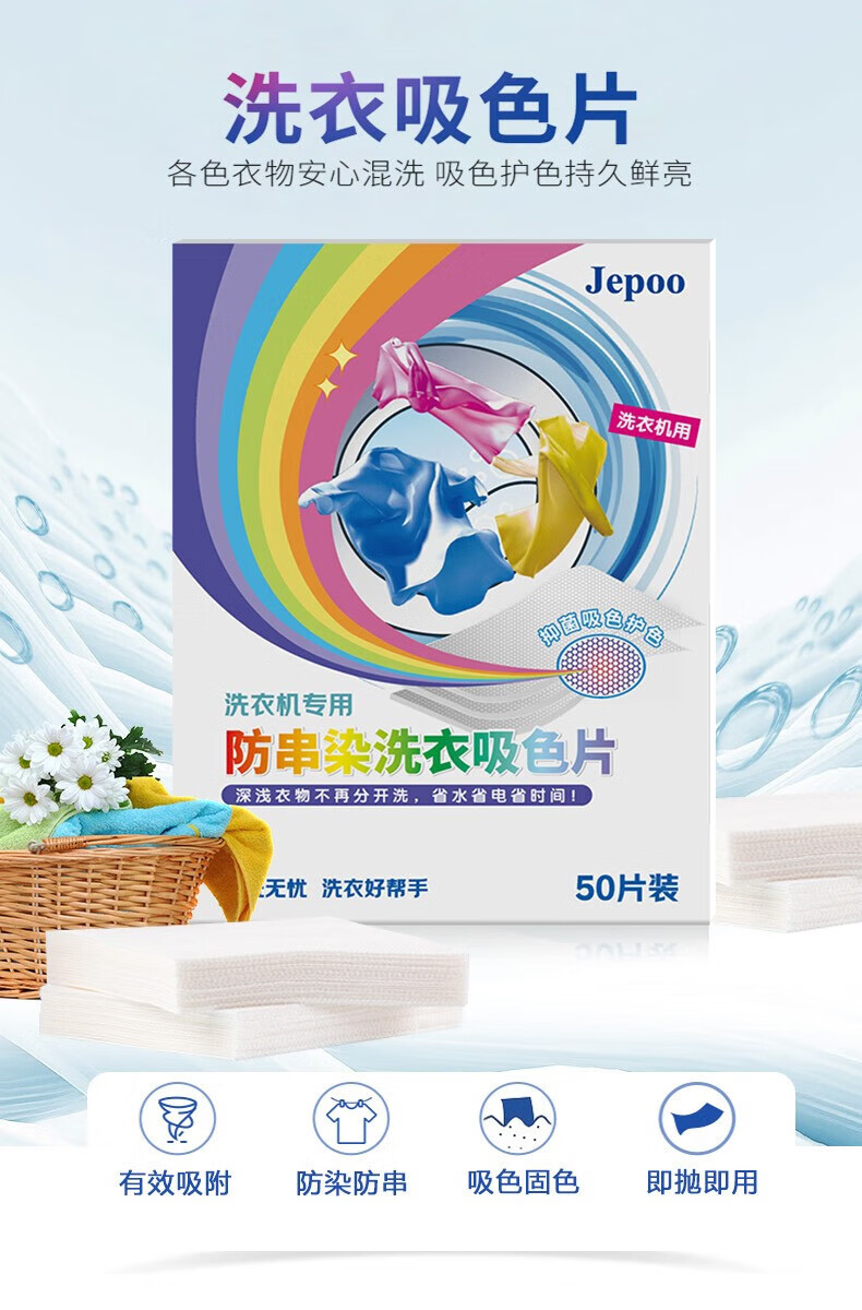 Jepoo防染色片 洗衣吸色片 抑菌99%混洗衣物防窜色母片 一盒 50片装