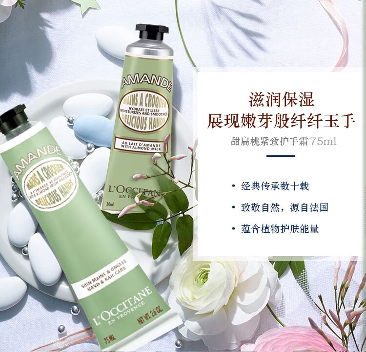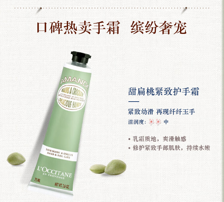 欧舒丹甜扁桃护手霜75ml紧致弹润抗皱保湿轻盈不粘腻法国男女士礼物