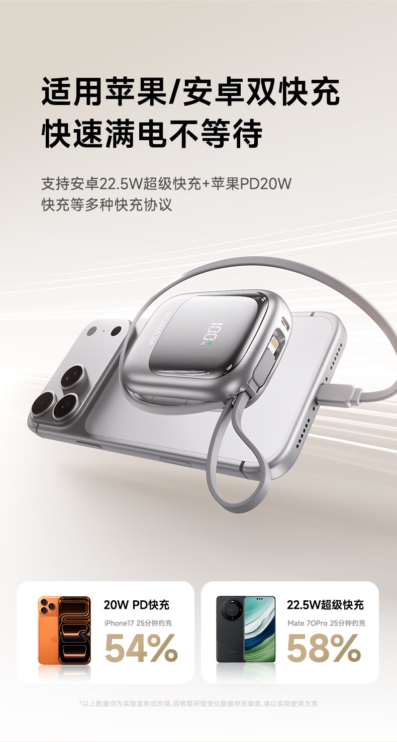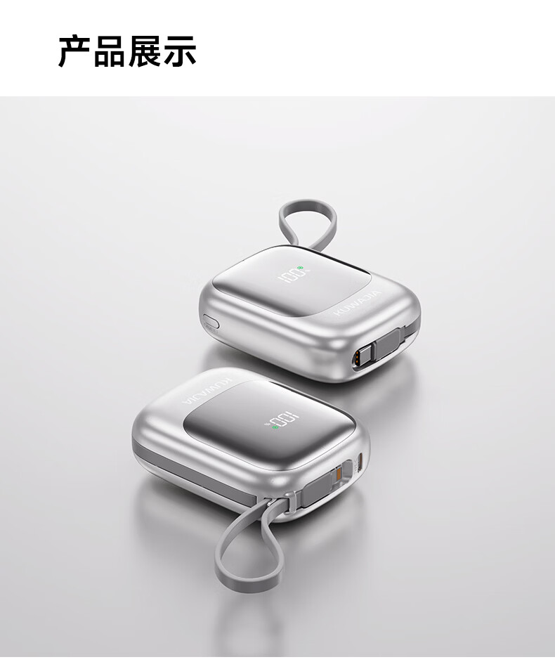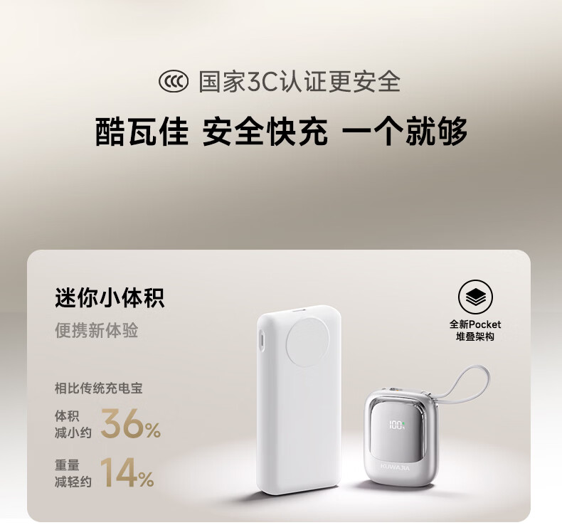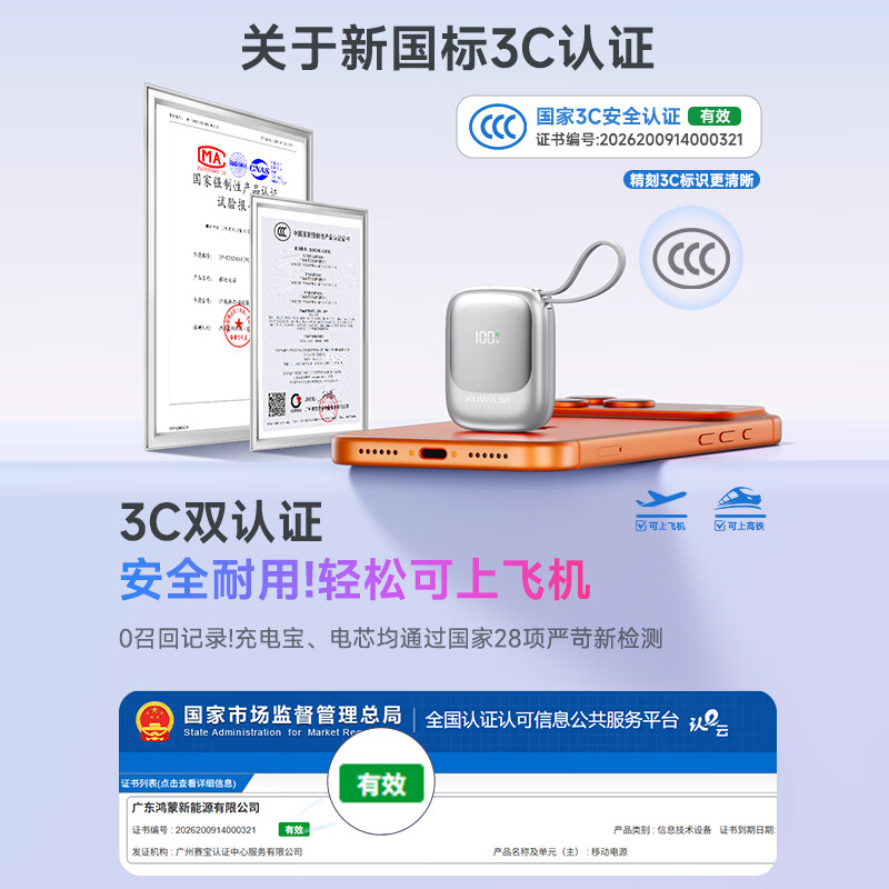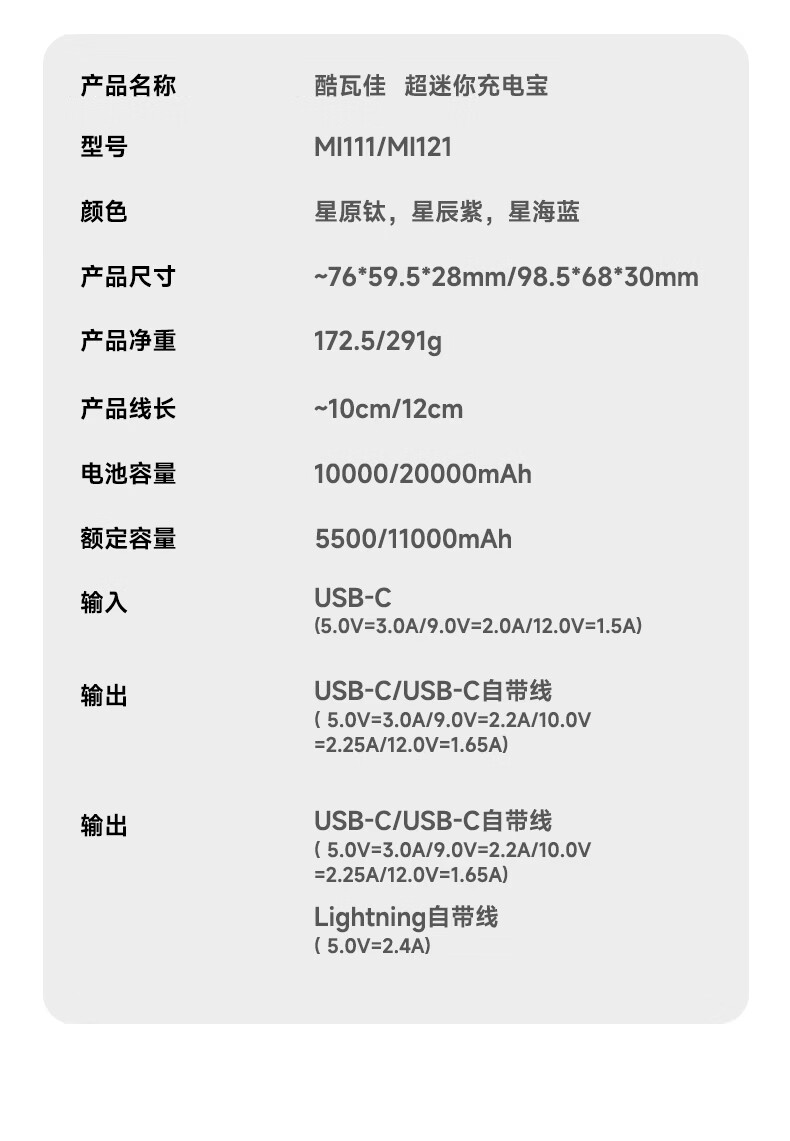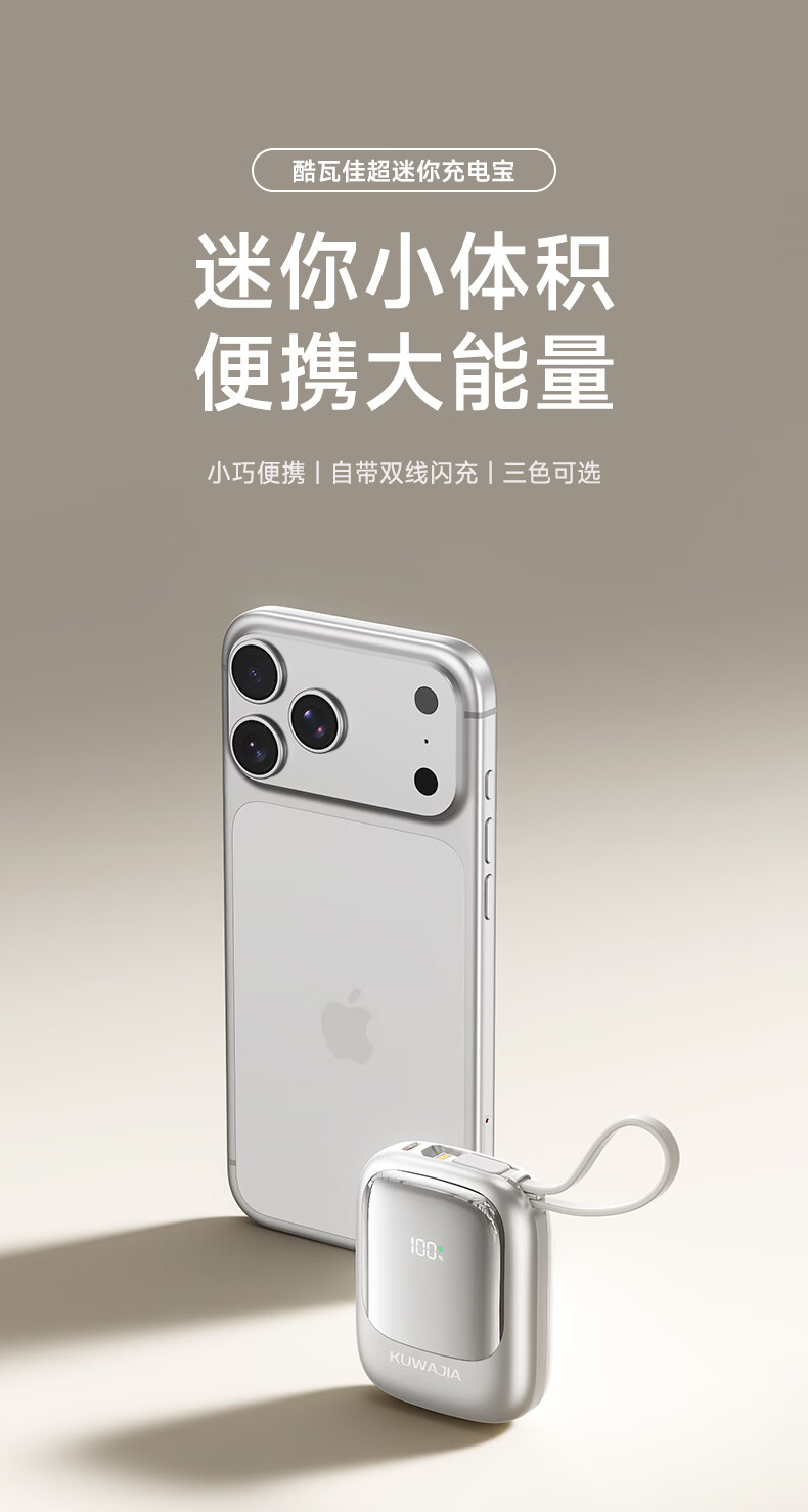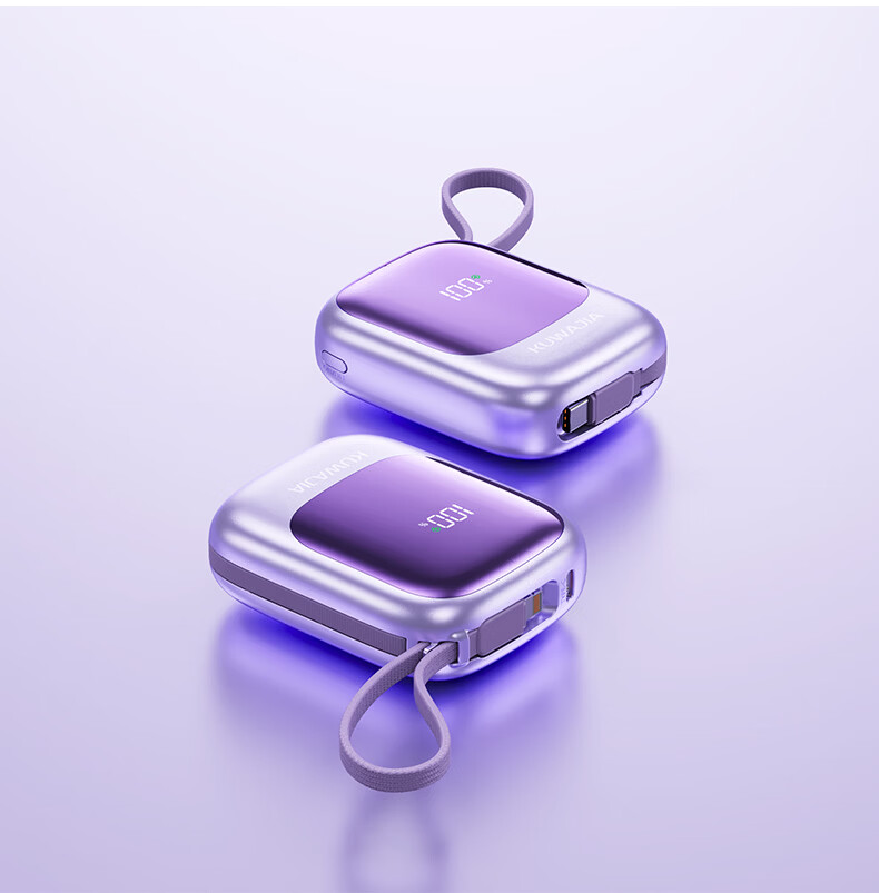 酷瓦佳【2026新升级】充电宝20000毫安3c认证自带线可上飞机快充小巧便携适配Air苹果17华为小米 【紫丨1w毫安】苹果+type-C双线