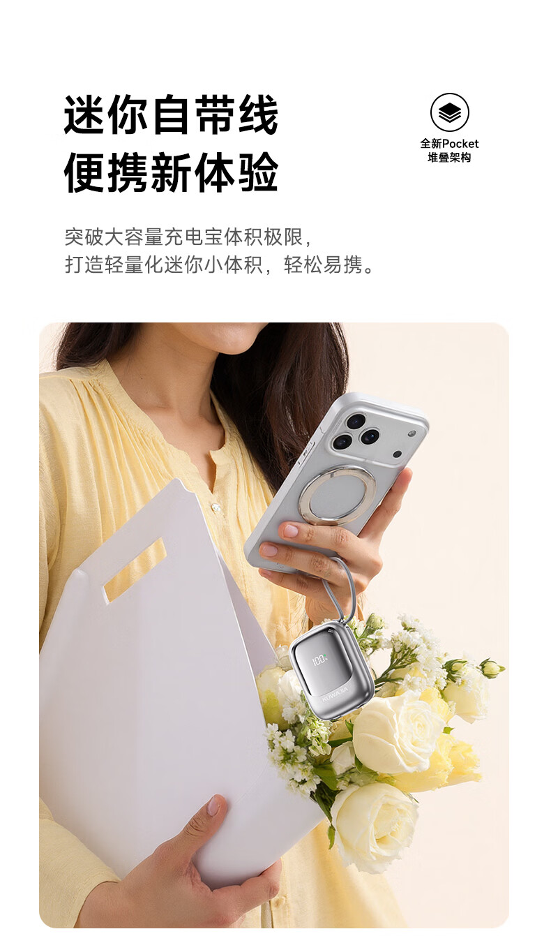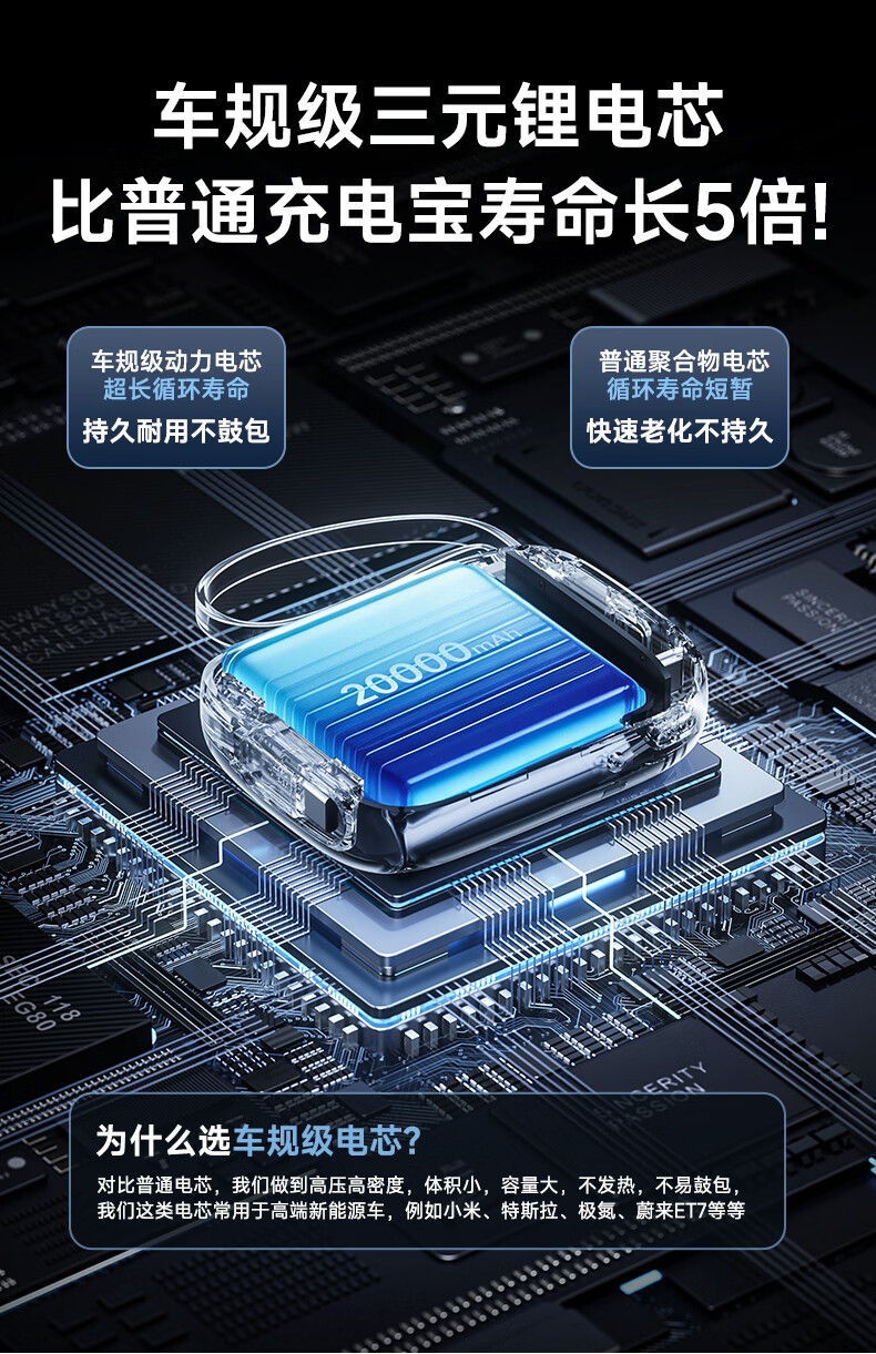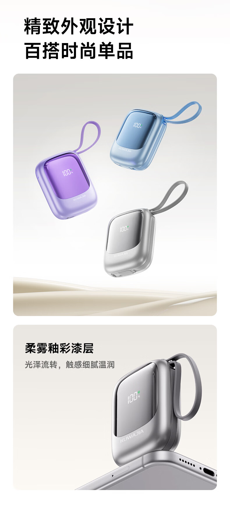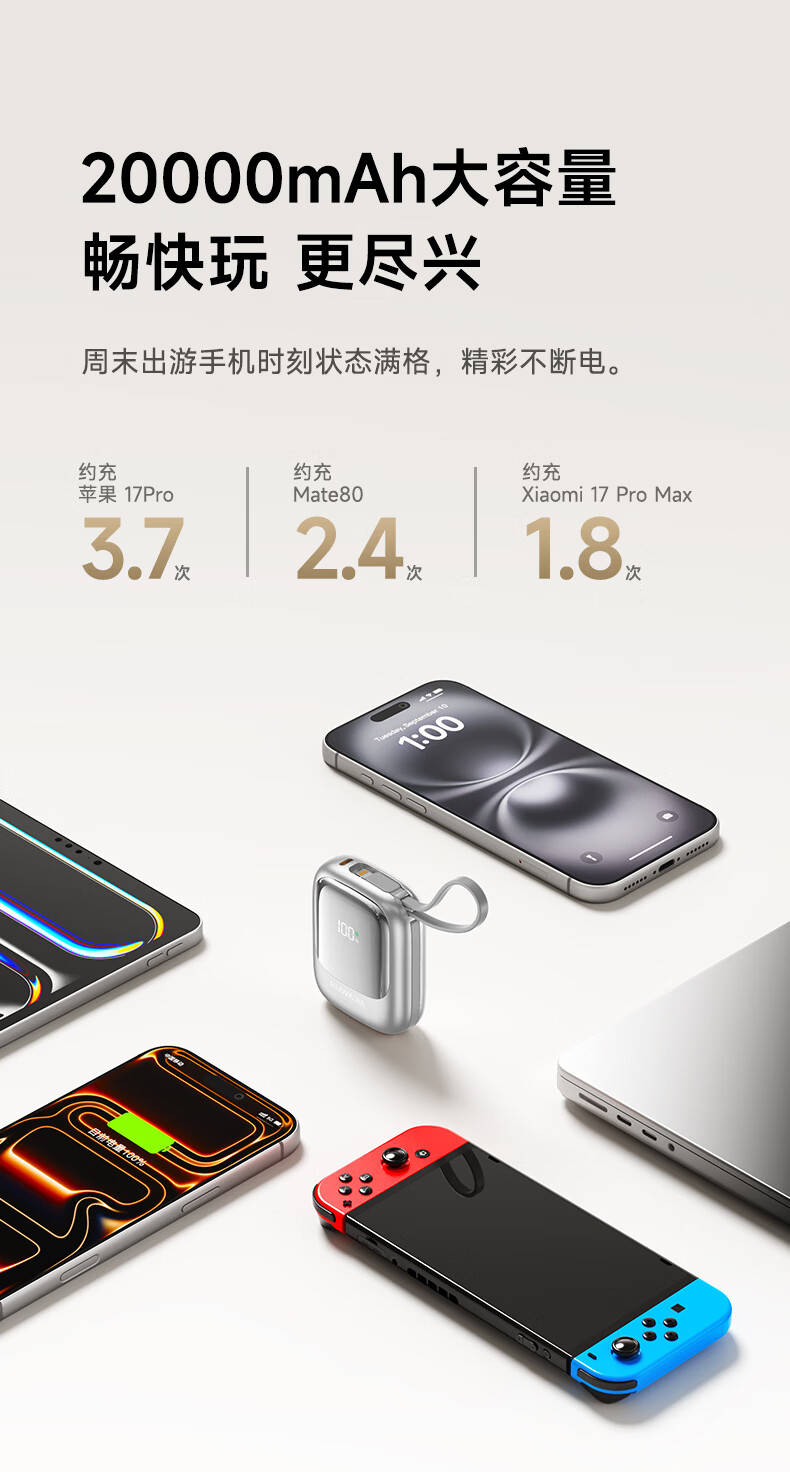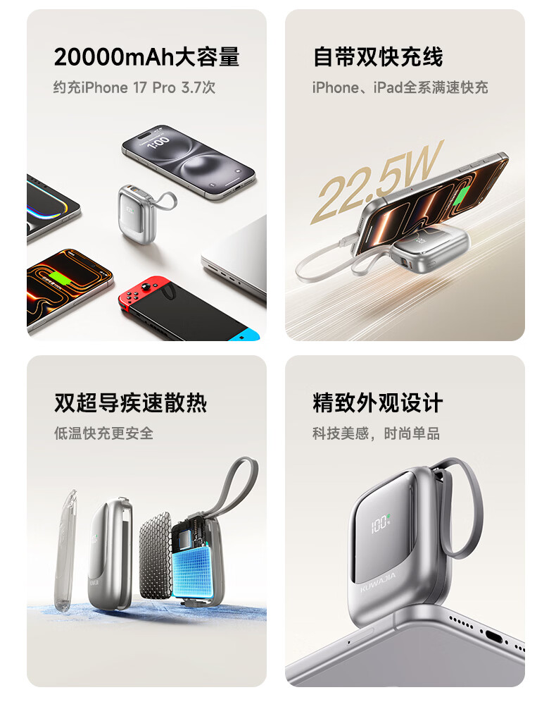 酷瓦佳【2026新升级】充电宝20000毫安3c认证自带线可上飞机快充小巧便携适配Air苹果17华为小米 【紫丨1w毫安】苹果+type-C双线