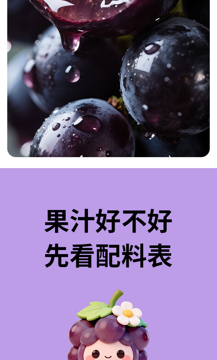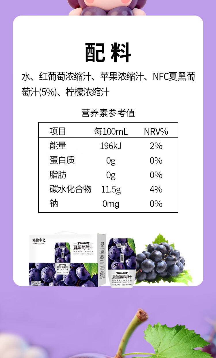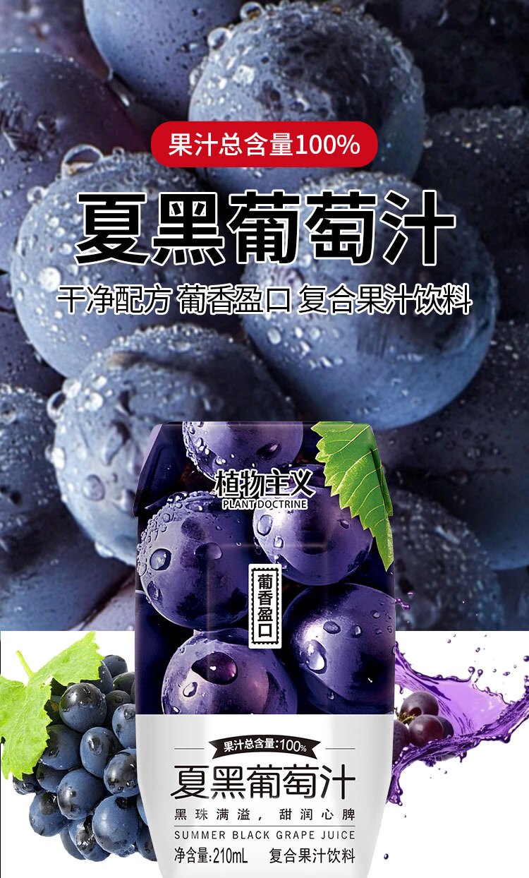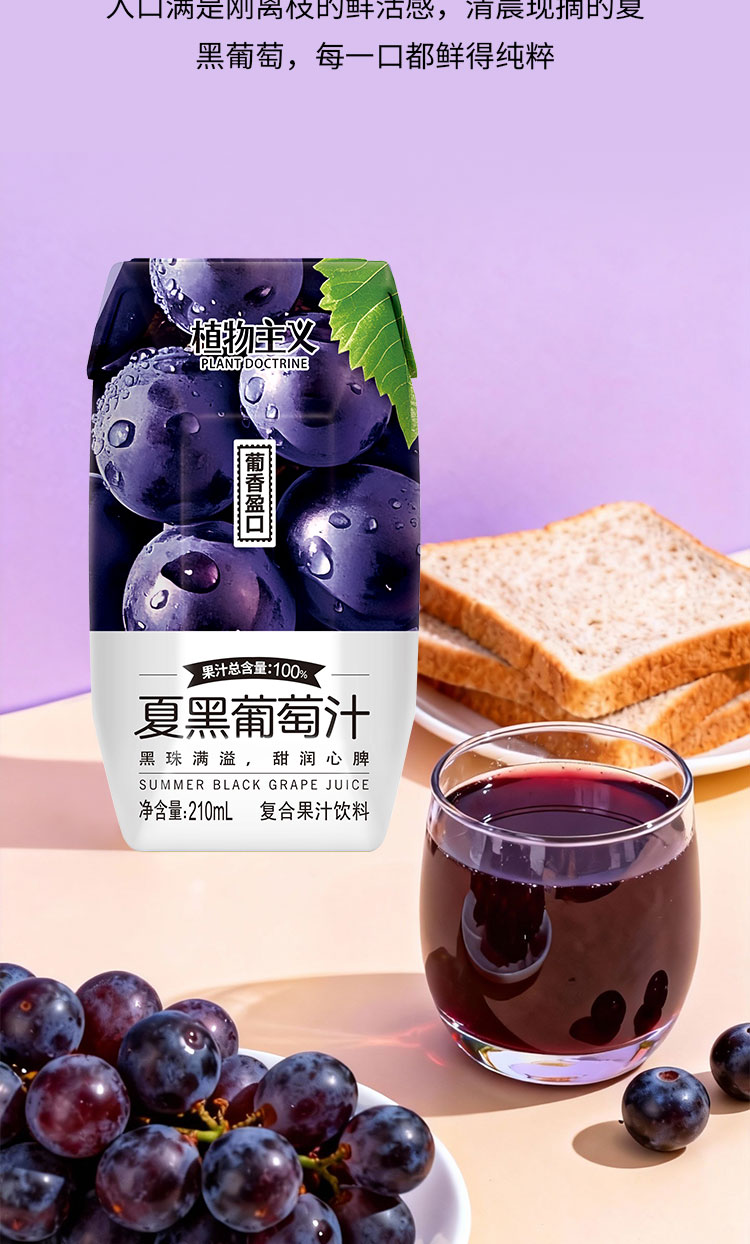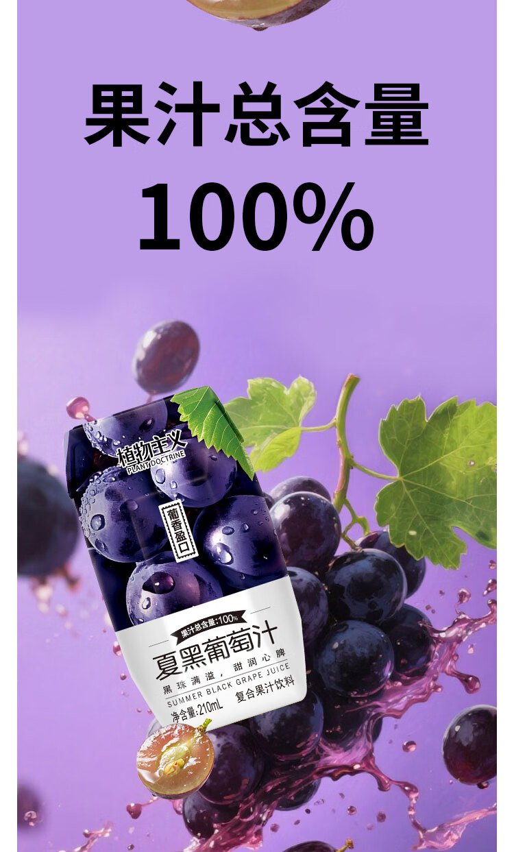 植物主义夏黑葡萄汁12瓶100%果汁干净配方0添加剂0蔗糖添加复合果汁饮料品 夏黑葡萄汁210ML*12瓶整箱(100%果汁)