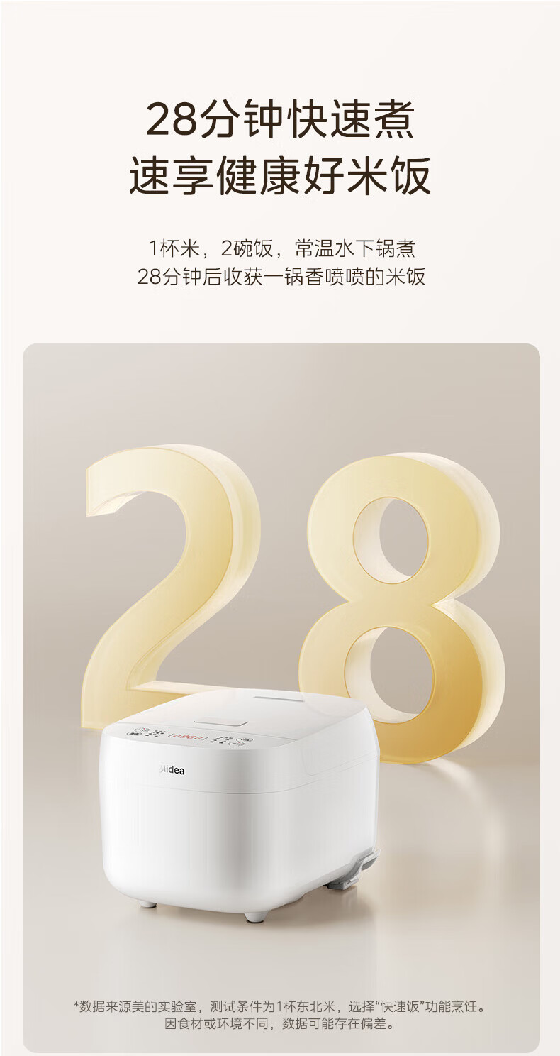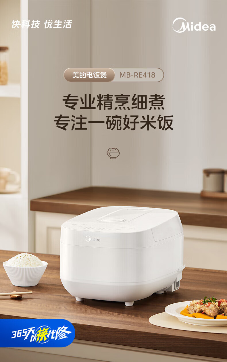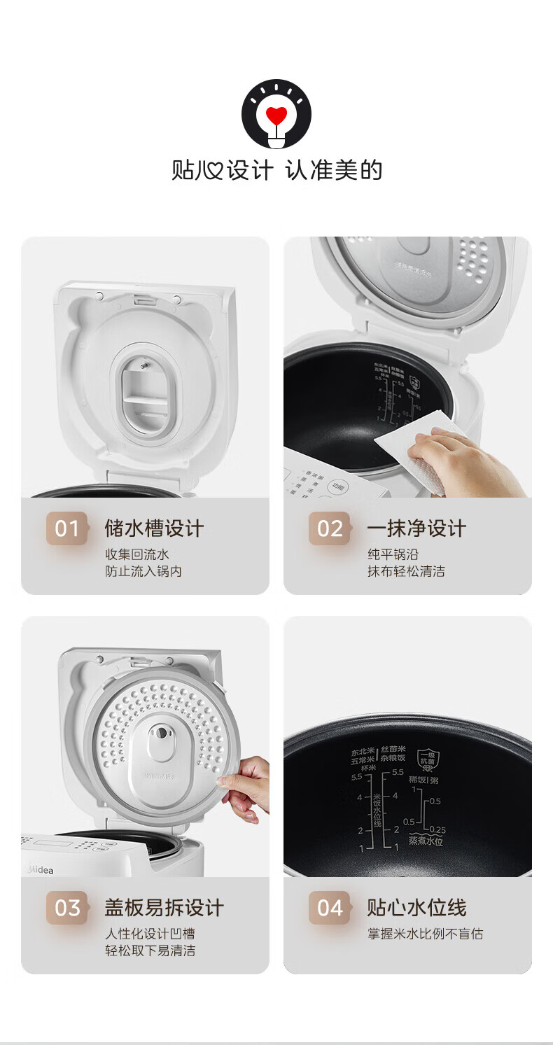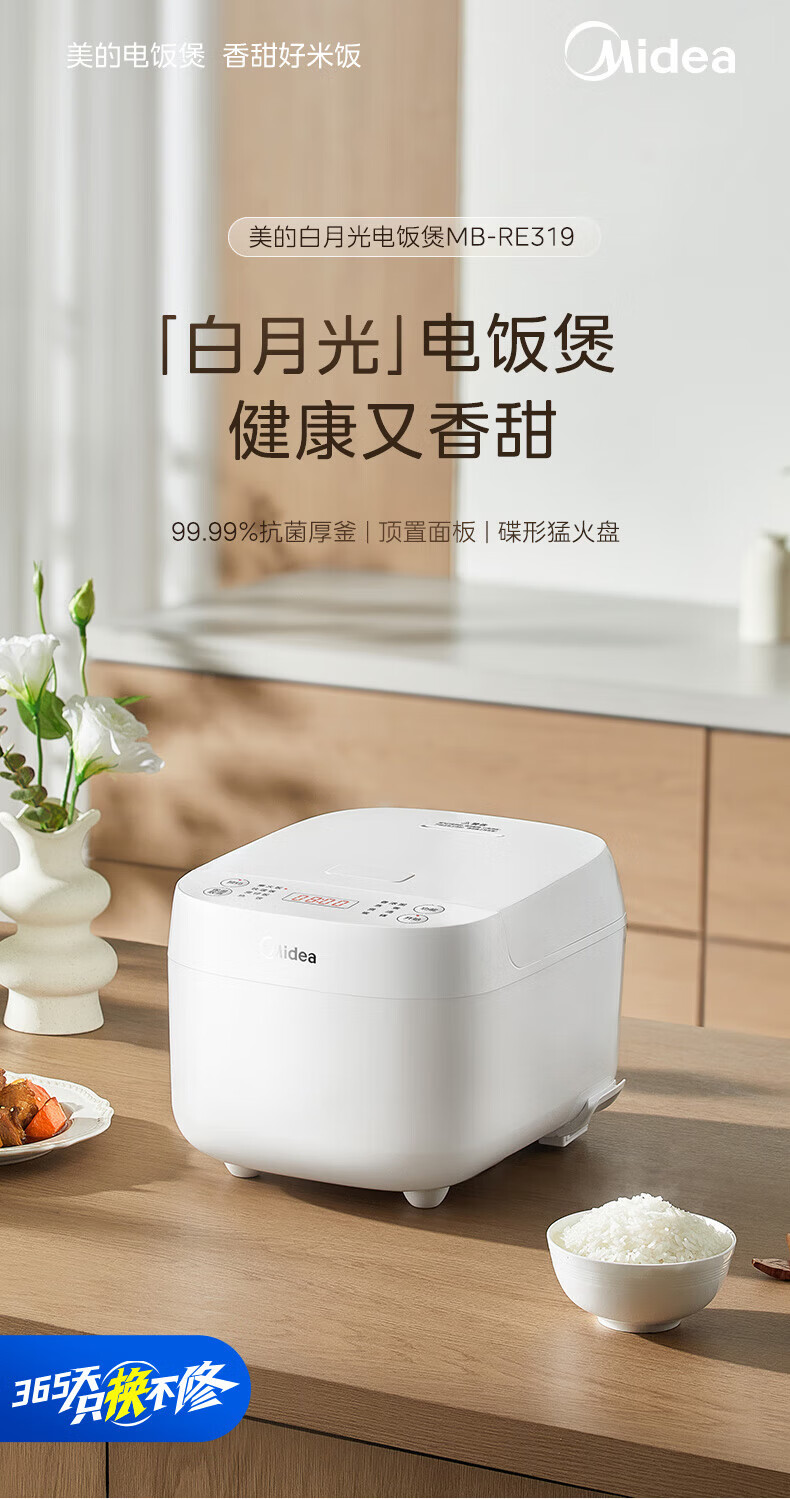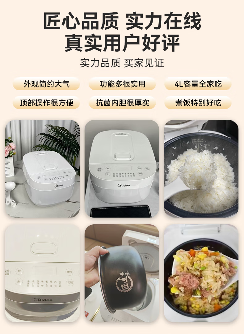 美的(Midea)电饭煲 家用智能预约多功能电饭锅 加厚抗菌内胆 快速饭 小米粥 迷你白月光电饭煲1-2-3-4人 【不粘内胆-顶置大面板】 4L