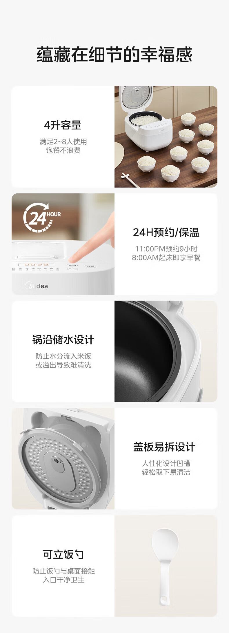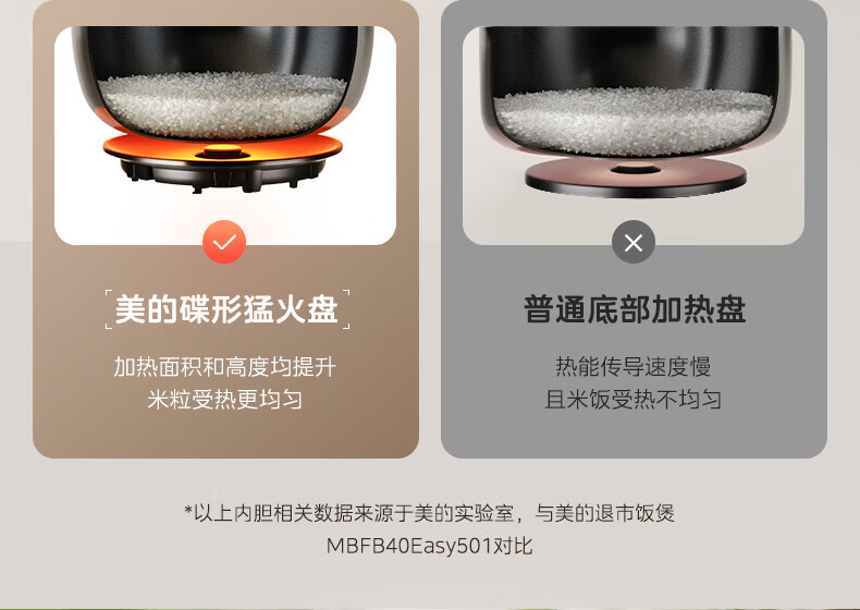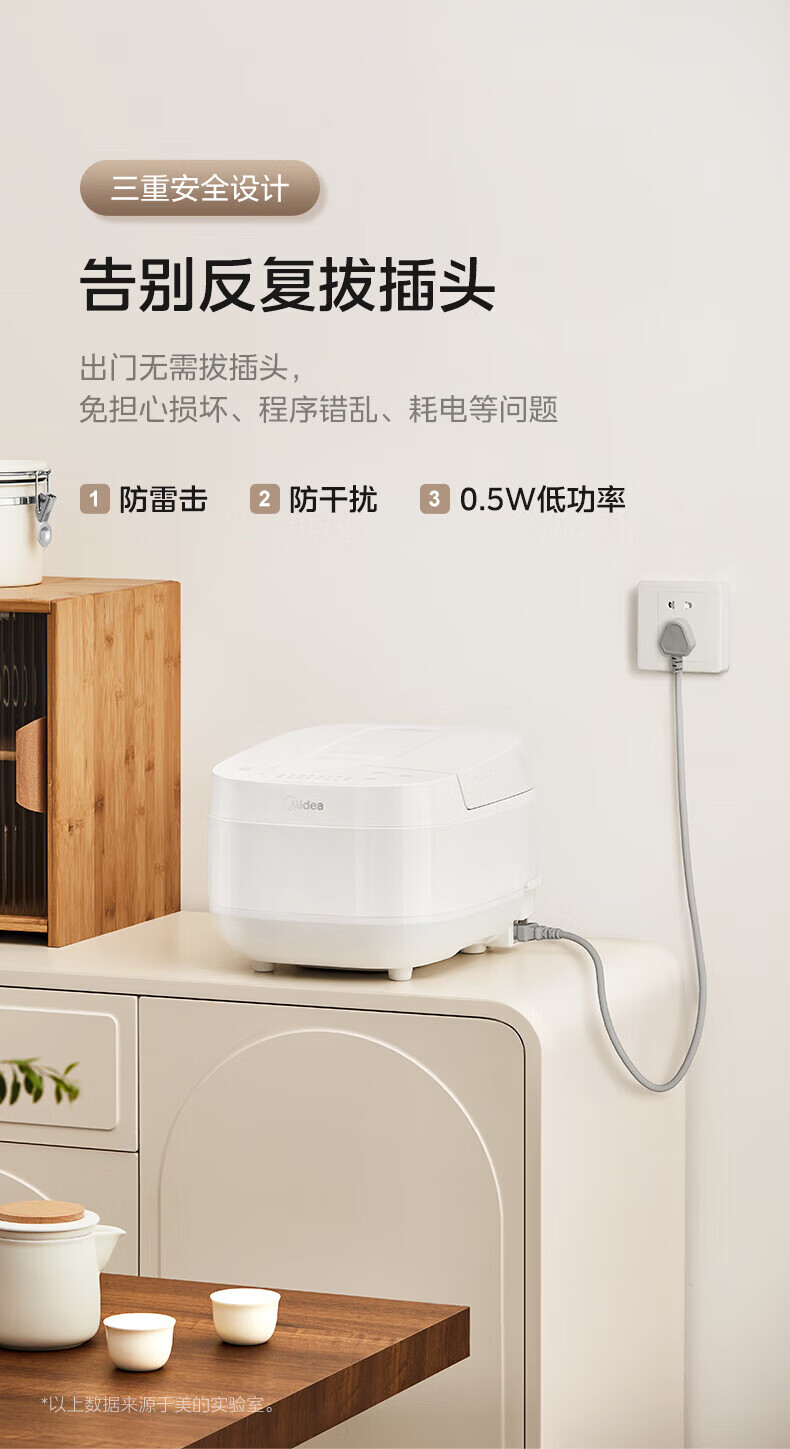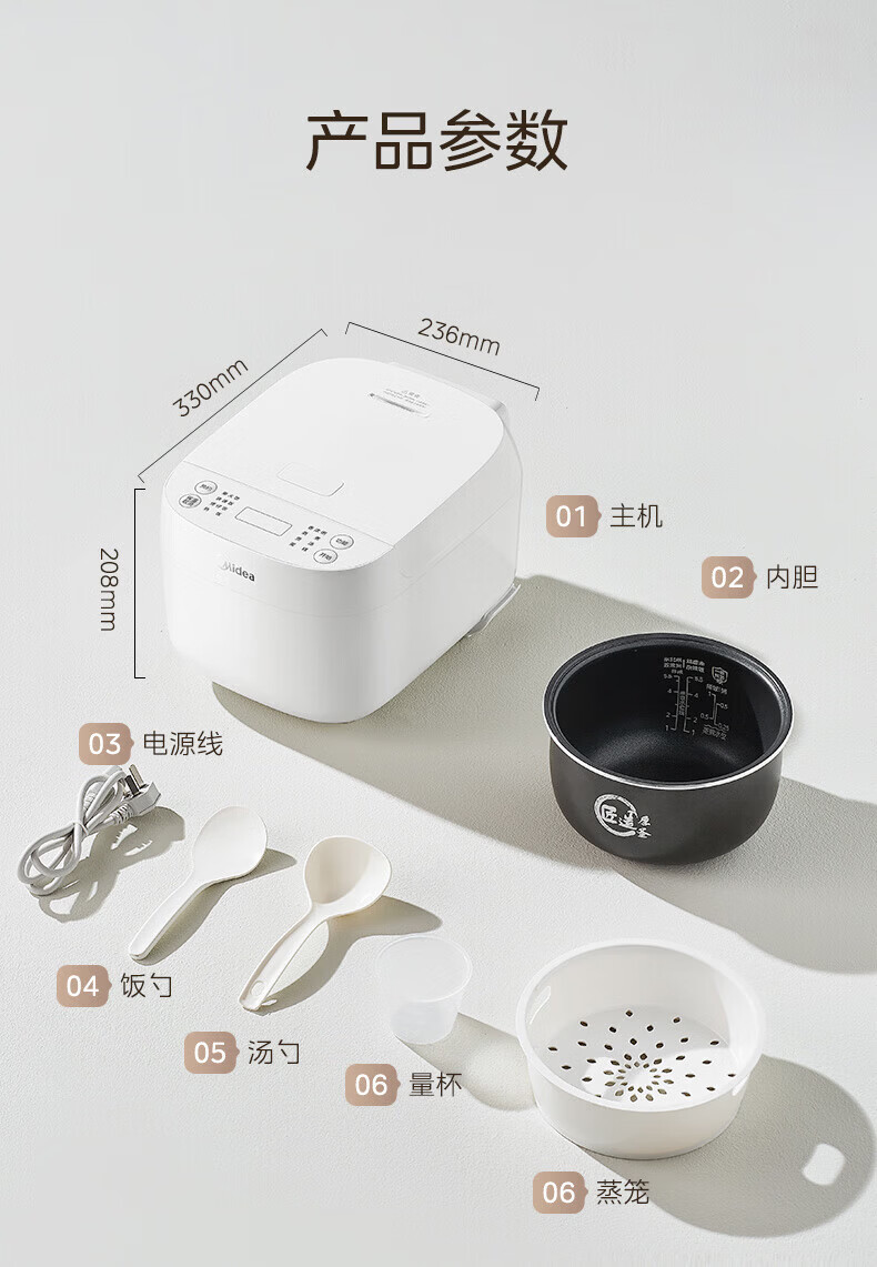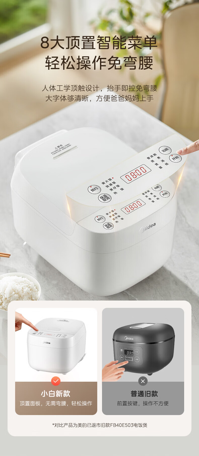 美的(Midea)电饭煲 家用智能预约多功能电饭锅 加厚抗菌内胆 快速饭 小米粥 迷你白月光电饭煲1-2-3-4人 【不粘内胆-顶置大面板】 4L