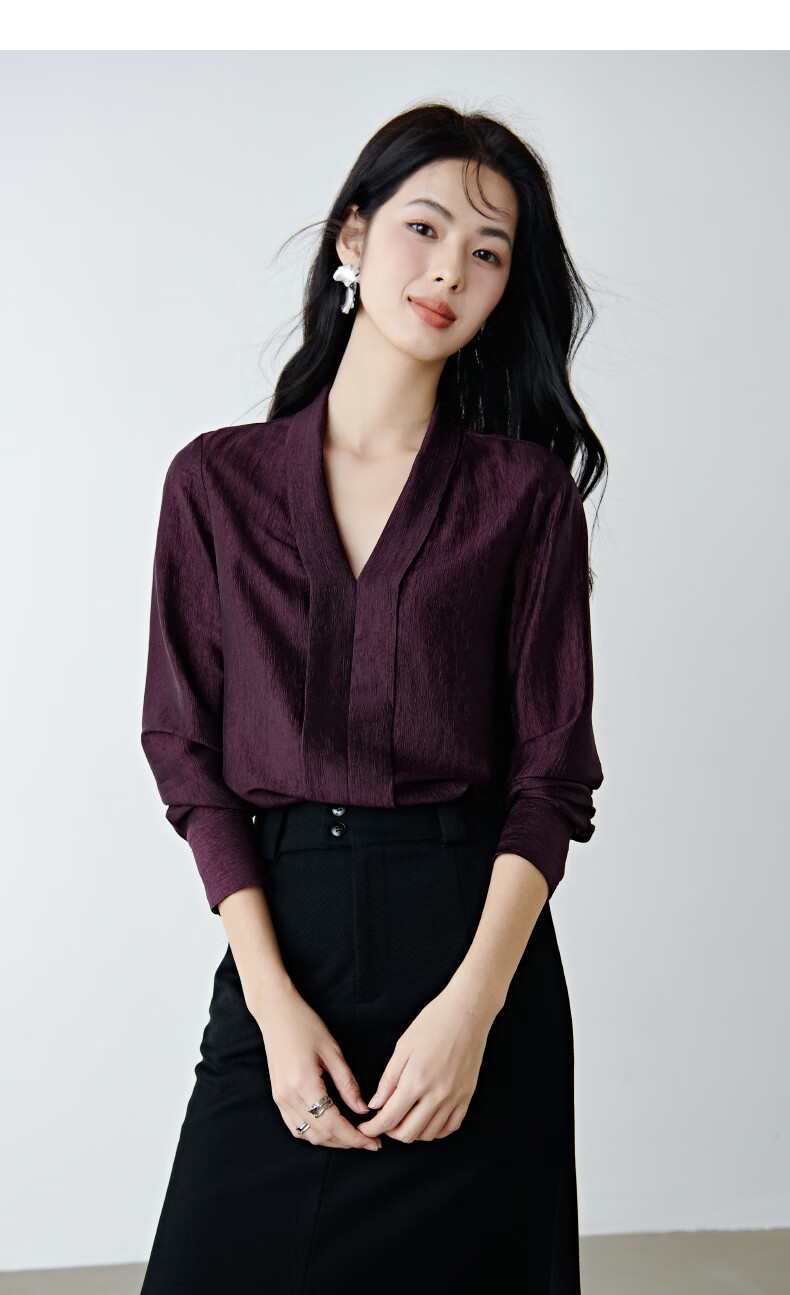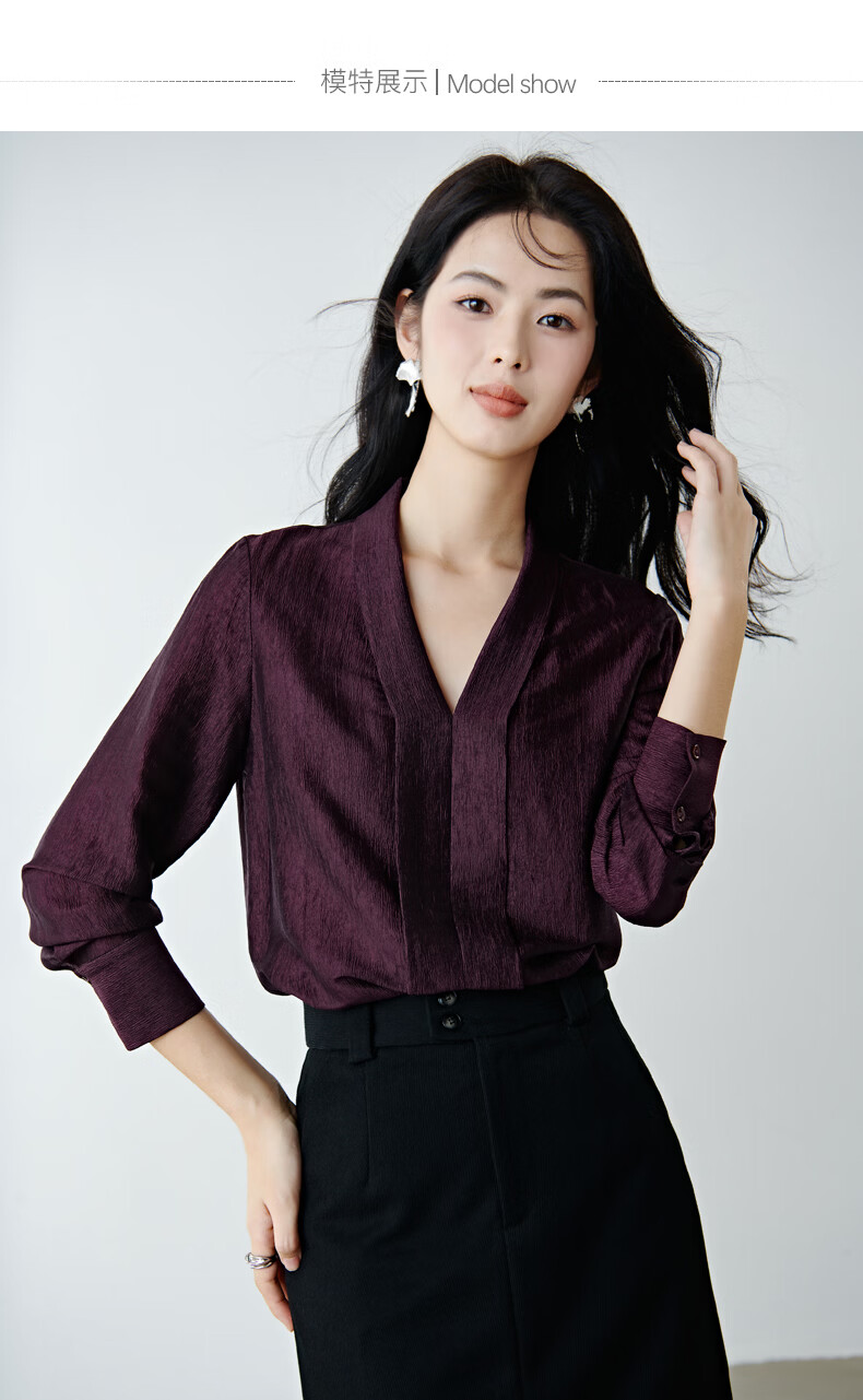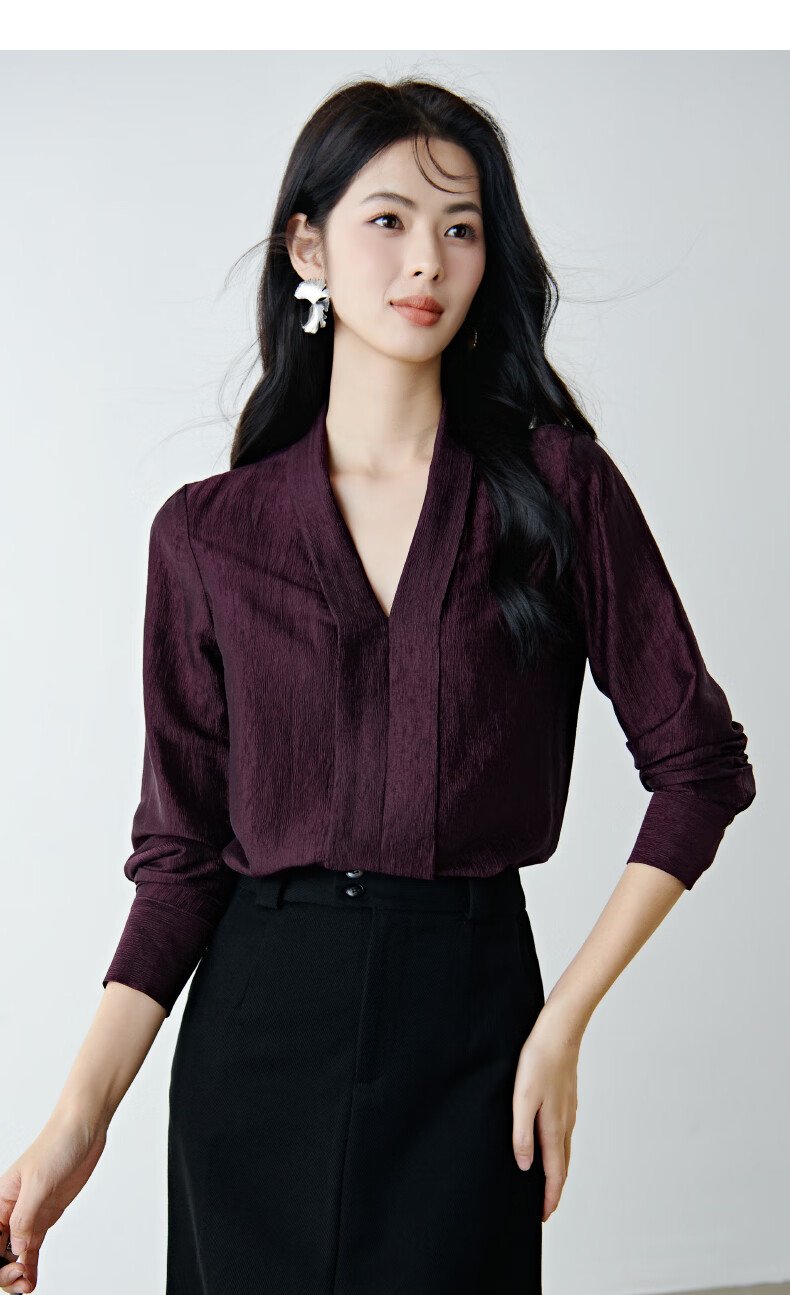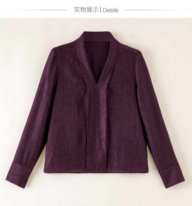晚白醋酸通勤百搭衬衫女2026春款知性优雅V领衬衣垂顺气质上衣 深紫色 L