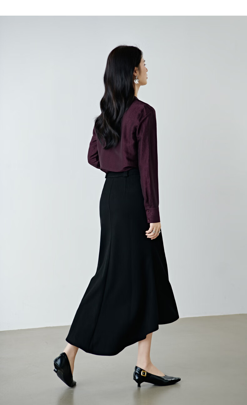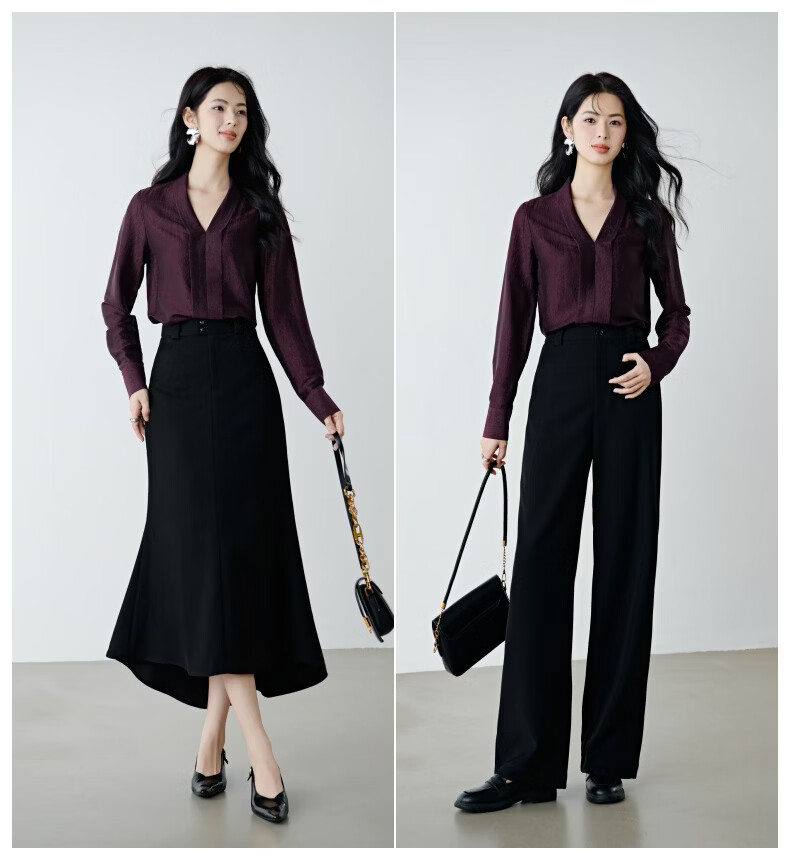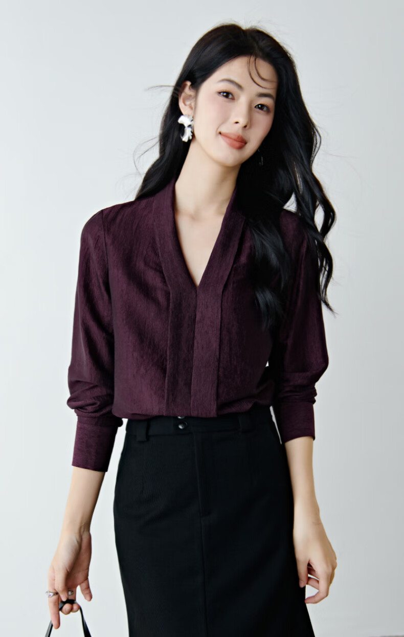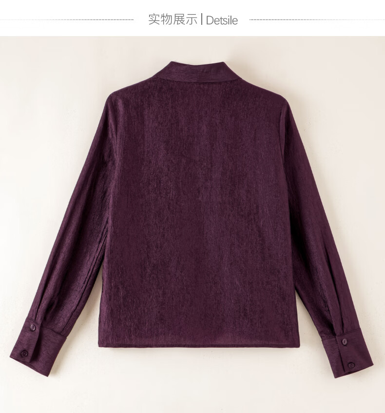 晚白醋酸通勤百搭衬衫女2026春款知性优雅V领衬衣垂顺气质上衣 深紫色 L