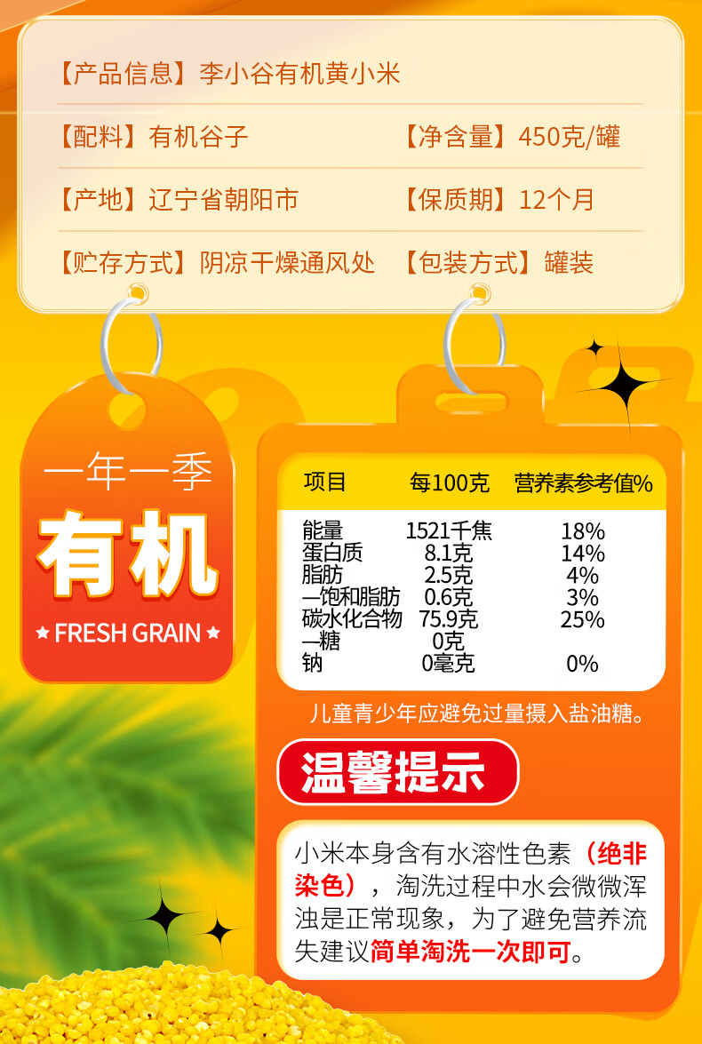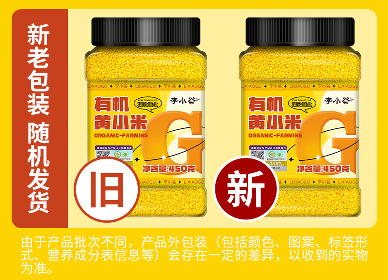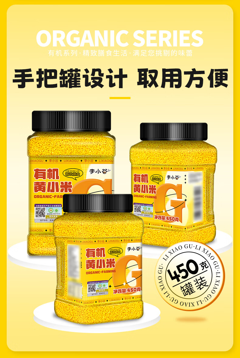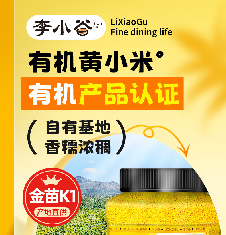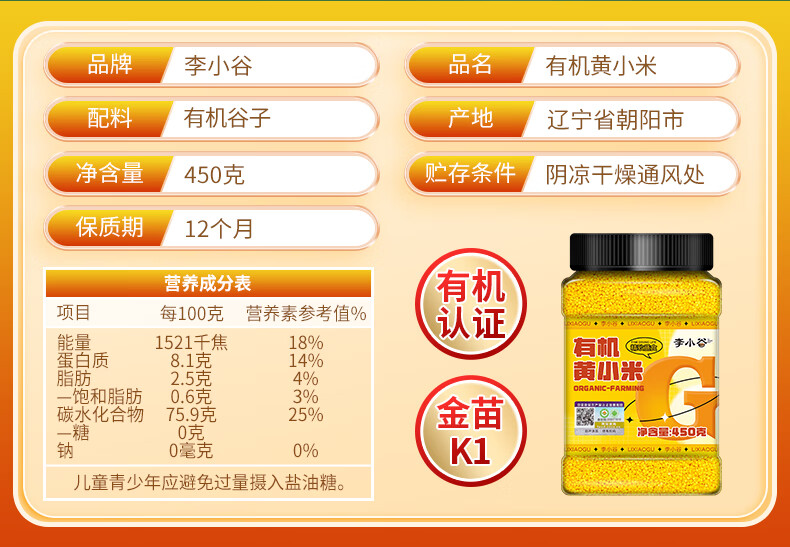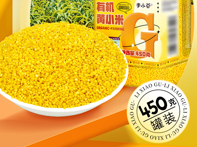 李小谷 有机黄小米450克罐装(新米金苗K1黄小米粥料东北小米五谷杂粮米)