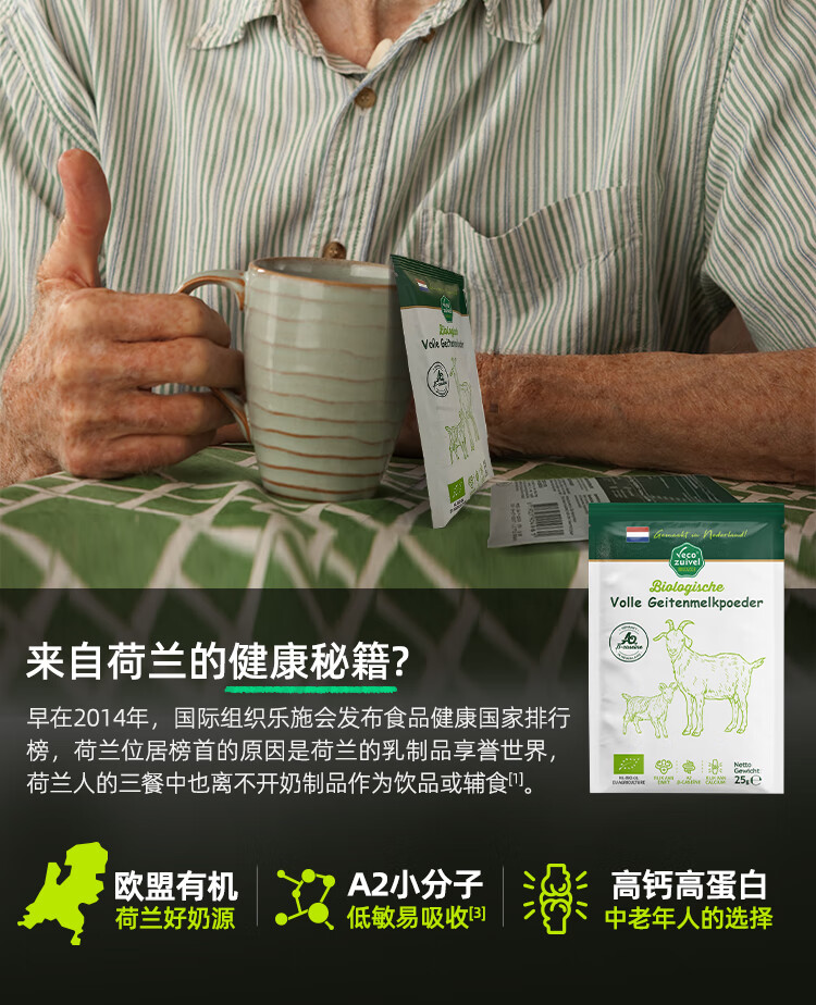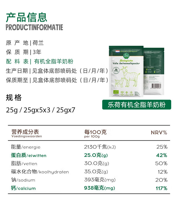 乐荷有机羊奶粉 荷兰原装进口 欧盟有机认证 高钙高蛋白 25g*7袋