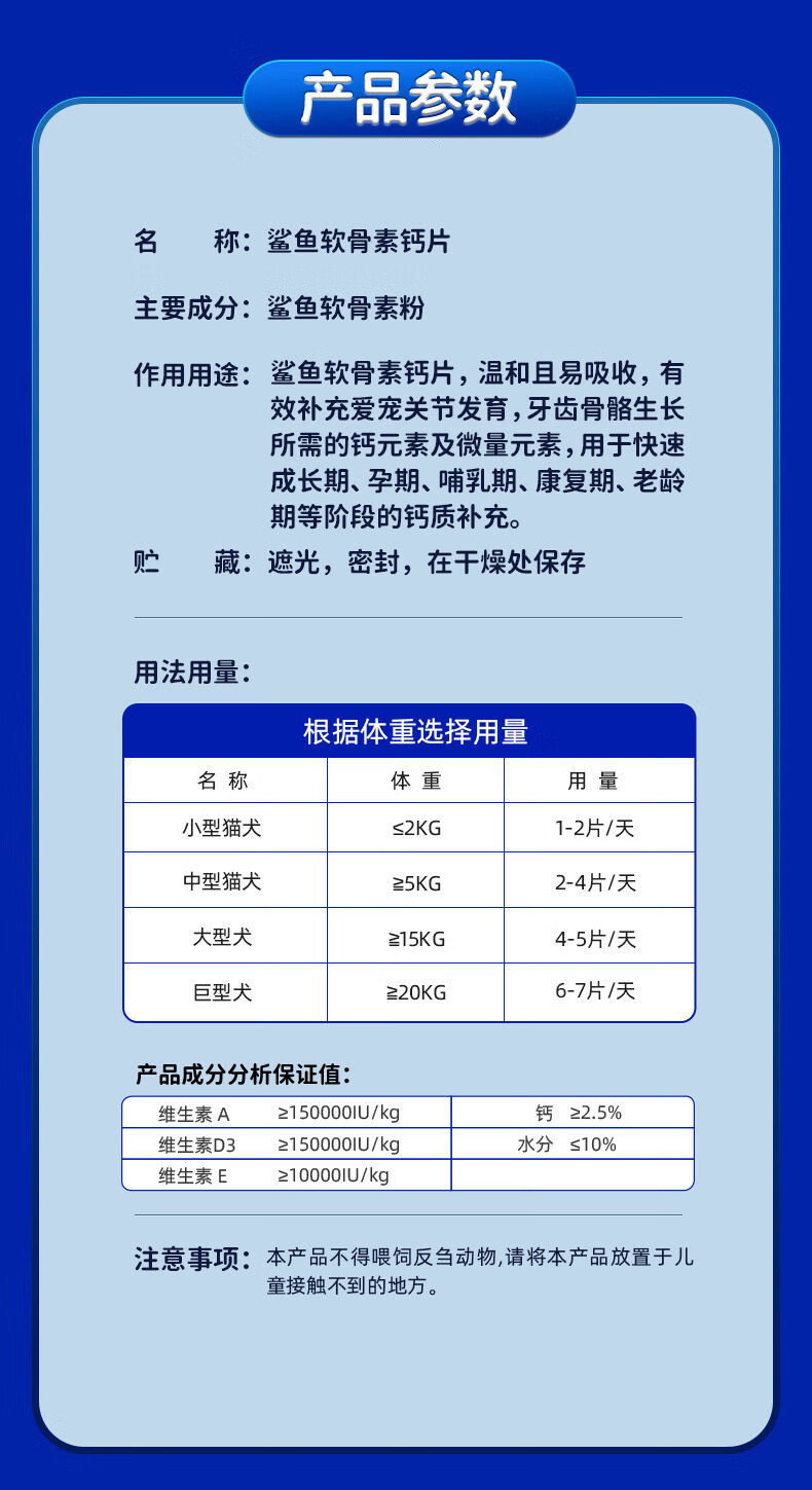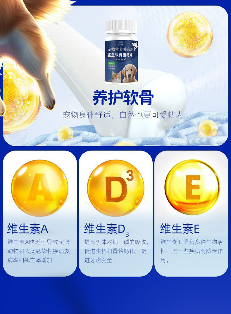 鲨鱼软骨素狗狗钙片宠物专用关节补钙泰迪金毛猫咪犬用营养补充剂 200片*1瓶