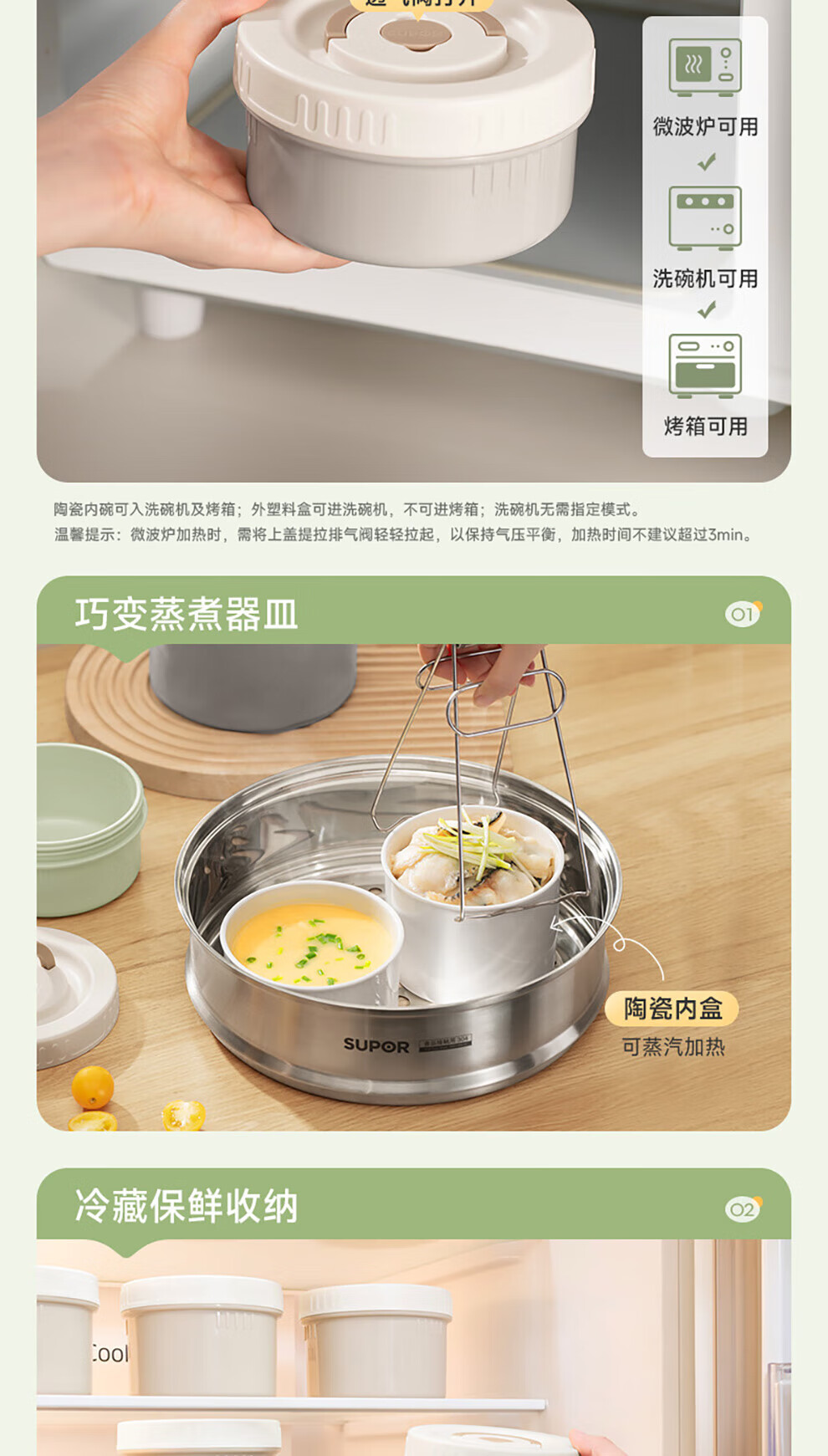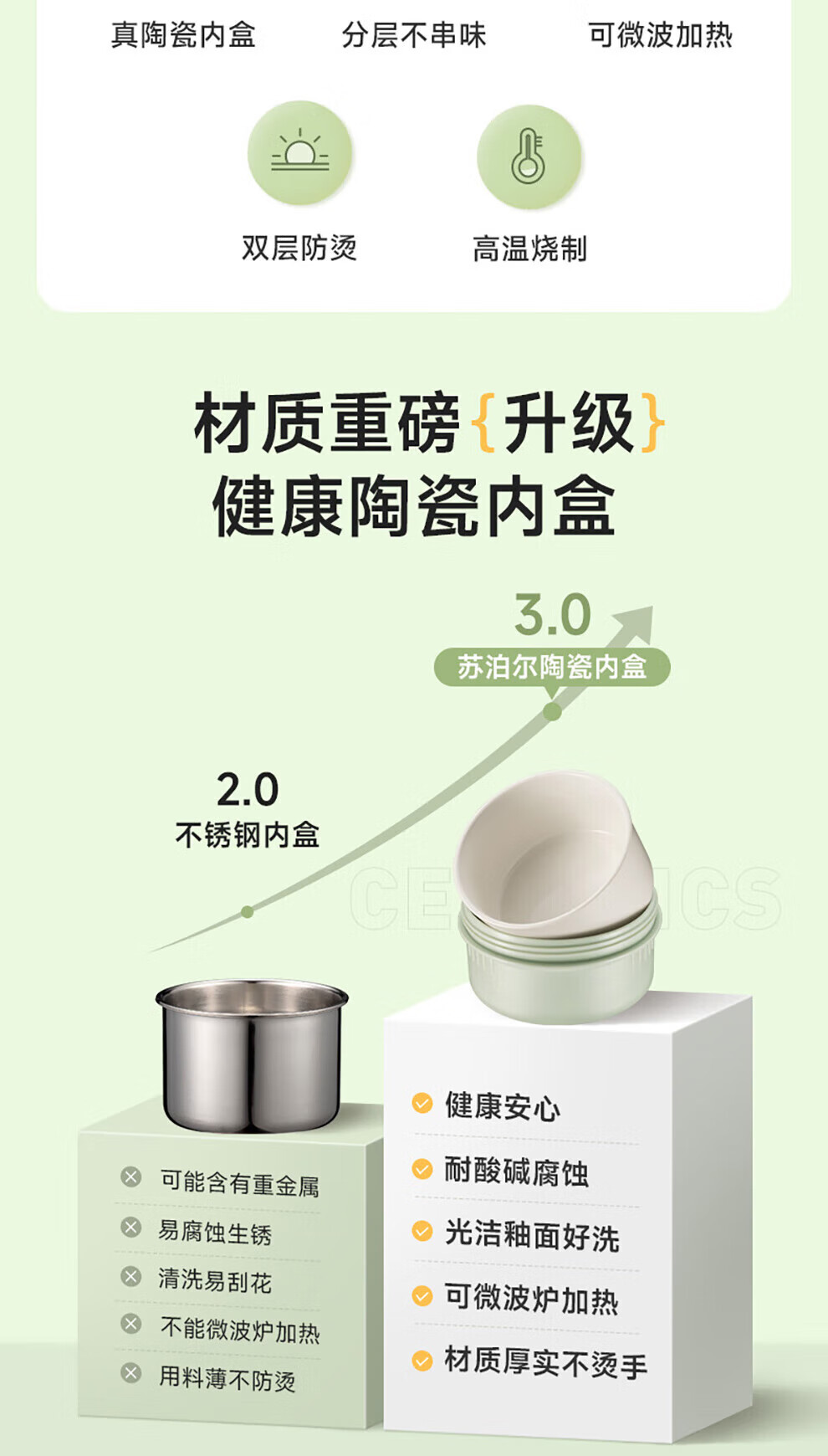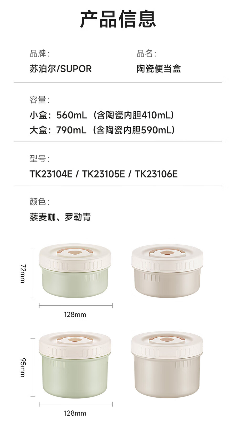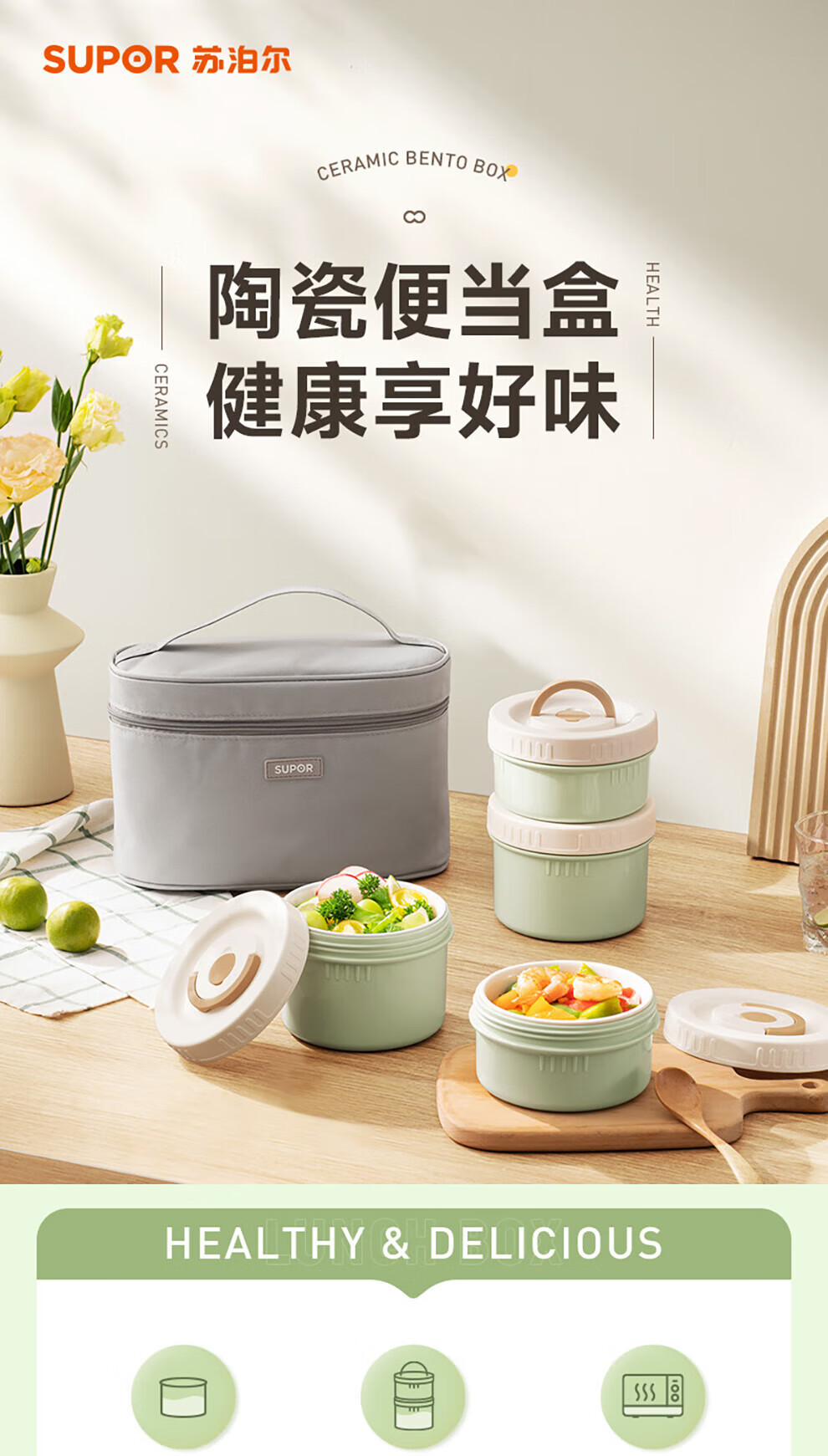 苏泊尔(SUPOR)陶瓷保温饭盒上班族2026新款学生便携便当餐盒可微波炉 罗勒青【可微波加热】1层560ml
