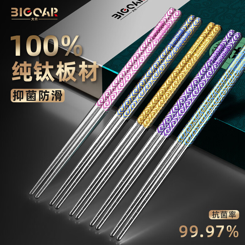 大卡纯钛筷子抗菌防霉高级筷子套装家用高档钛质筷子健康金属筷防滑筷 彩色纯钛筷子礼盒装 紫金青 3双