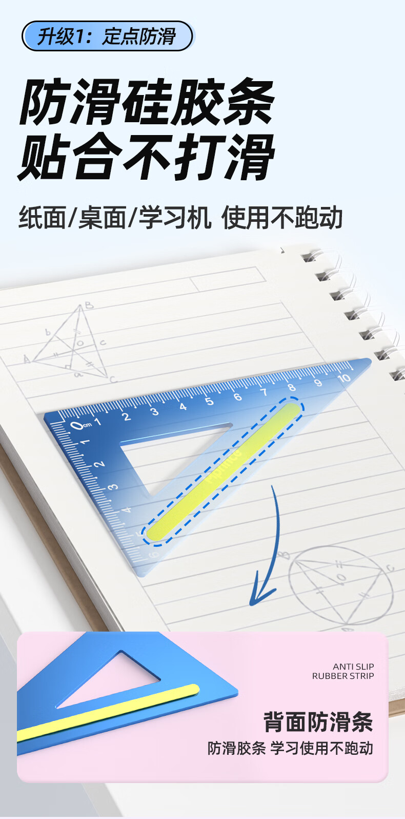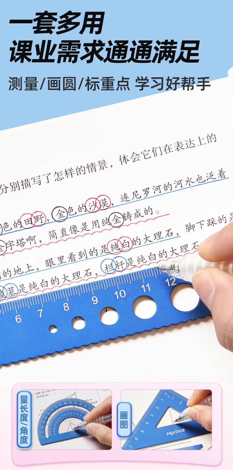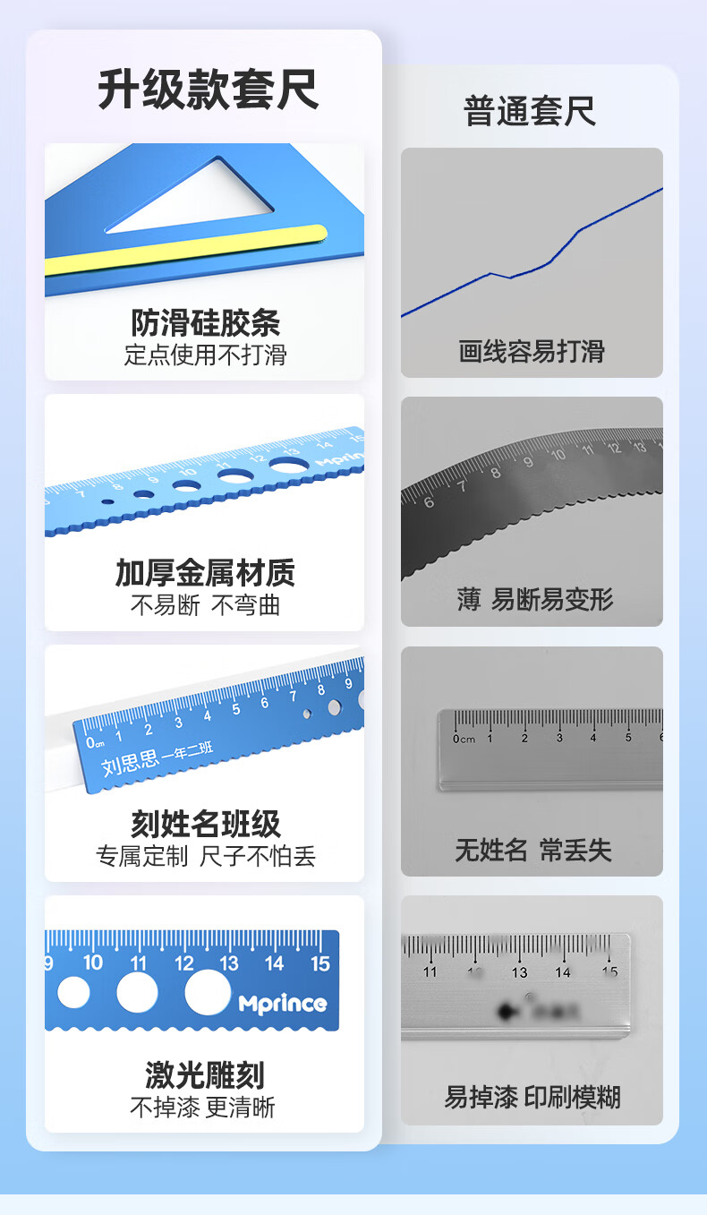 猫太子金属学生考试绘图套尺20cm波浪边直尺/三角尺/量角器儿童尺子学习文具套装 四件套 铝合金套尺(4件套)15CM 雅典蓝