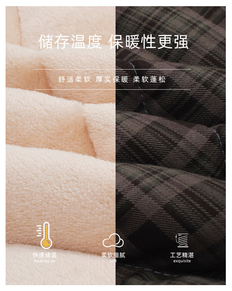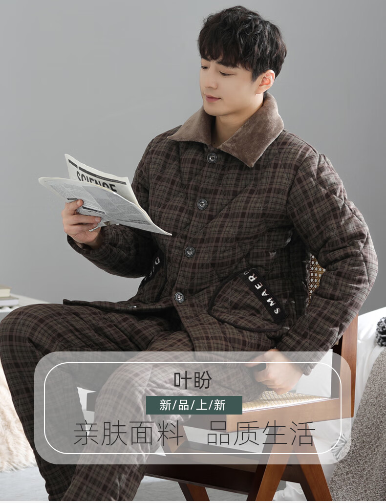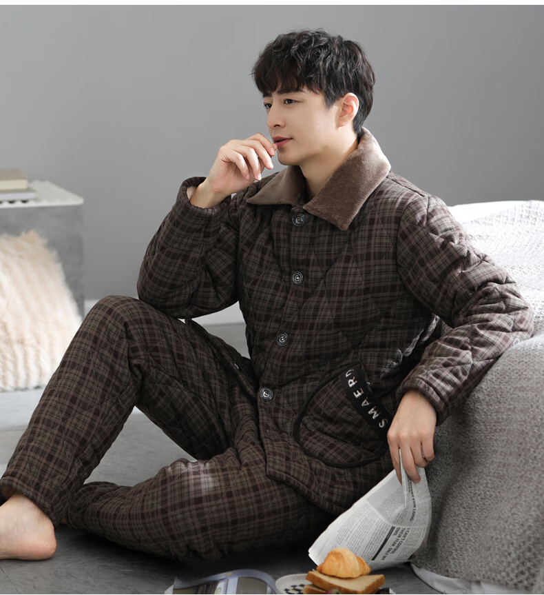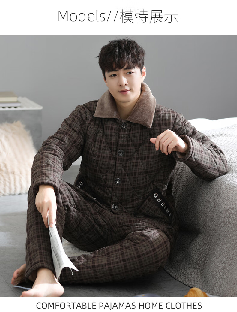叶盼(yepan)【保暖】梭织纯棉睡衣男士冬季三层夹棉加绒加厚法兰绒家居服套装 68010-铁黑 L (170) :建议120-140斤穿着