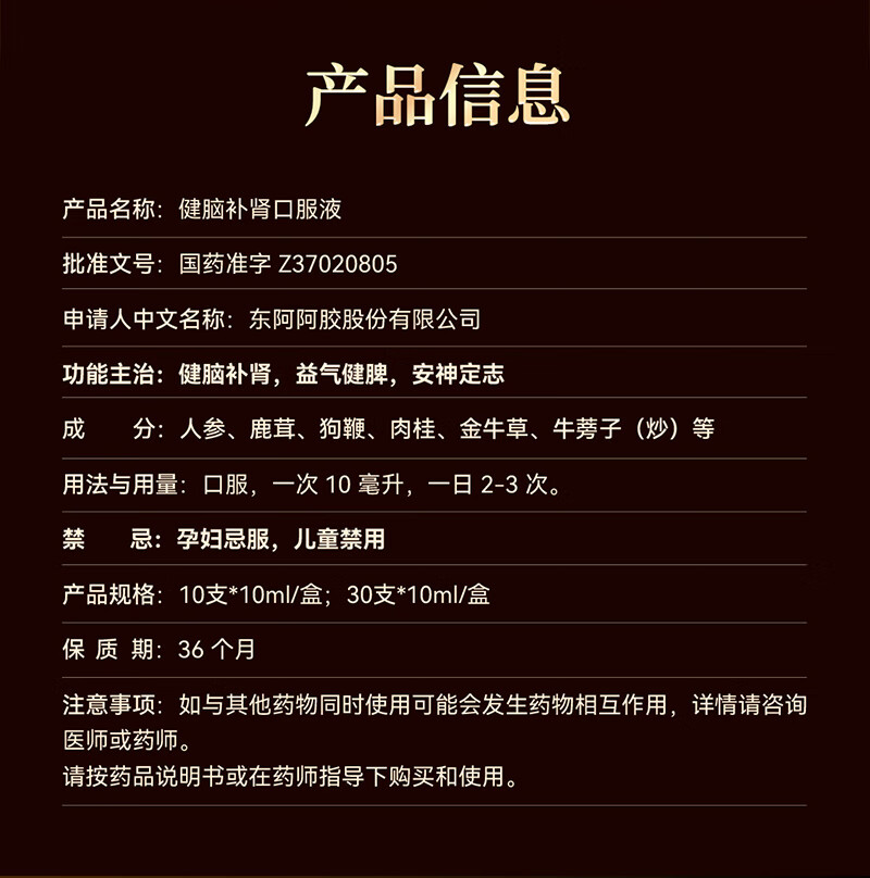 东阿阿胶 健脑补肾口服液 10ml*30支/盒 安神补脑液 男科用药 皇家围场 益气健脾 用于健忘失眠 头晕耳鸣